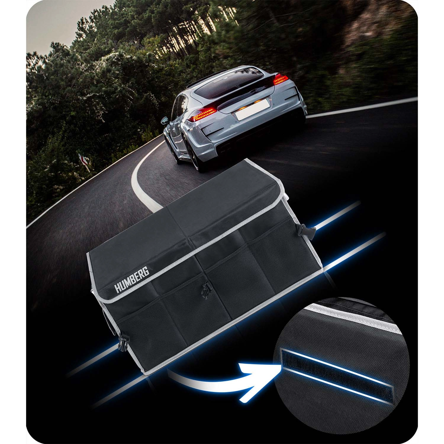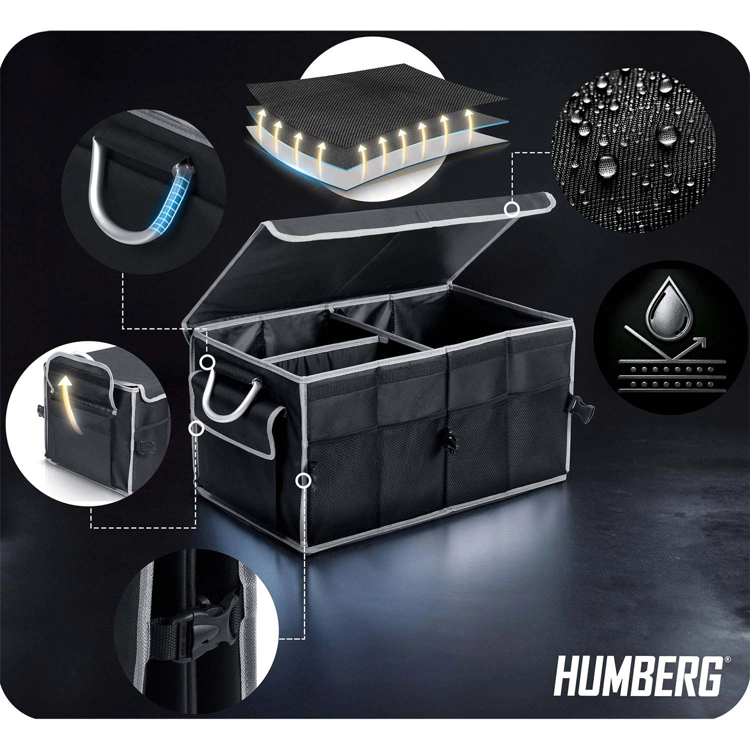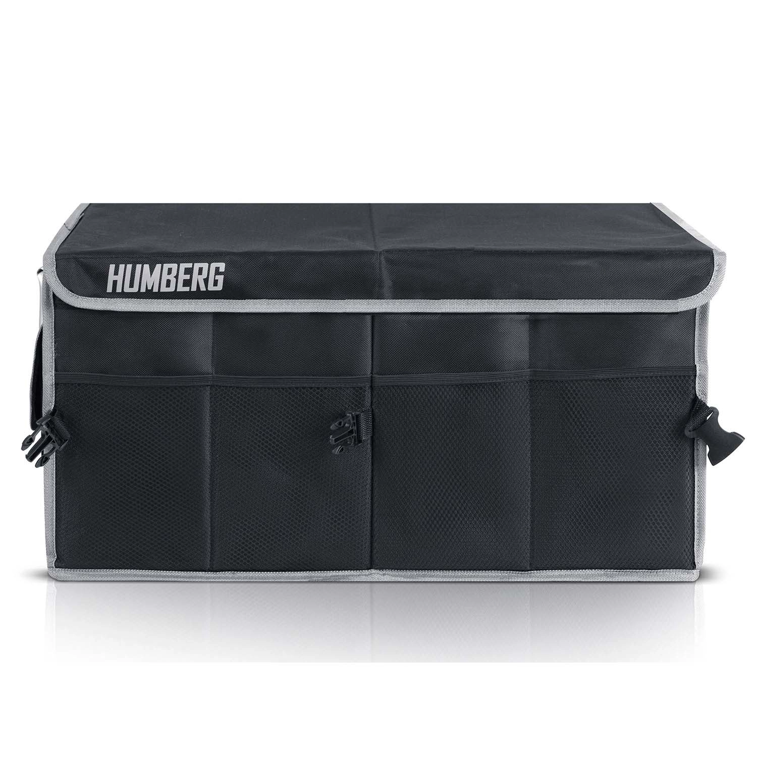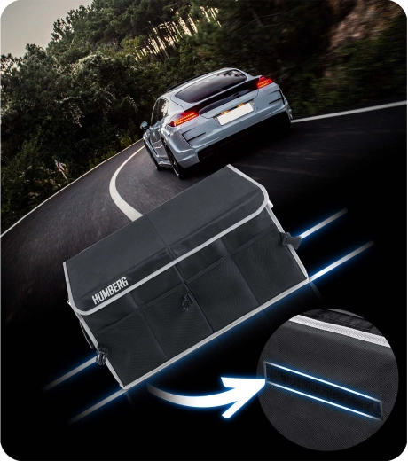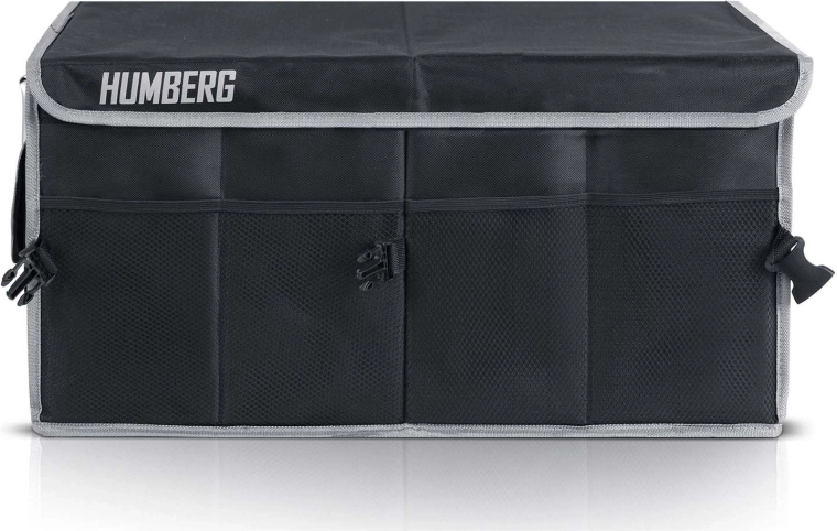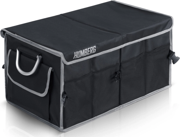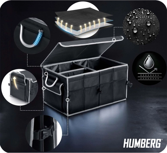 Udržte pořádek v autě jednou provždy. Tento skládací organizér do kufru HUMBERG nabízí dvě prostorné komory s pohyblivou přepážkou, odnímatelné víko pro ochranu obsahu, pevné zpevněné stěny a dno a voděodolný, snadno čistitelný materiál. Díky hliníkovým madlům, vnějším síťovaným kapsám a protiskluzovým páskům na suchý zip zůstane náklad bezpečně na místě bez nepořádku.