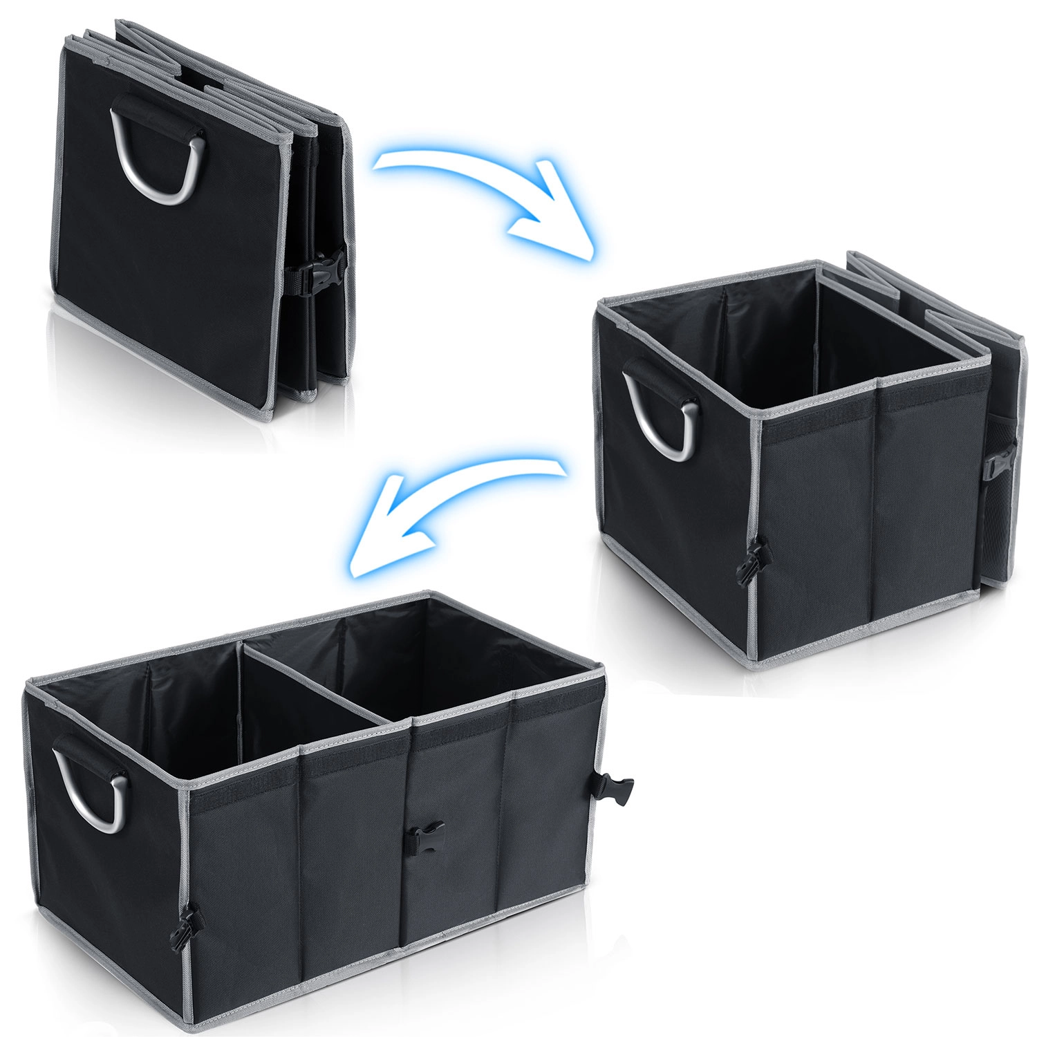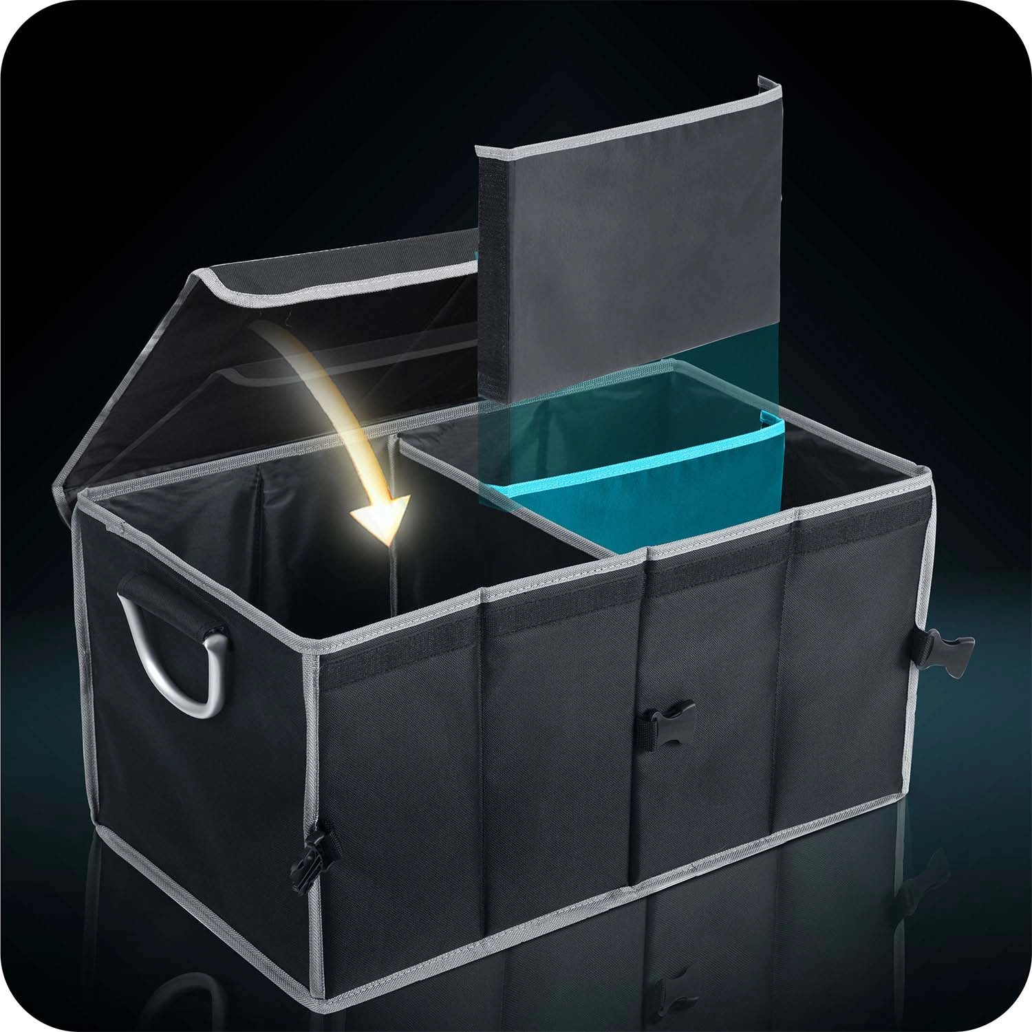 Přizpůsobte si prostor svým potřebám. Použijte jednu nebo dvě komory, přepážku snadno přemístíte či vyjmete a po použití organizér složíte naplocho.