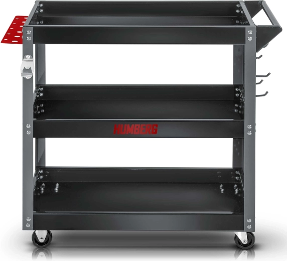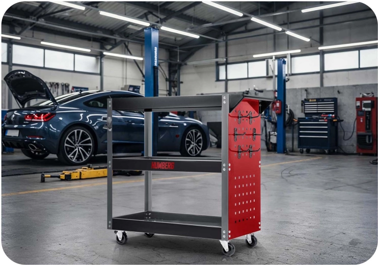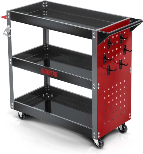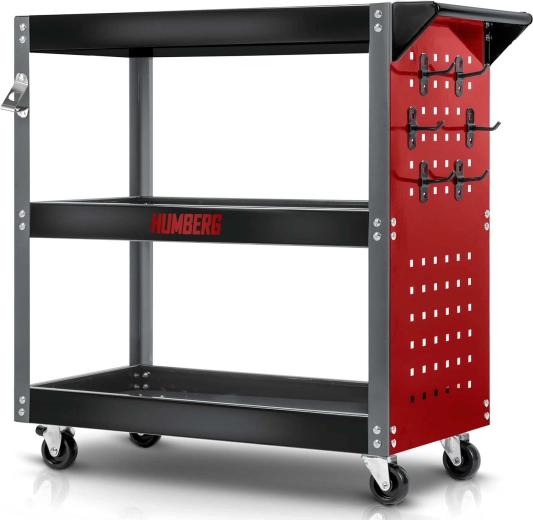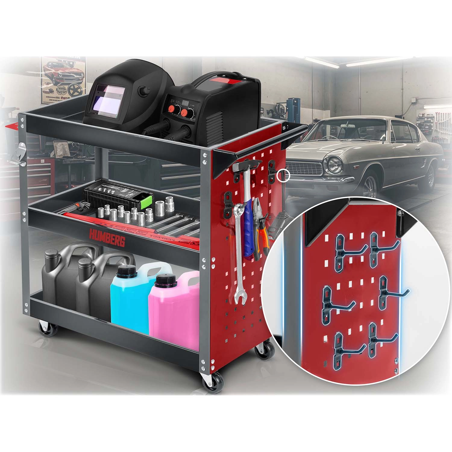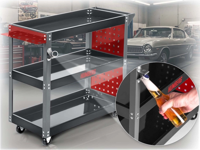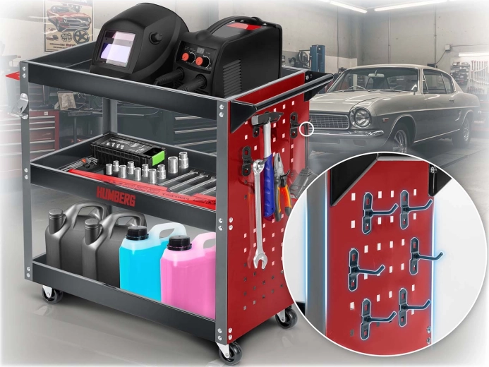 Vozík HUMBERG je navržen pro náročné dílenské prostředí. Kombinuje nerezovou ocel a hliník pro vysokou odolnost a dlouhou životnost. Tři hluboké police poskytují dostatek prostoru pro nářadí, díly i příslušenství, zatímco perforované boční panely s háčky udrží často používané nástroje vždy po ruce.