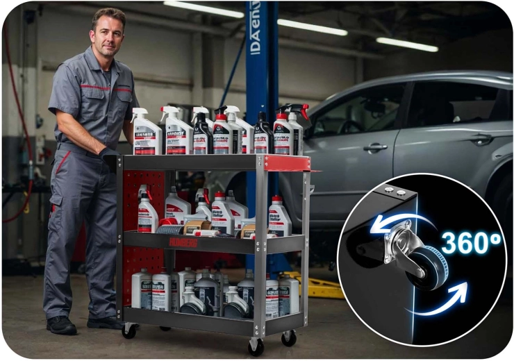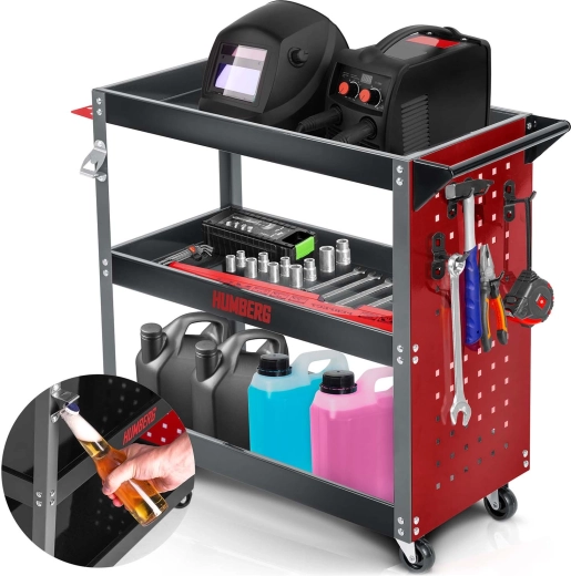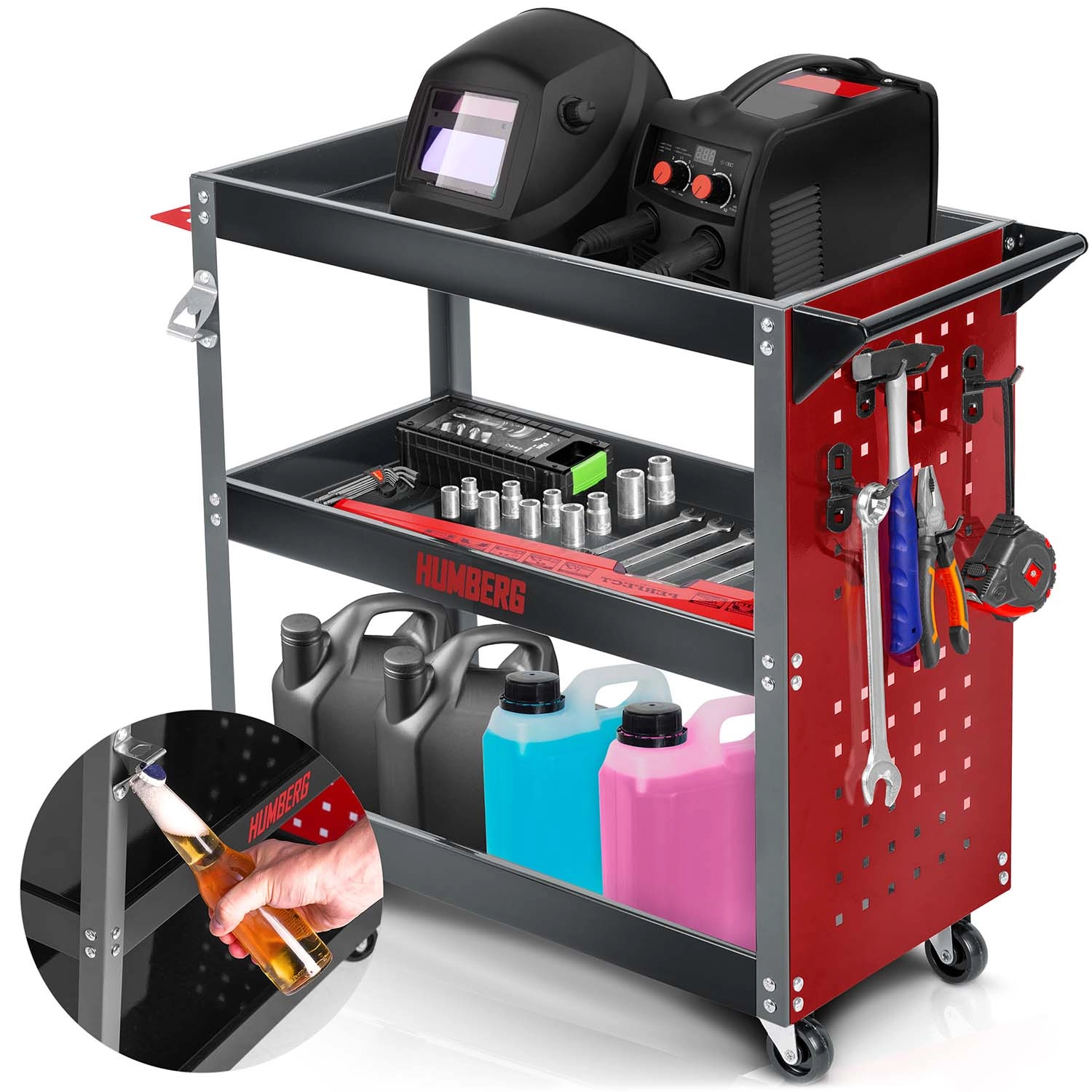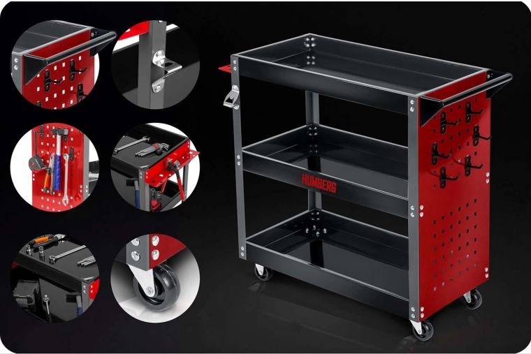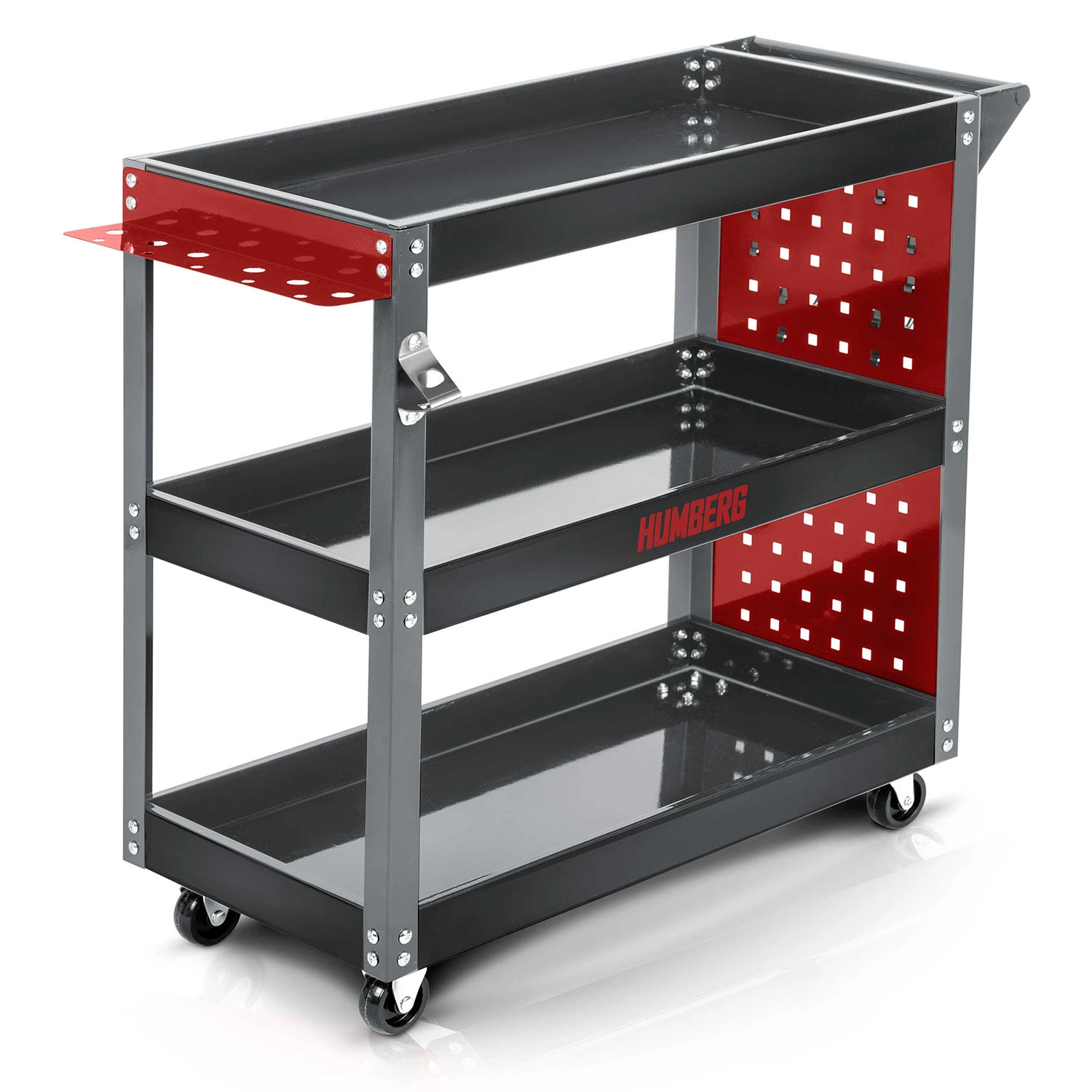 Vozík HUMBERG je navržen pro náročné dílenské prostředí. Kombinuje nerezovou ocel a hliník pro vysokou odolnost a dlouhou životnost. Tři hluboké police poskytují dostatek prostoru pro nářadí, díly i příslušenství, zatímco perforované boční panely s háčky udrží často používané nástroje vždy po ruce.