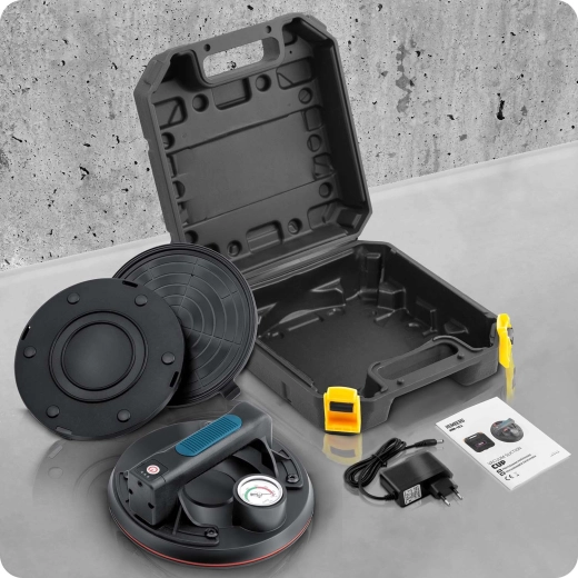 Vestavěná Li-ion baterie 2400 mAh umožňuje až 8 h nepřetržitého provozu, přičemž plné nabití trvá jen 2 hodiny. Přísavka je dodávána v praktickém kufříku se vším potřebným příslušenstvím pro profesionální použití v montáži i dopravě materiálu.