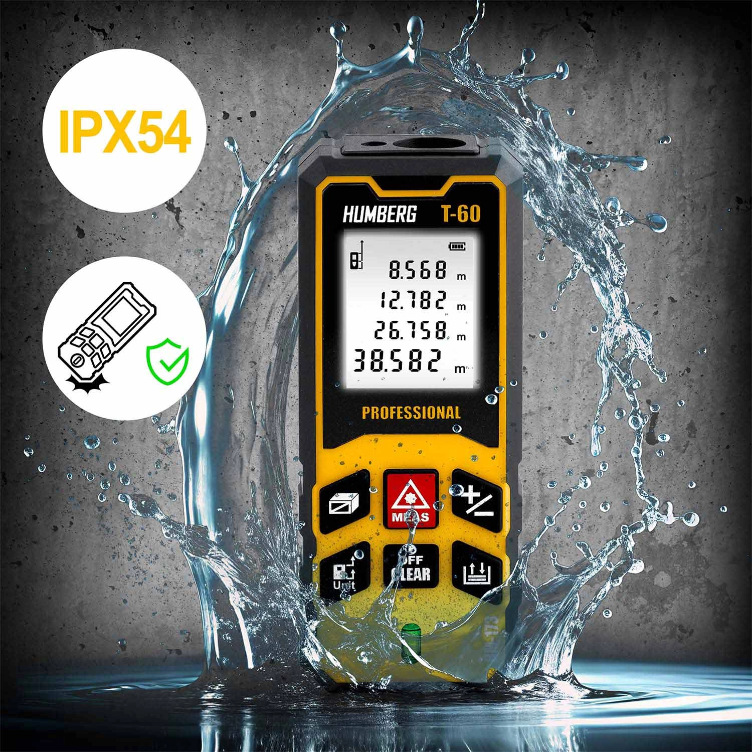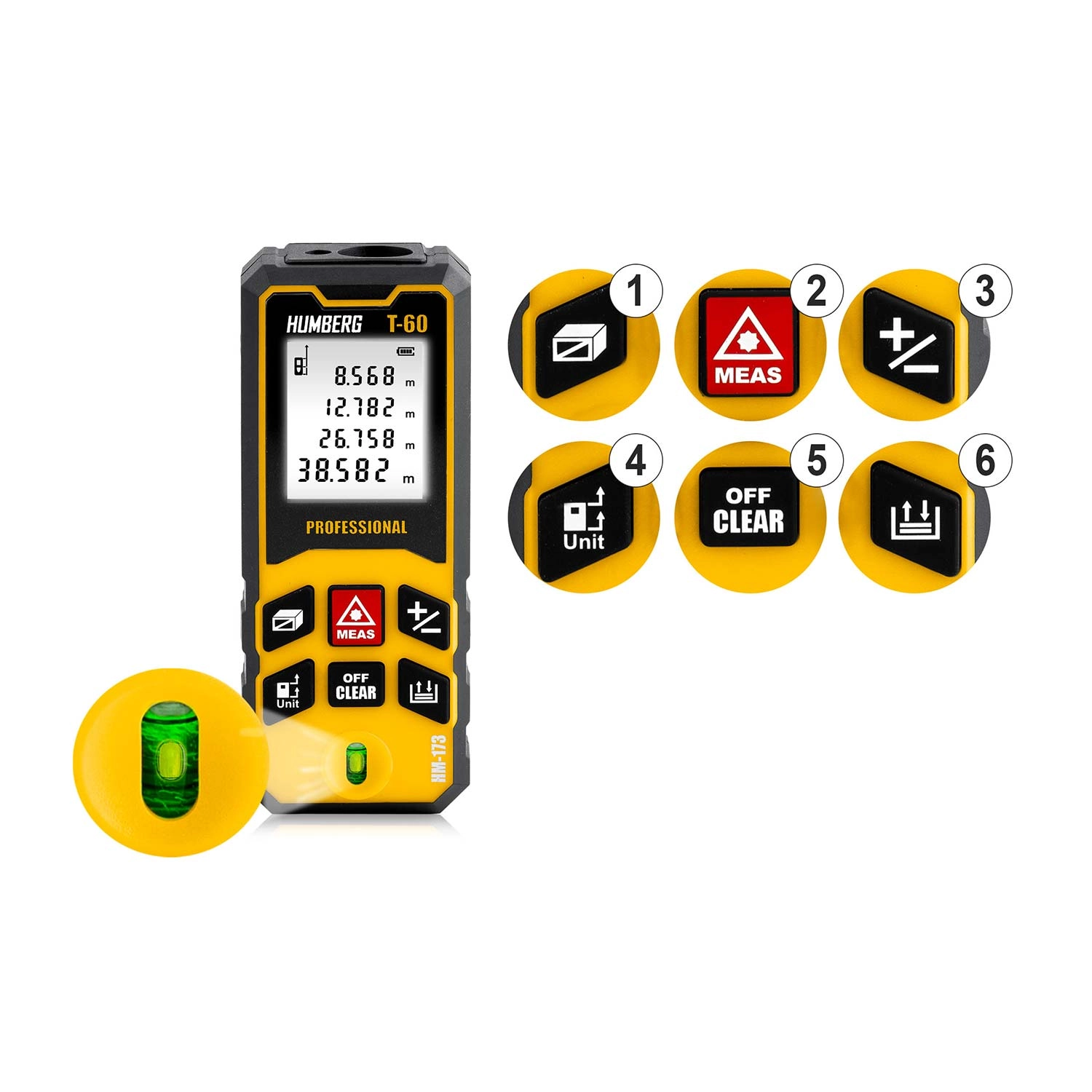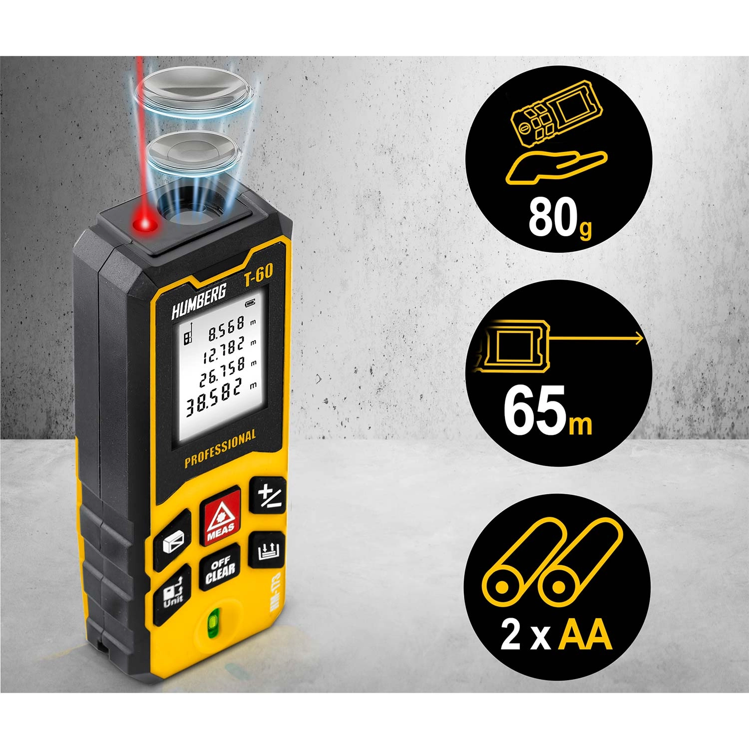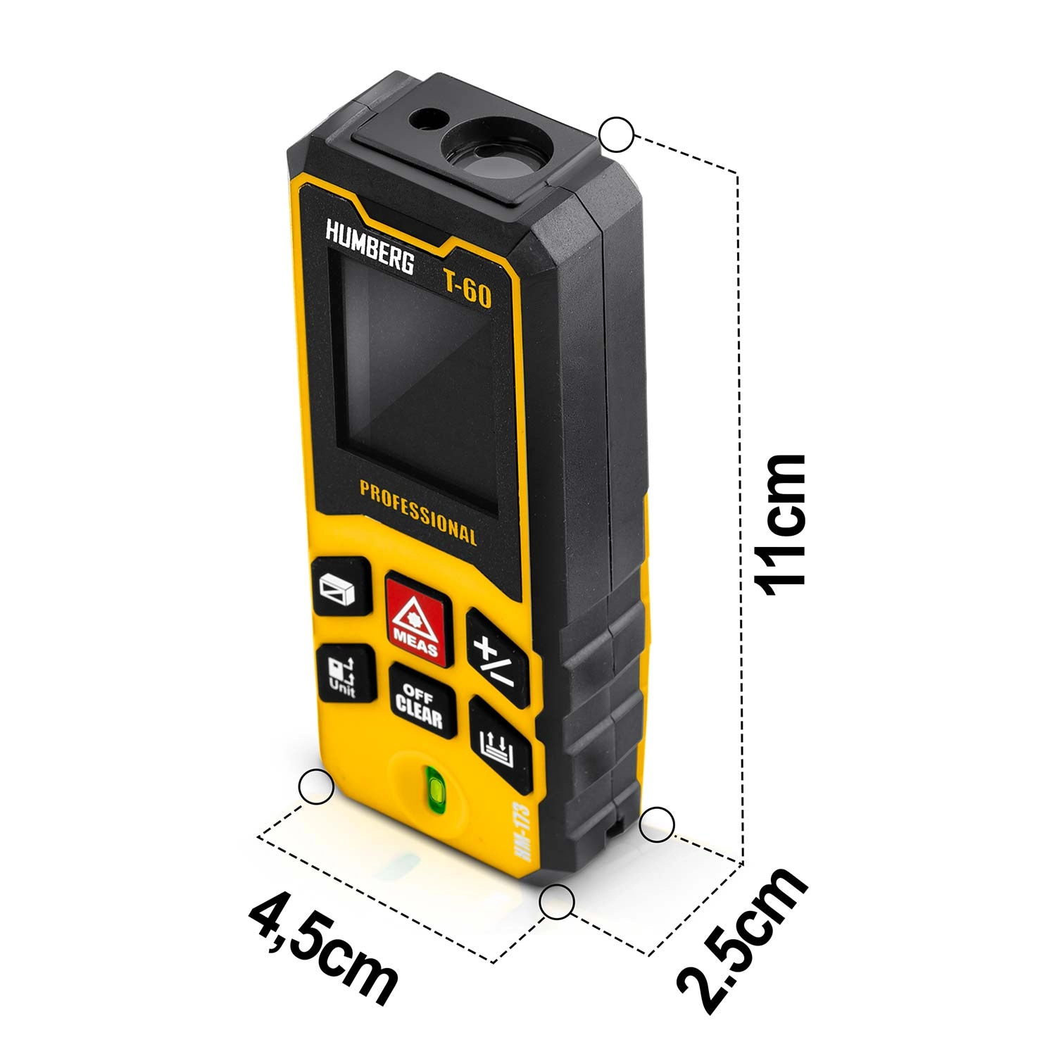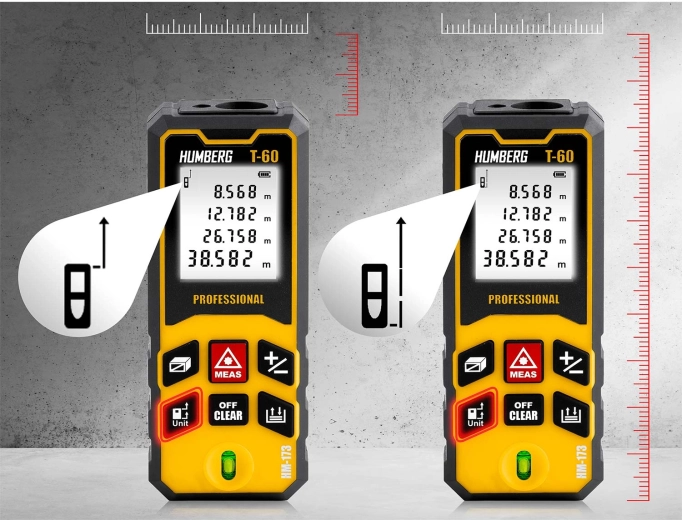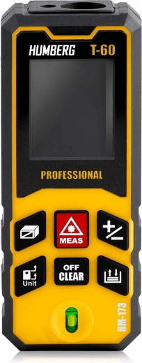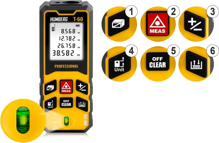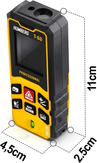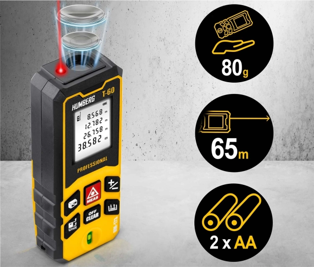 Kompaktní a přesný laserový dálkoměr HUMBERG T-60 s dosahem až 60 m (max. 65 m) pro profesionální i domácí použití. Nabízí přesnost ±1,5 mm, měření plochy a objemu, funkci Pythagora, kontinuální měření a paměť výsledků. Díky IPX54, vestavěné libele a automatickému vypnutí je ideální na stavbu, při rekonstrukcích i v terénu.