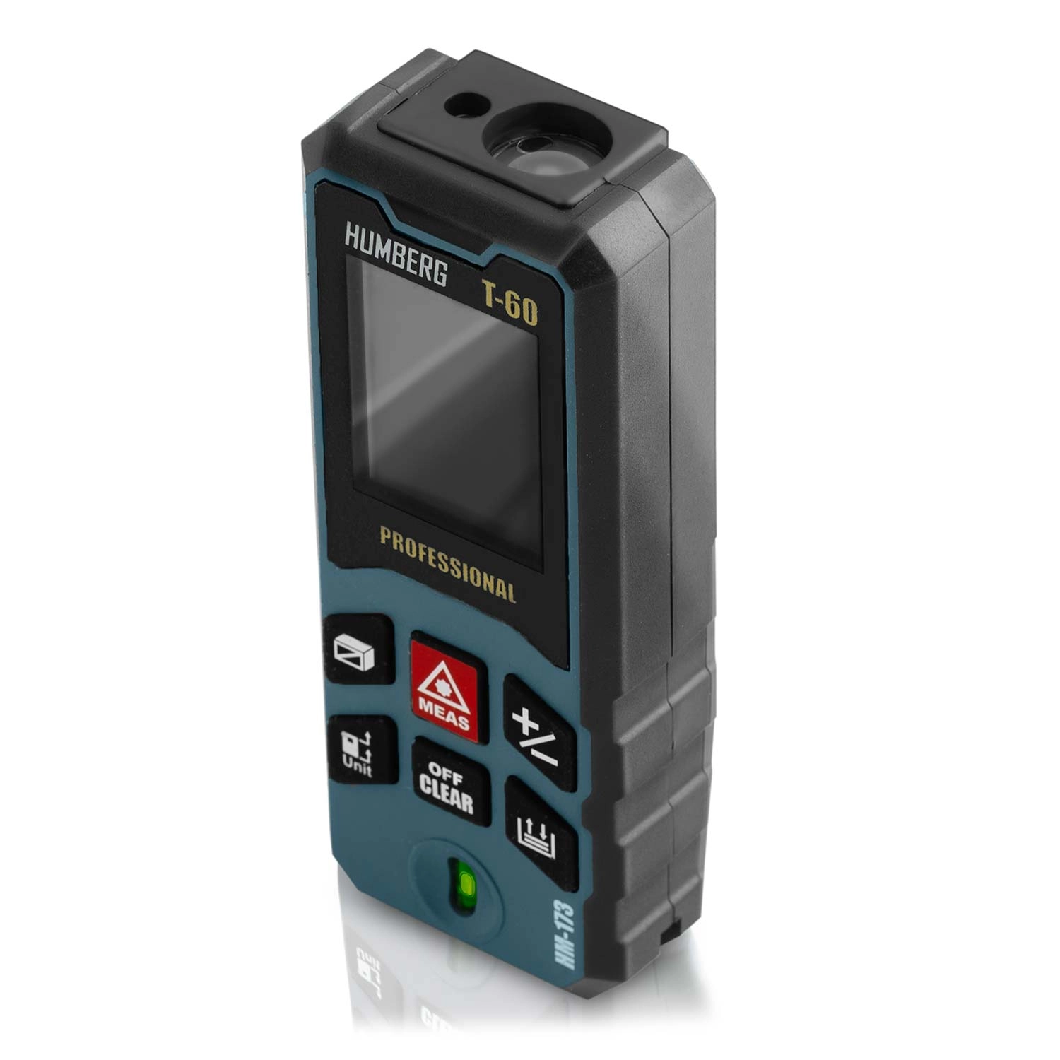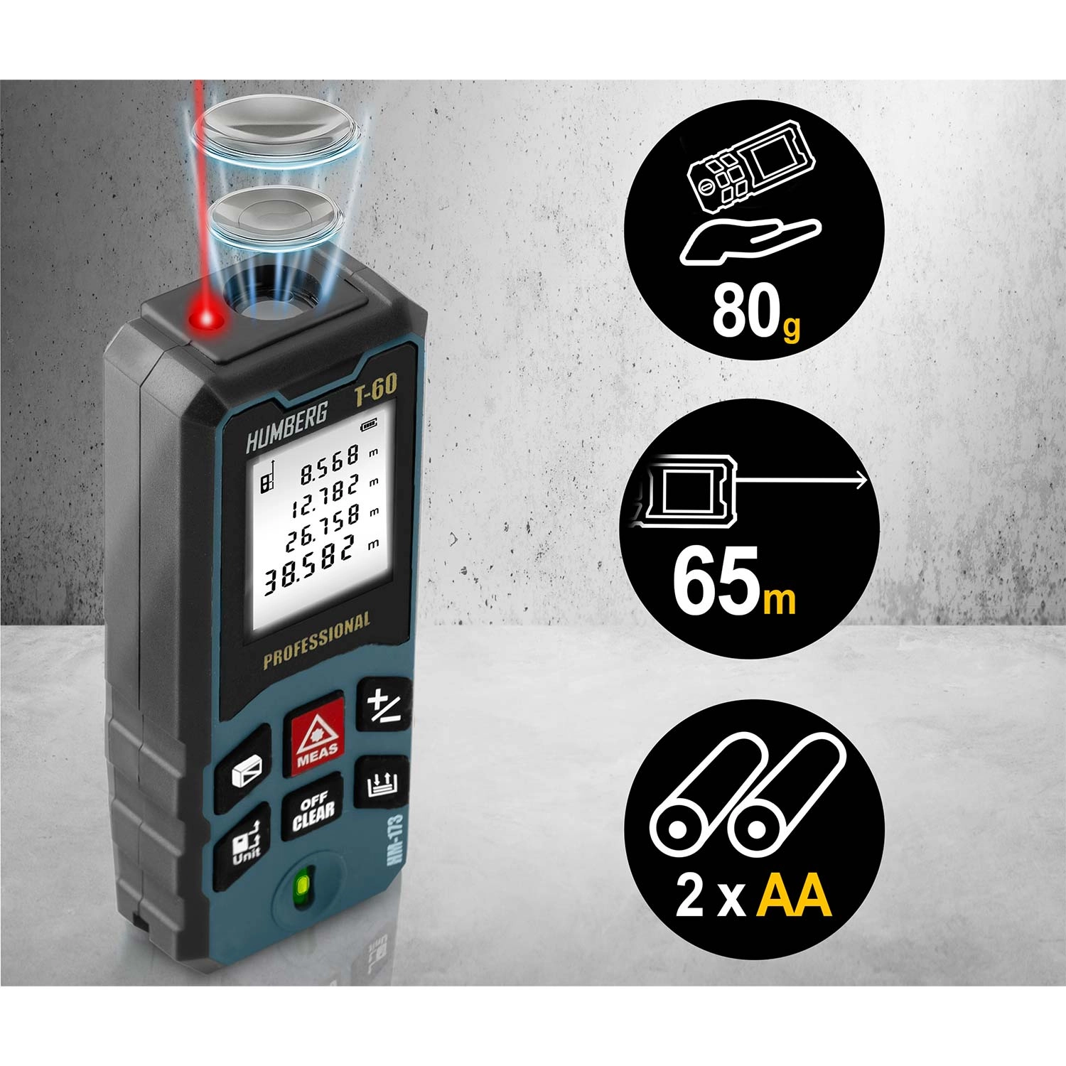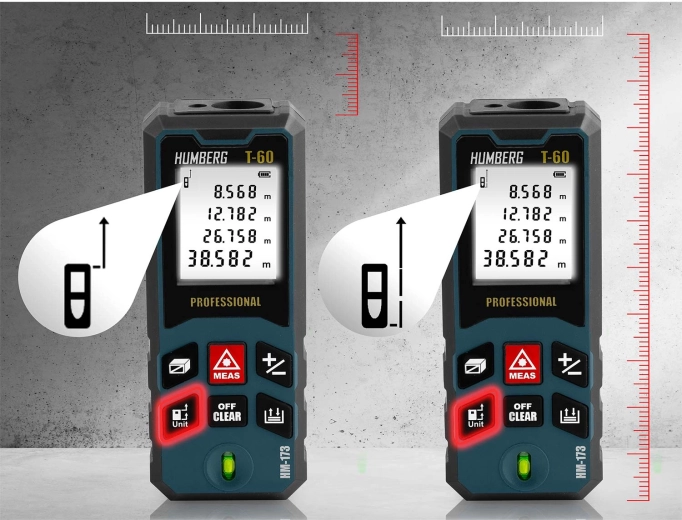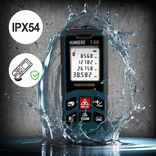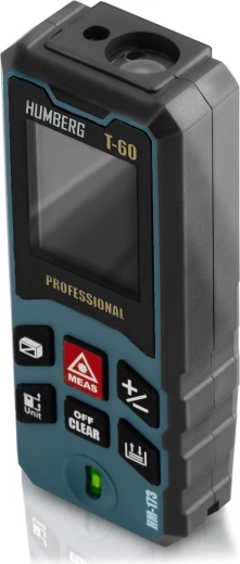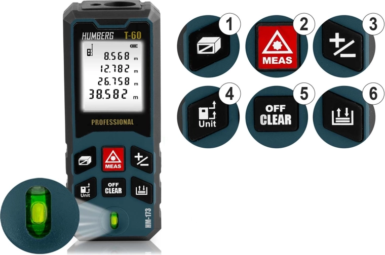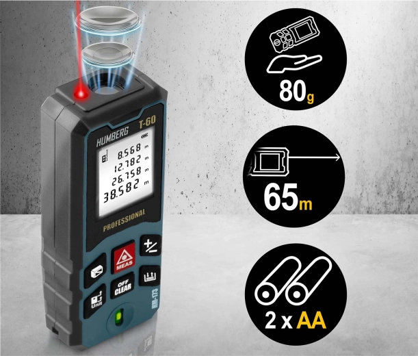 Laserový dálkoměr HUMBERG T-60 měří v rozsahu 0,05–60 m (max. 65 m) s přesností ±1,5 mm. Velký, přehledný displej usnadňuje rychlé odečty i při horším světle.