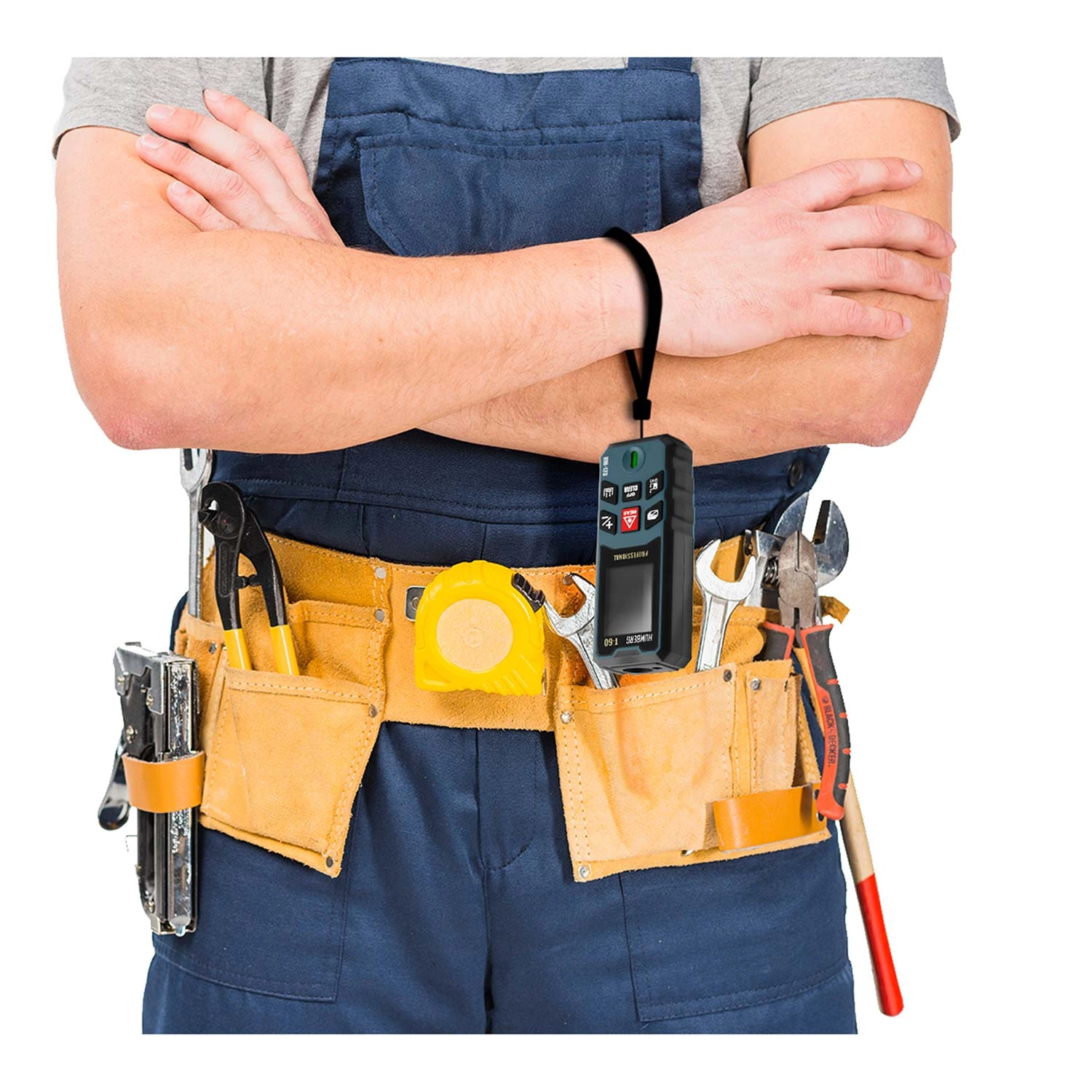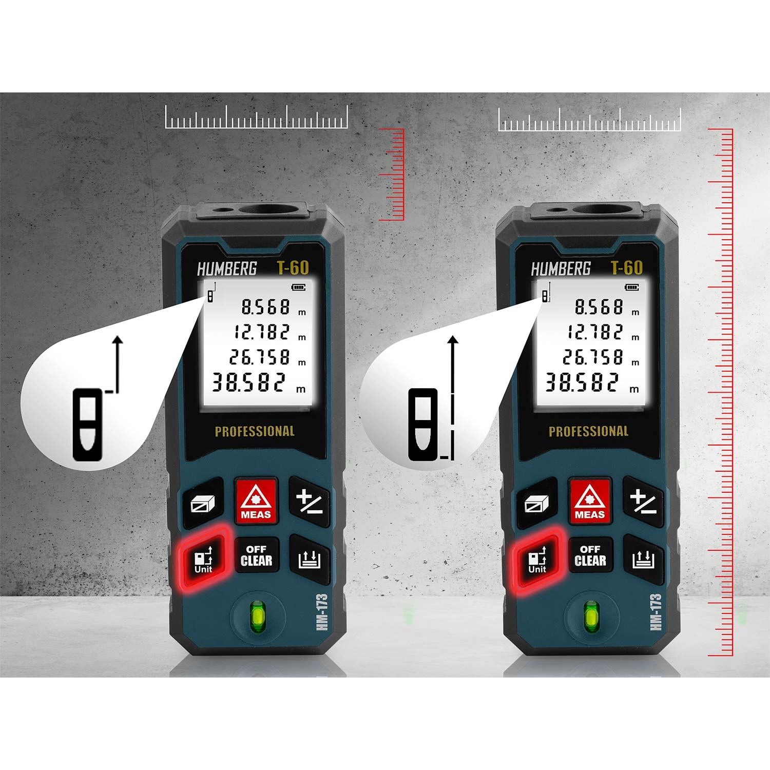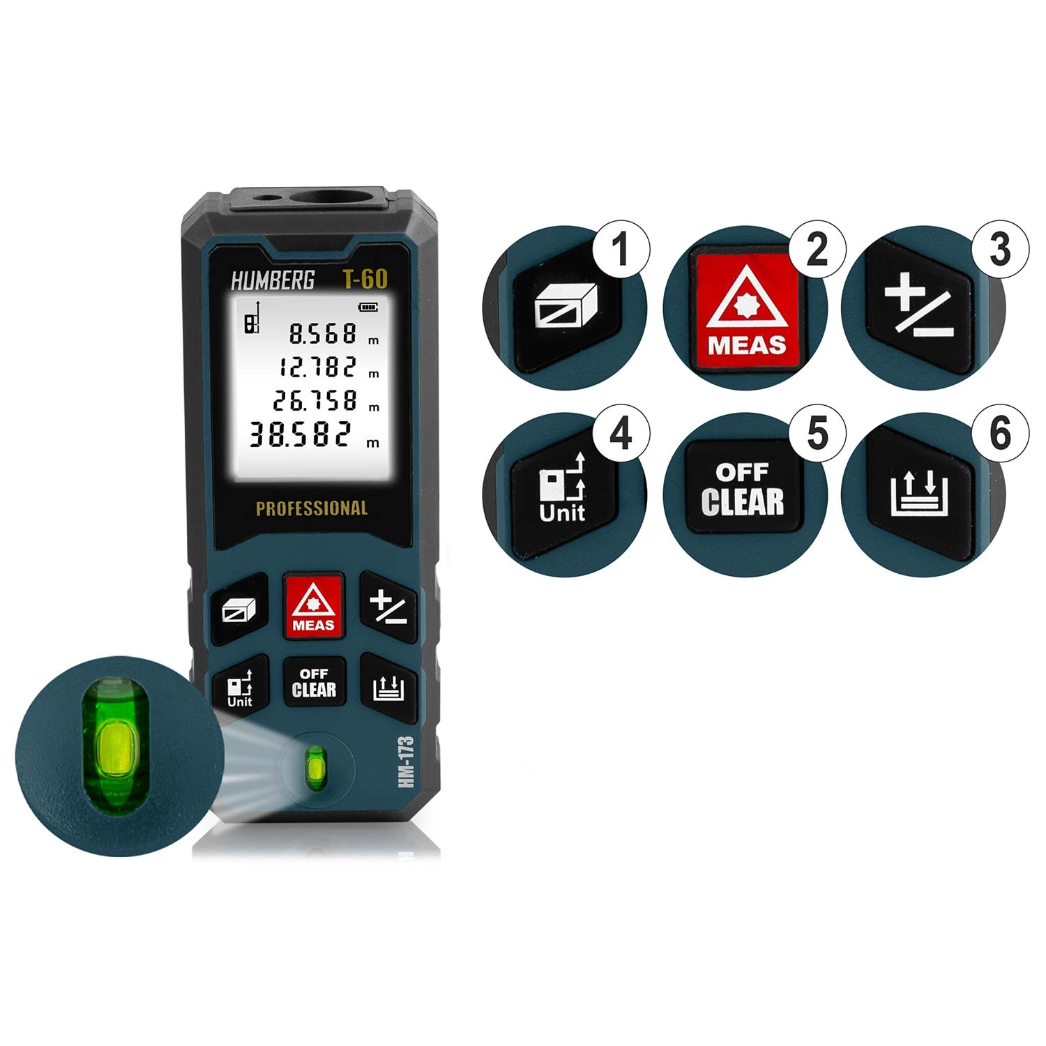 Laserový dálkoměr HUMBERG T-60 měří v rozsahu 0,05–60 m (max. 65 m) s přesností ±1,5 mm. Velký, přehledný displej usnadňuje rychlé odečty i při horším světle.