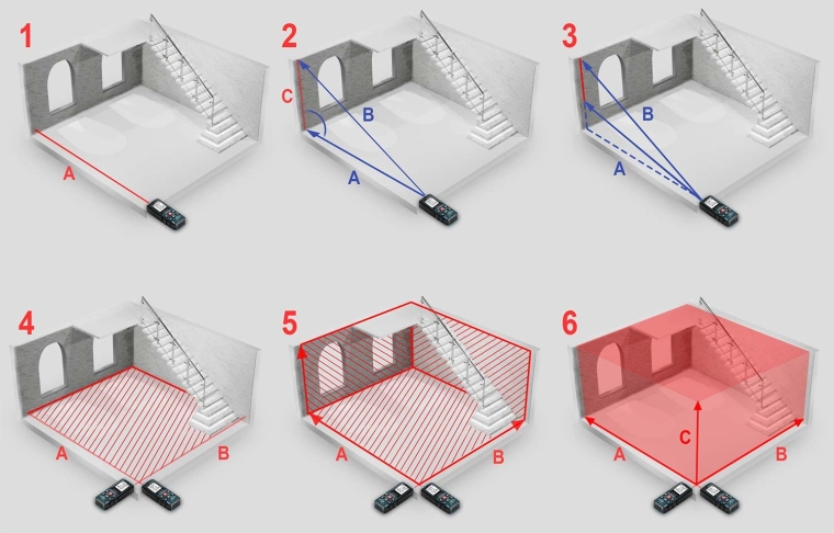 - Režimy měření: vzdálenost, souvislé měření, plocha, objem, Pythagorova metoda, sčítání/odečítání.