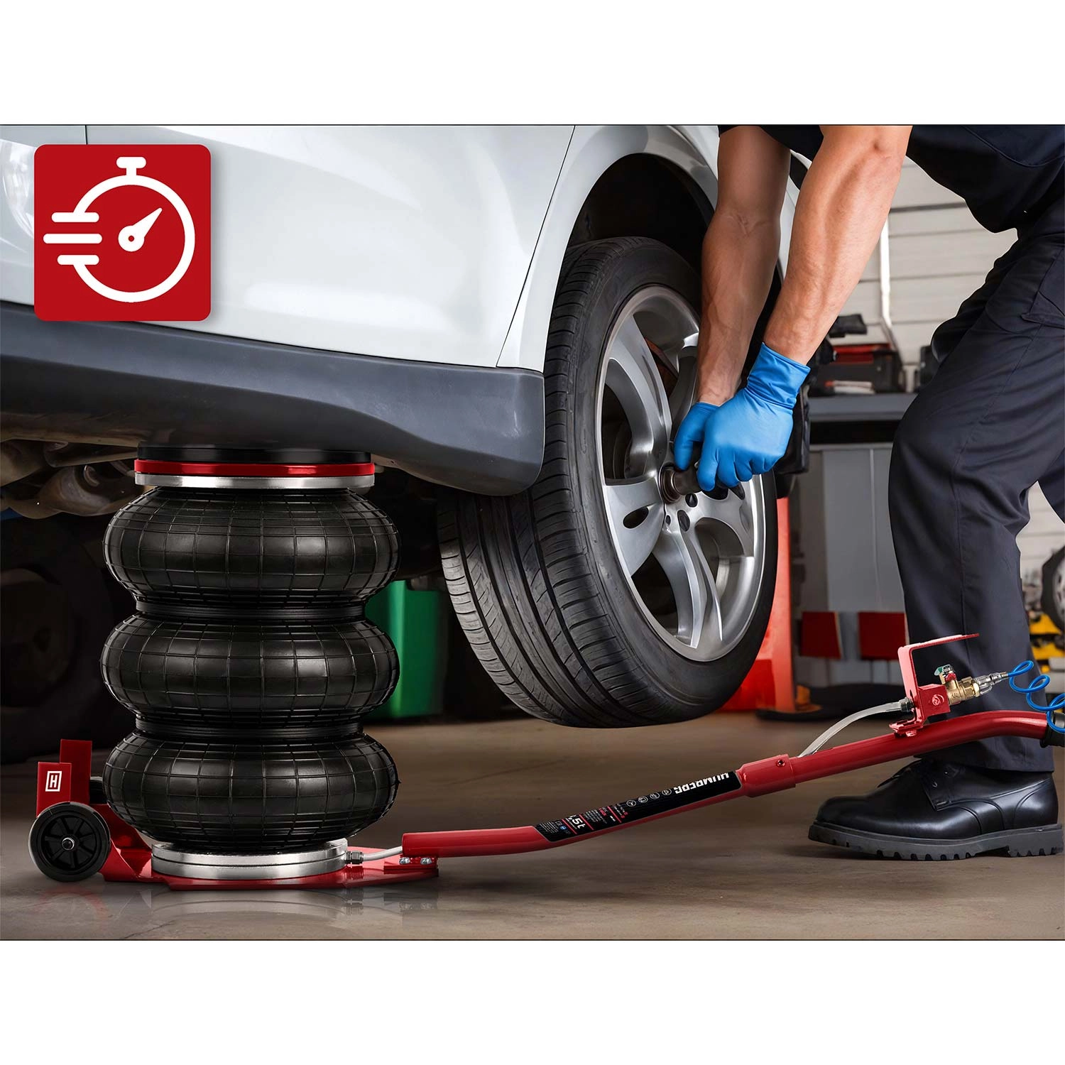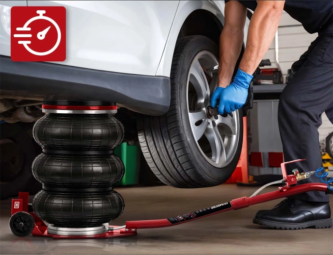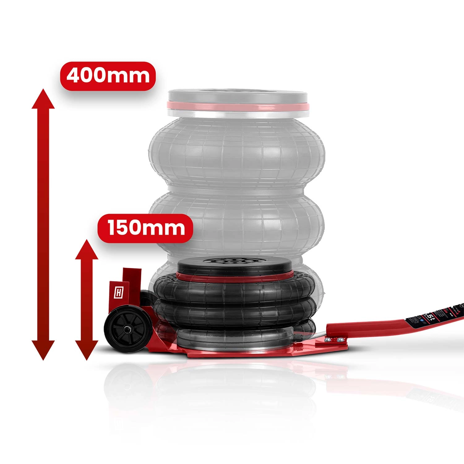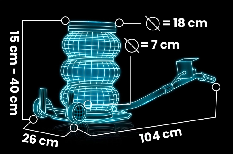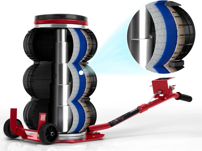Pneumatický „bałwanek“ hever HUMBErG s trojitým vakem zvedá vozidla pomocí stlačeného vzduchu rychle a bez námahy. Široký rozsah zdvihu 150–400 mm pokrývá běžné servisní práce – výměnu kol, zásahy do brzd či zavěšení. Odolná vícevrstvá guma vyztužená vlákny zajišťuje dlouhou životnost i při častém používání.