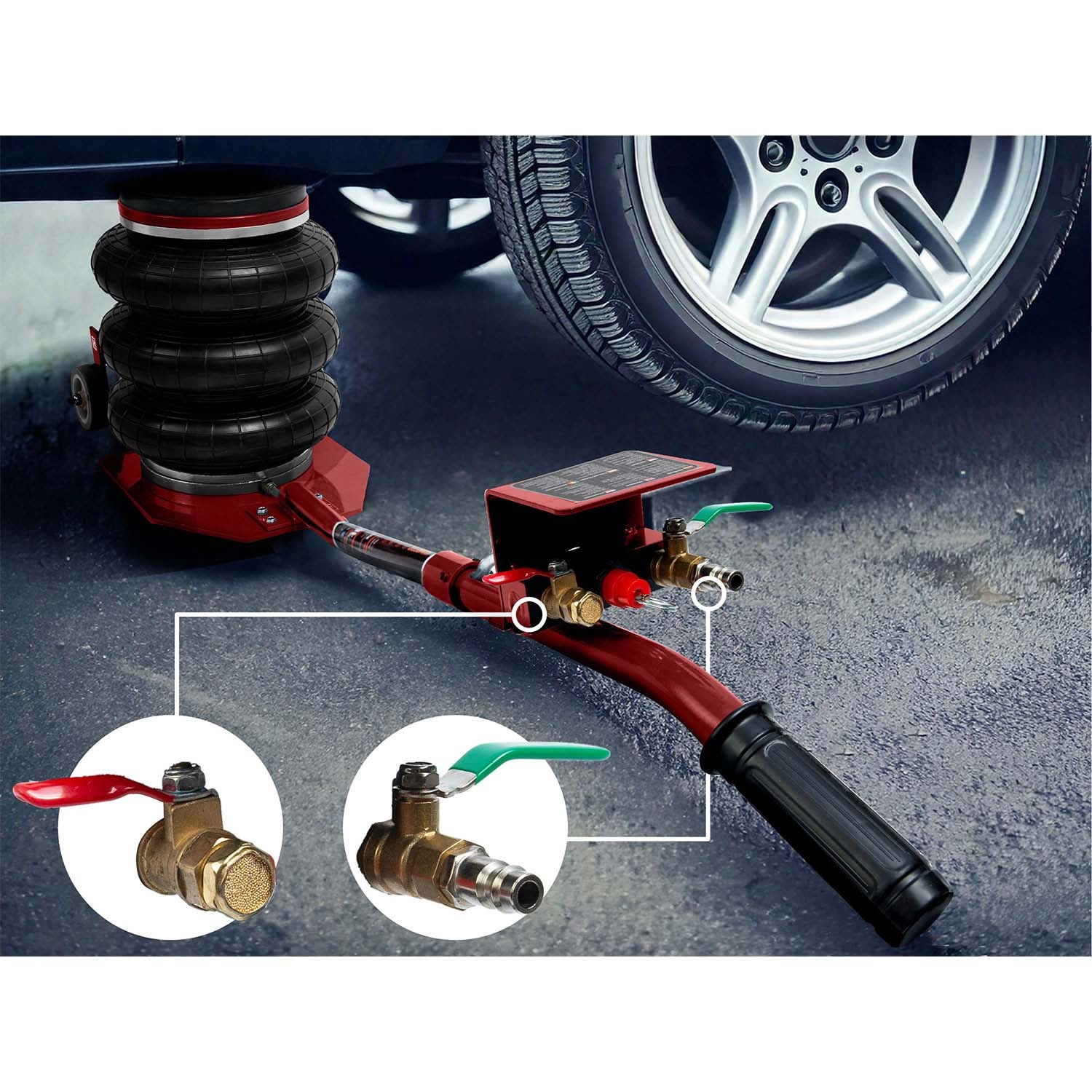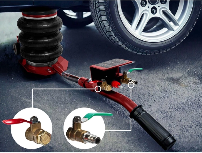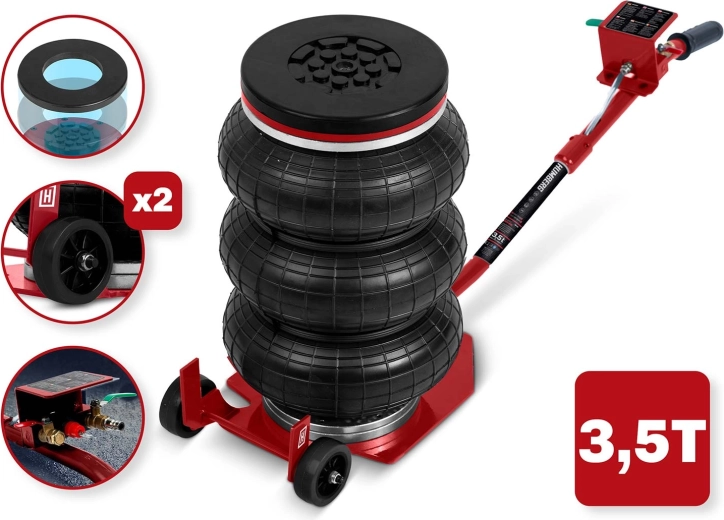 Stabilitu a bezpečnost podporuje teleskopické vedení, zabudovaný bezpečnostní ventil proti přetlaku a přehledné ovládání: zelený ventil pro přívod vzduchu a zdvih, červený ventil pro spouštění. Velká pojezdová kolečka a ergonomická rukojeť umožňují snadné manévrování pod podvozkem.