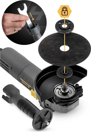 - Úhlová bruska, protiskluzová rukojeť, kovový kryt kotouče, plastová spodní krytka kotouče, 10 kotoučů 125 mm, montážní klíč, 2 náhradní uhlíky, barevné balení, návod k použití