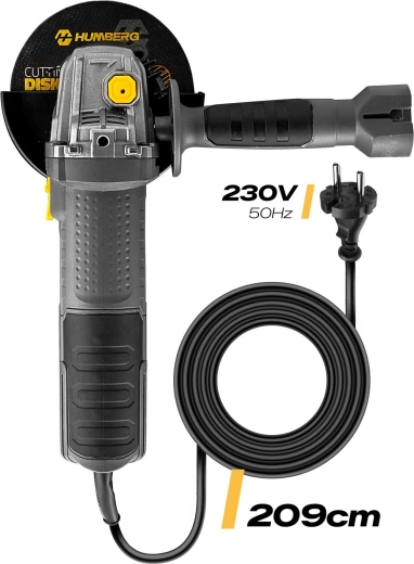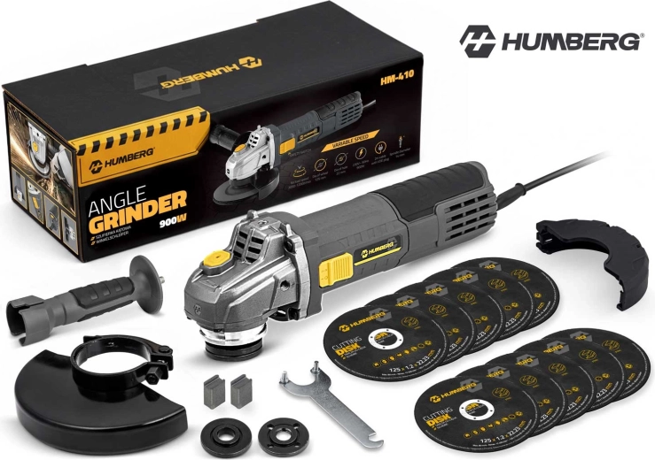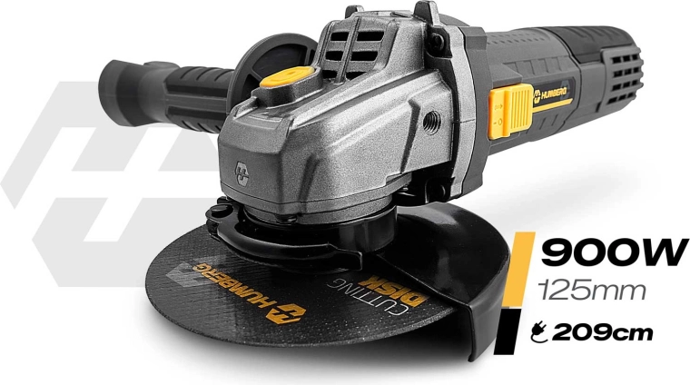 Kompaktní a výkonná úhlová bruska HUMBERG 900 W s plynulou regulací otáček 3000–12000 ot/min, závitem M14 a dlouhým kabelem 209 cm. V balení najdete 10 kotoučů 125 mm, boční rukojeť a ochranný kryt pro bezpečnou a přesnou práci při řezání i broušení kovu, betonu či keramiky.