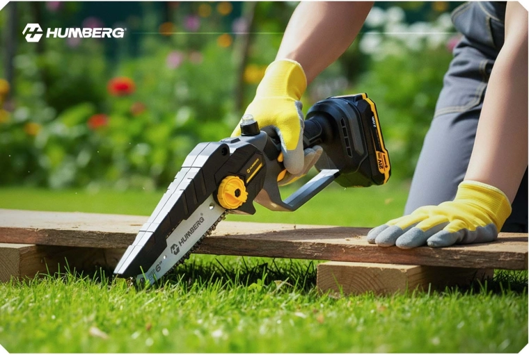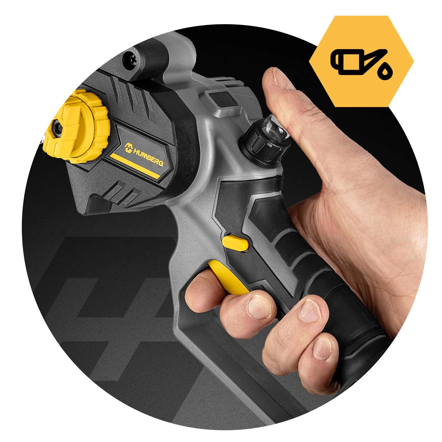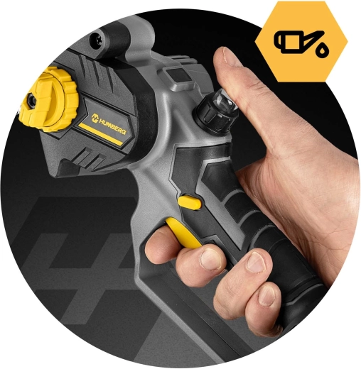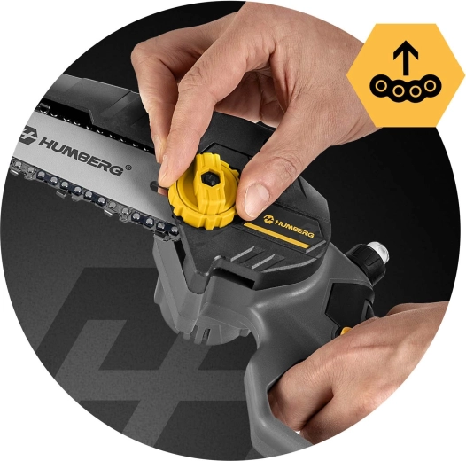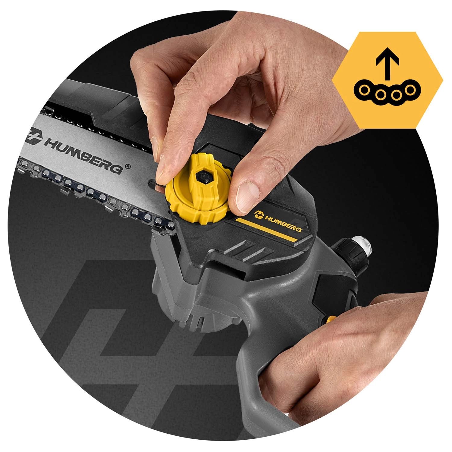 Humberg akumulátorová mini pilka kombinuje bezkartáčový motor s až 21 000 ot./min pro stabilní výkon bez zasekávání. Díky automatickému olejování a ochrannému krytu řetězu řeže rychle a bezpečně. Bezklíčové napínání pomocí bočního kolečka zkracuje přípravu – prostě otočíte a řežete.