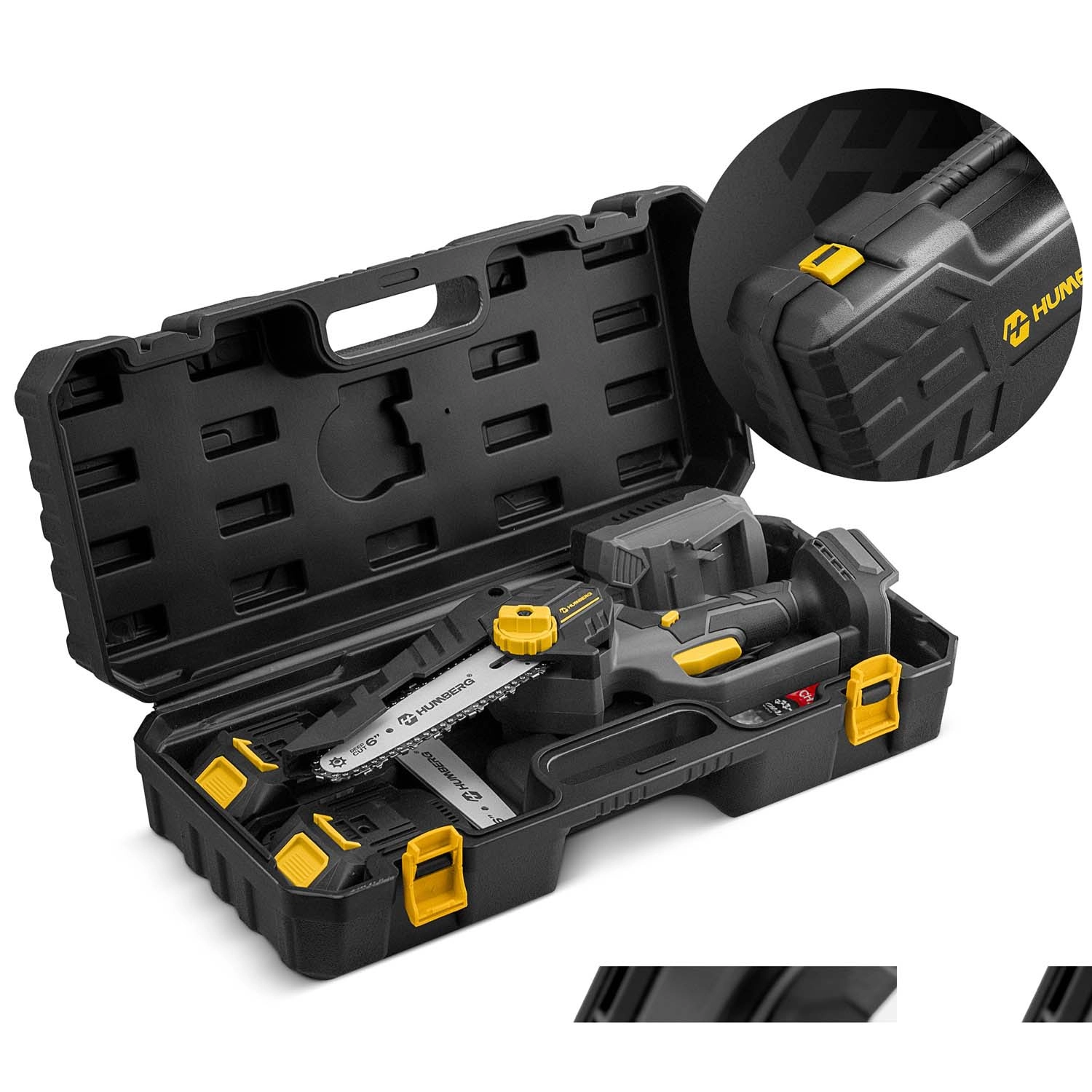 Kompaktní a výkonná akumulátorová mini pila Humberg s bezkartáčovým motorem nabízí rychlé a plynulé řezání až do 8,2 m/s, automatické mazání řetězu a bezklíčové napínání. V balení najdete 2× baterii 21 V 2 Ah, 2× lištu 6" a 2× řetěz – vše přehledně uložené v odolném kufru pro snadné přenášení. Ideální pro prořezávky větví, zahradní práce i lehké tesařské úkony s maximálním pohodlím díky ergonomické, pogumované rukojeti a nízké hmotnosti 1,4 kg.