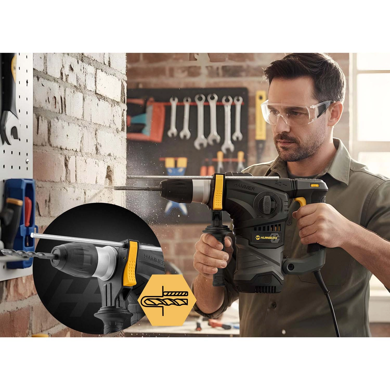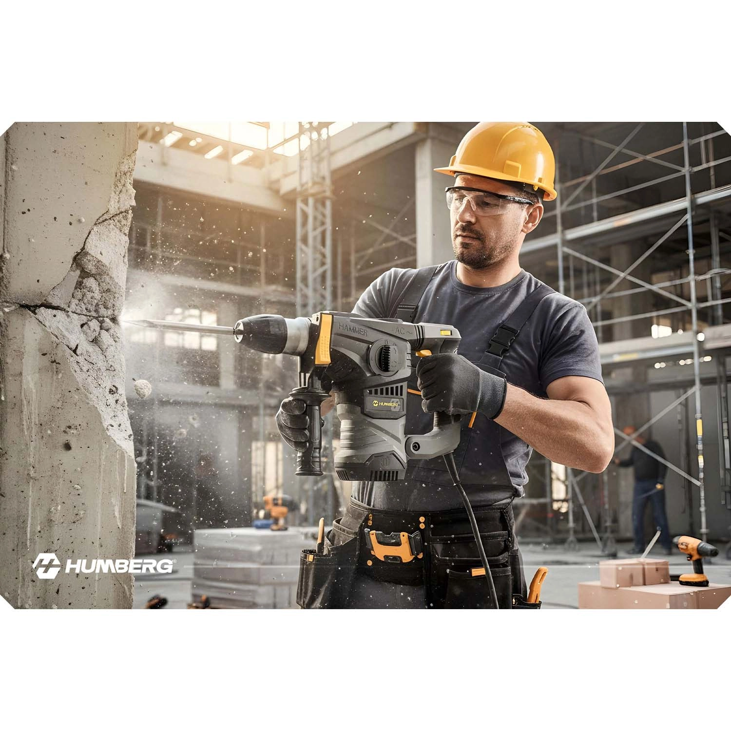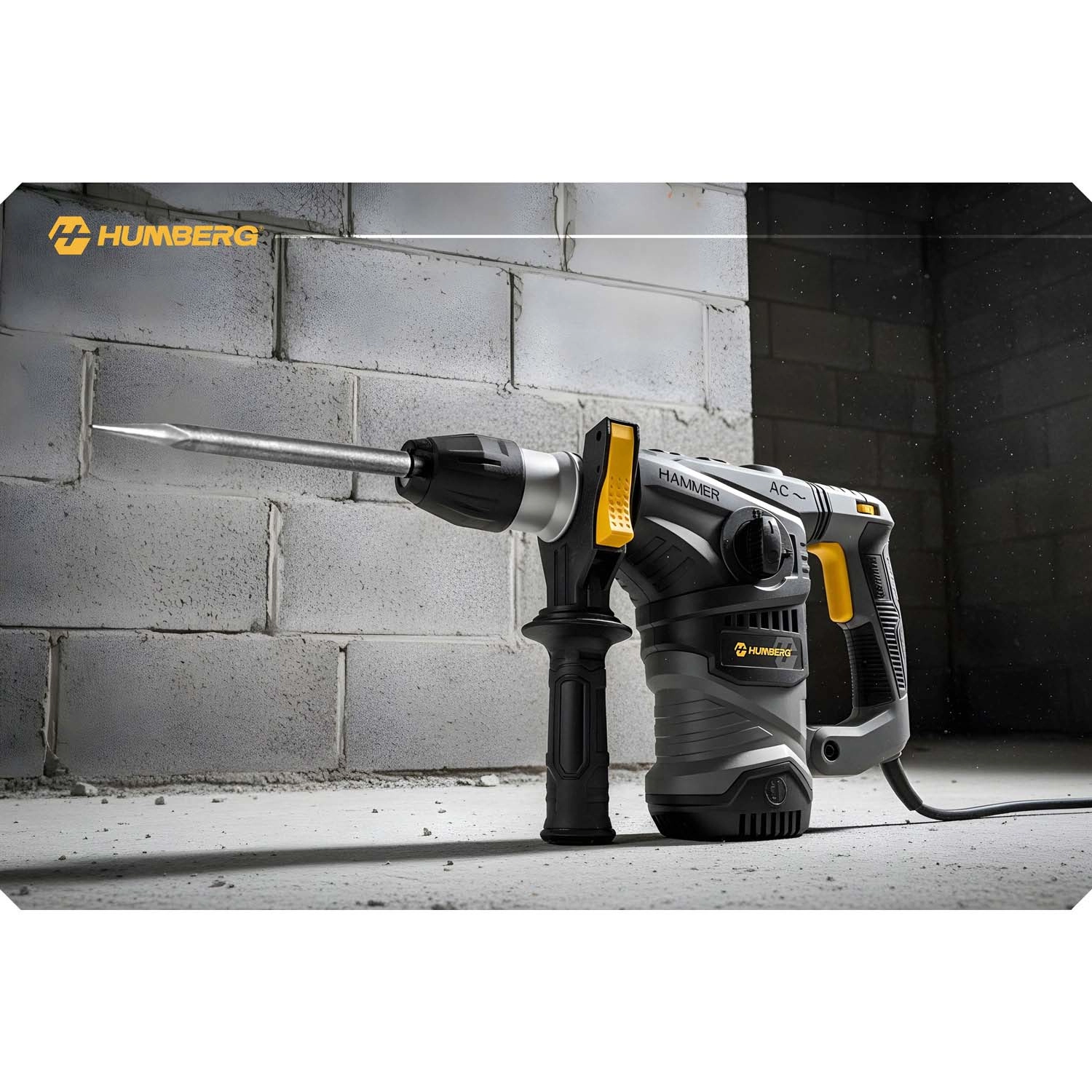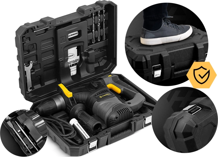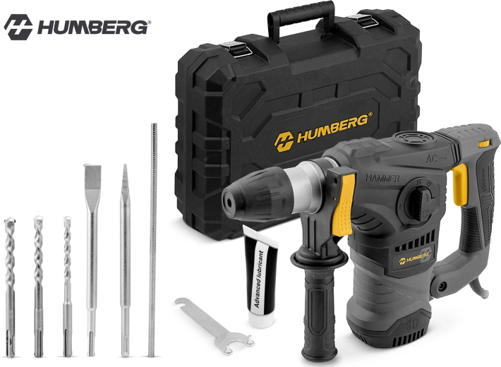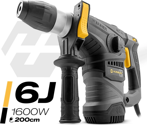 Výkonné młotovrtací kladivo SDS Plus 1600 W od značky HUMBERG pro rychlé vrtání a sekání v betonu, zdivu, dřevě i kovu. Nabízí energii úderu 6 J, plynulou regulaci 1500–4000 ot./min, 4 funkce (vrtání, vrtání s příklepem, sekání, aretace dláta) a ergonomický antivibrační úchop. Dodává se jako kompletní sada v odolném kufru se spirálovými vrtáky a dláty SDS Plus, hloubkovým dorazem a příslušenstvím pro okamžité použití.