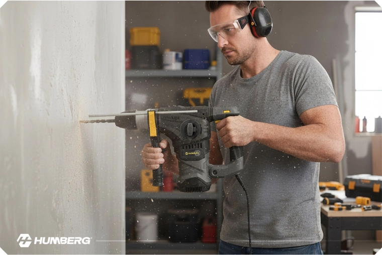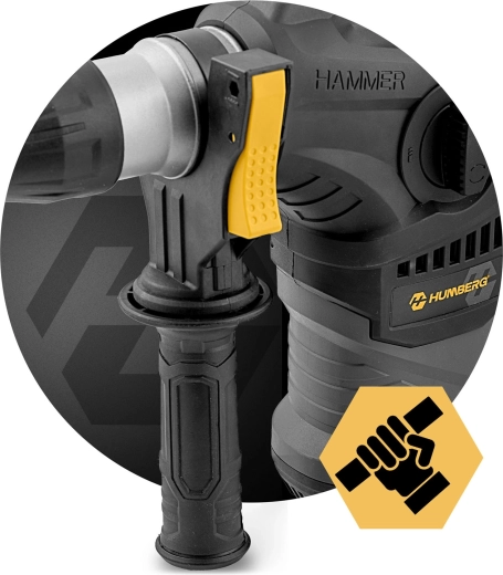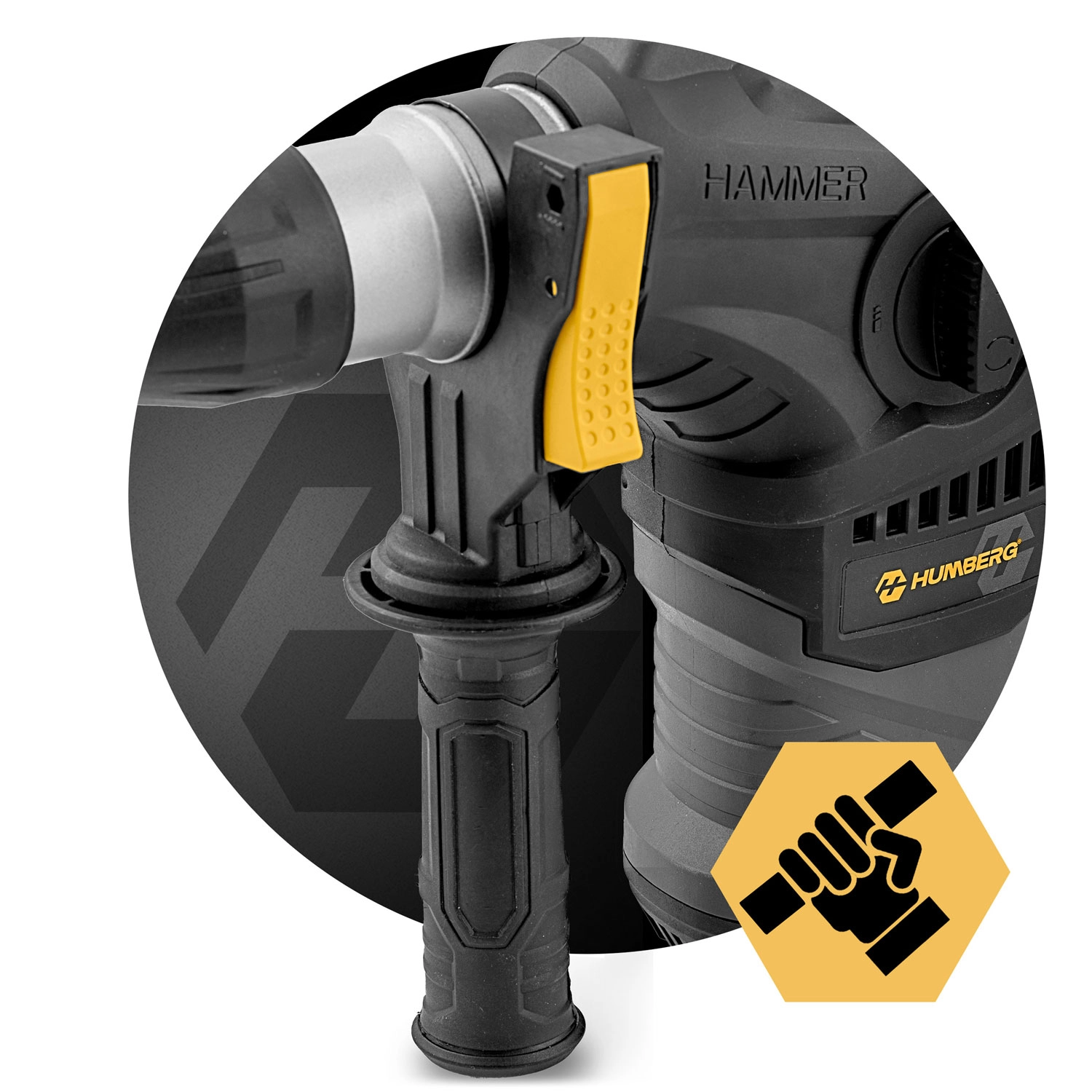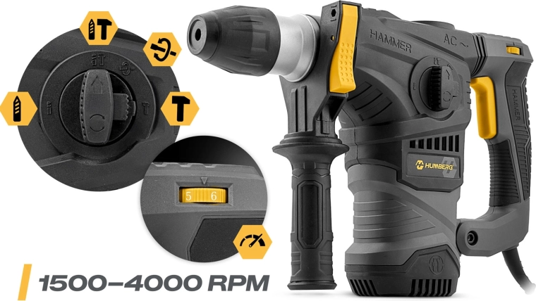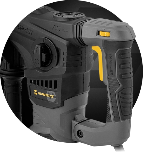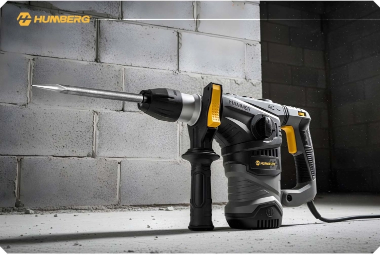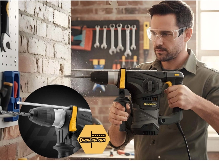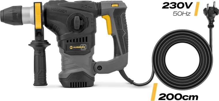 Výkonné młotovrtací kladivo SDS Plus 1600 W od značky HUMBERG pro rychlé vrtání a sekání v betonu, zdivu, dřevě i kovu. Nabízí energii úderu 6 J, plynulou regulaci 1500–4000 ot./min, 4 funkce (vrtání, vrtání s příklepem, sekání, aretace dláta) a ergonomický antivibrační úchop. Dodává se jako kompletní sada v odolném kufru se spirálovými vrtáky a dláty SDS Plus, hloubkovým dorazem a příslušenstvím pro okamžité použití.
