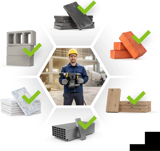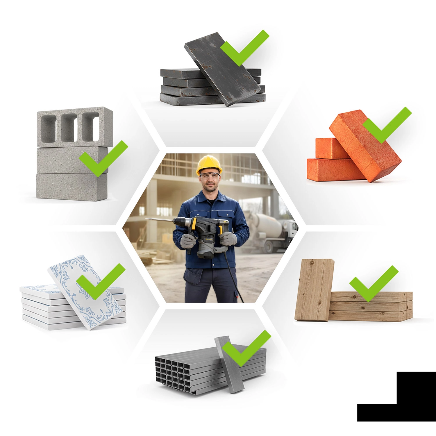 - Kontrola a přesnost: 6stupňová regulace rychlosti, aretace dláta, přesné vrtání do betonu, zdiva, dřeva i kovu