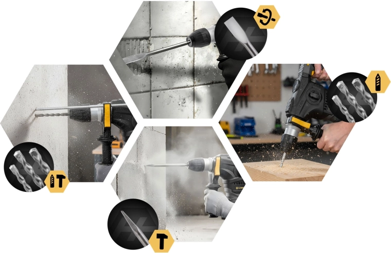 - 3 vrtáky SDS Plus (8/10/12 × 150 mm), 2 dláta SDS Plus (špičaté a ploché 14 × 230 mm), přídavná rukojeť, technická vazelína, prachová manžeta, hloubkový doraz, servisní klíč, odolný kufr
