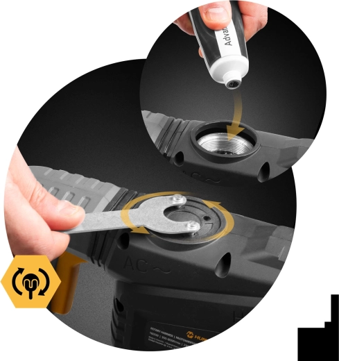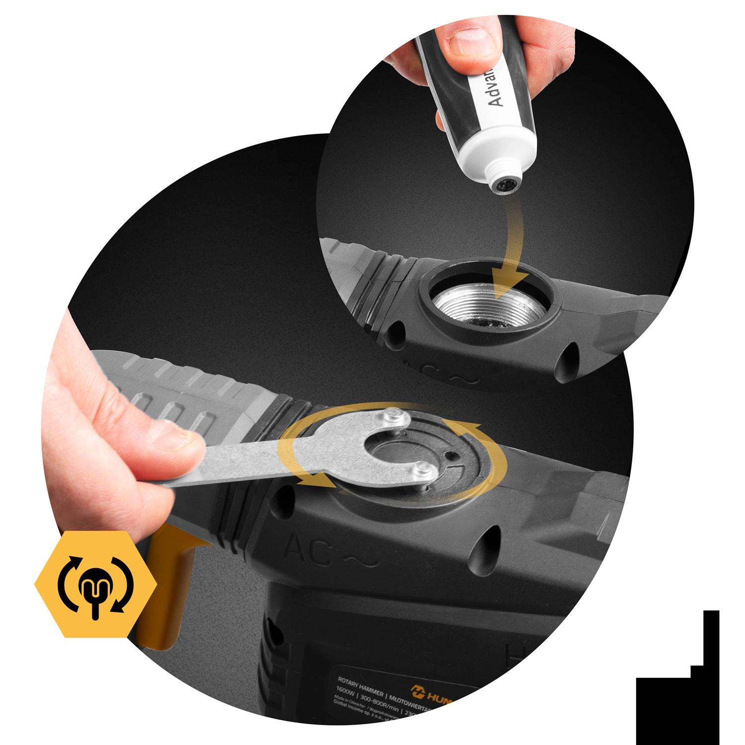 4v1 pro efektivní práci – přepínejte mezi režimy vrtání bez příklepu, vrtání s příklepem, sekání a aretační/indexací dláta. Antivibrační rukojeť a dobré vyvážení zvyšují komfort i při delší práci, 2m napájecí kabel dává volnost pohybu a mazání převodovky prodlužuje životnost.
