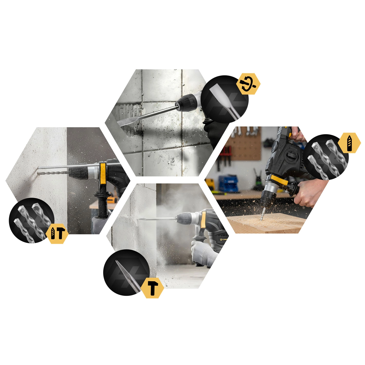 - Kompletní výbava: 3 vrtáky SDS Plus (8/10/12 × 150 mm), 2 dláta SDS Plus (špičaté a ploché 14 × 230 mm), nastavitelná přídavná rukojeť, technická vazelína, prachová manžeta, hloubkový doraz, servisní klíč