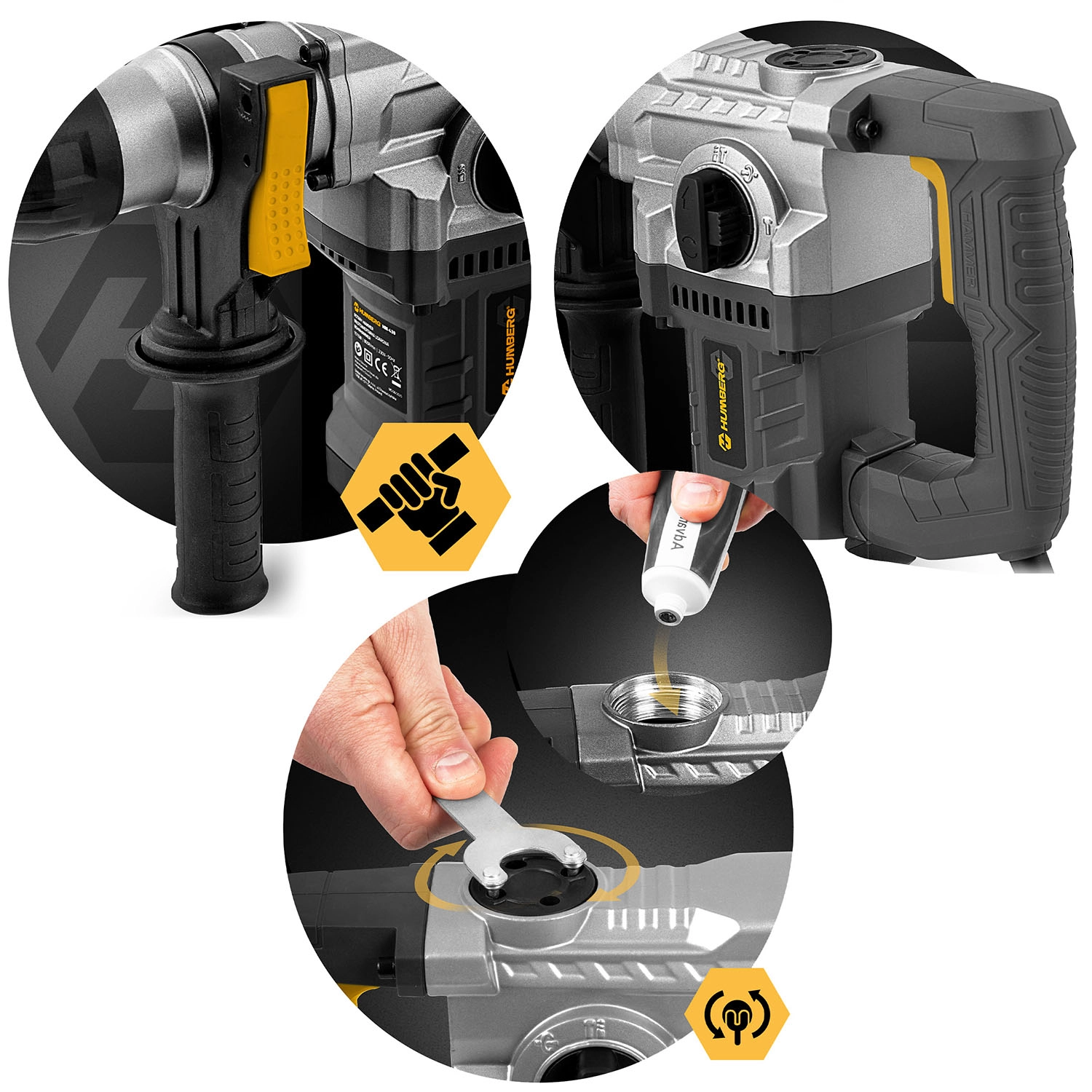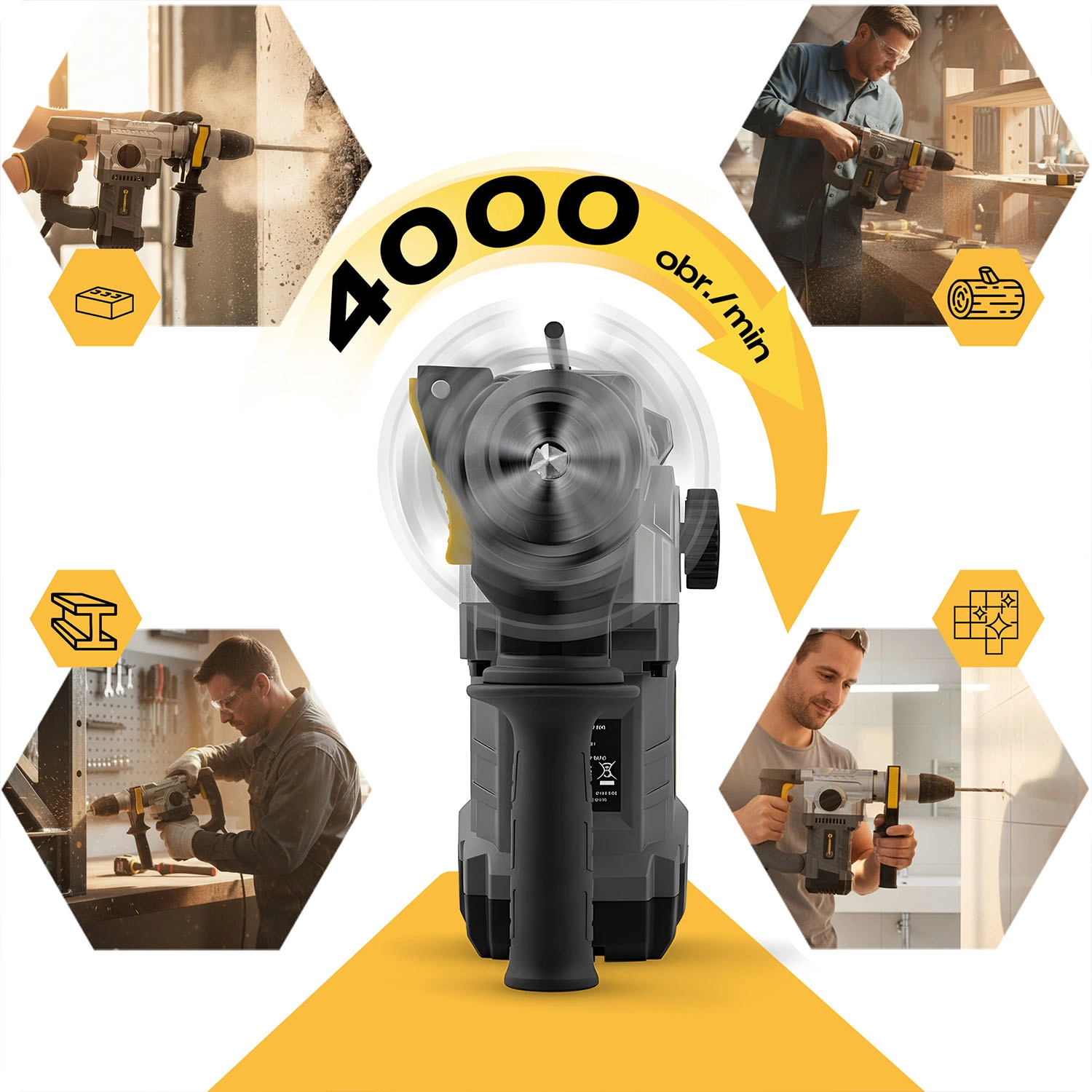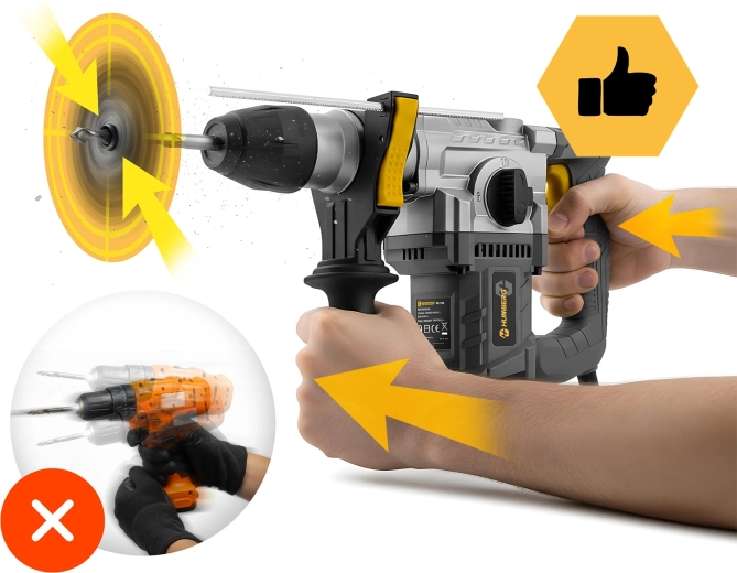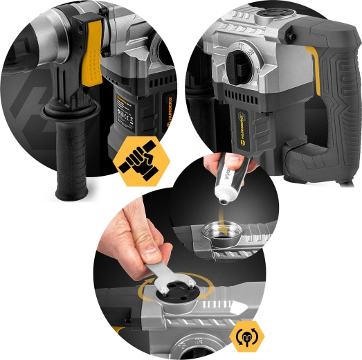 Síla a přesnost v jednom – odolný kartáčový motor s výkonem 1010 W a energií úderu 4 J poskytuje vysokou efektivitu při vrtání s příklepem i při sekání. Regulace otáček až do vysokých hodnot umožňuje přizpůsobit nástroj materiálu, mazání převodovky prodlužuje životnost a měkký, antivibrační úchop zvyšuje komfort i při delším nasazení.