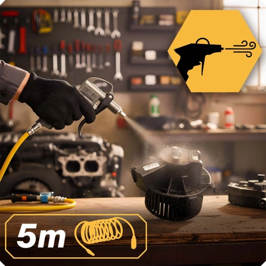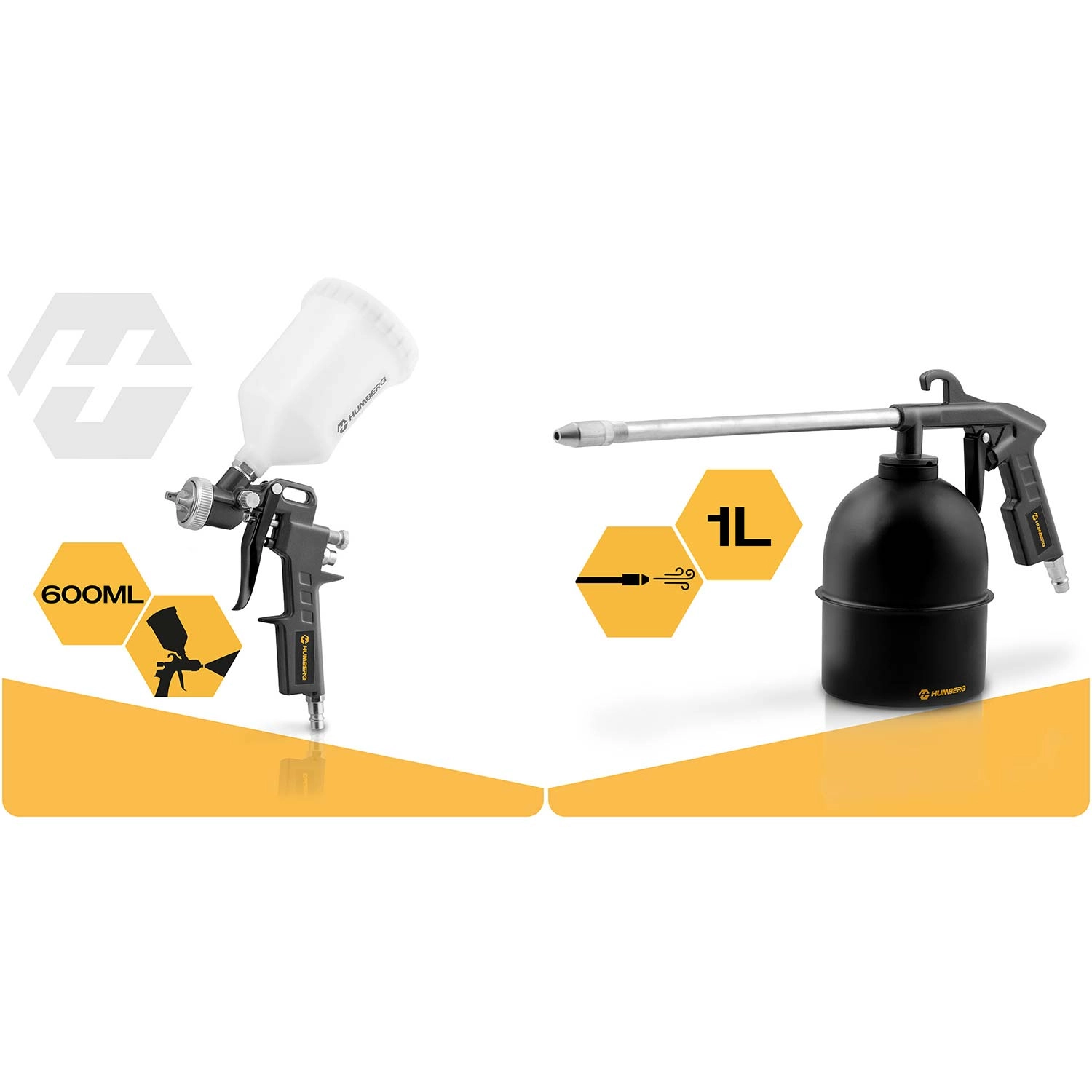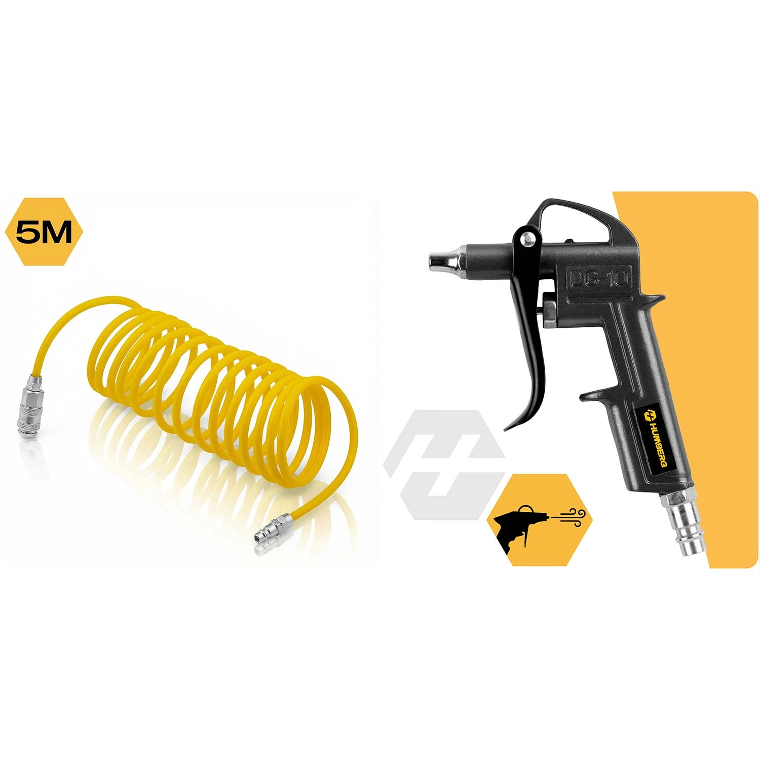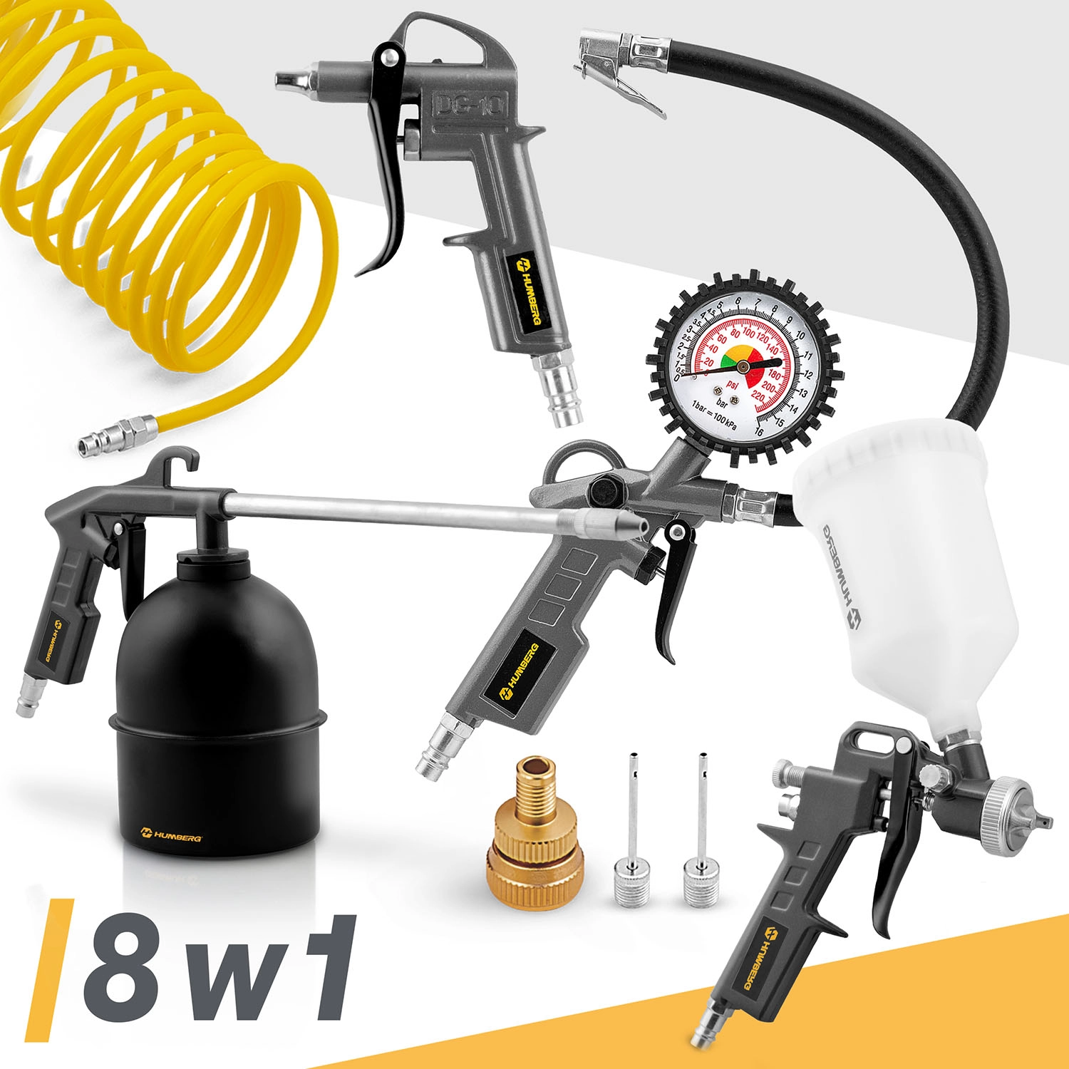 Univerzální sada pneumatického nářadí 8 v 1 pro kompresory HUMBERG zvládne huštění pneumatik, lakování, ofukování, čištění i tlakové mytí. Obsahuje pistole na huštění s manometrem, lakovací a konzervační pistoli, ofukovací pistoli, spirálovou hadici 5 m, rychlospojku a nástavce – vše pro rychlou a přesnou práci v dílně i garáži.