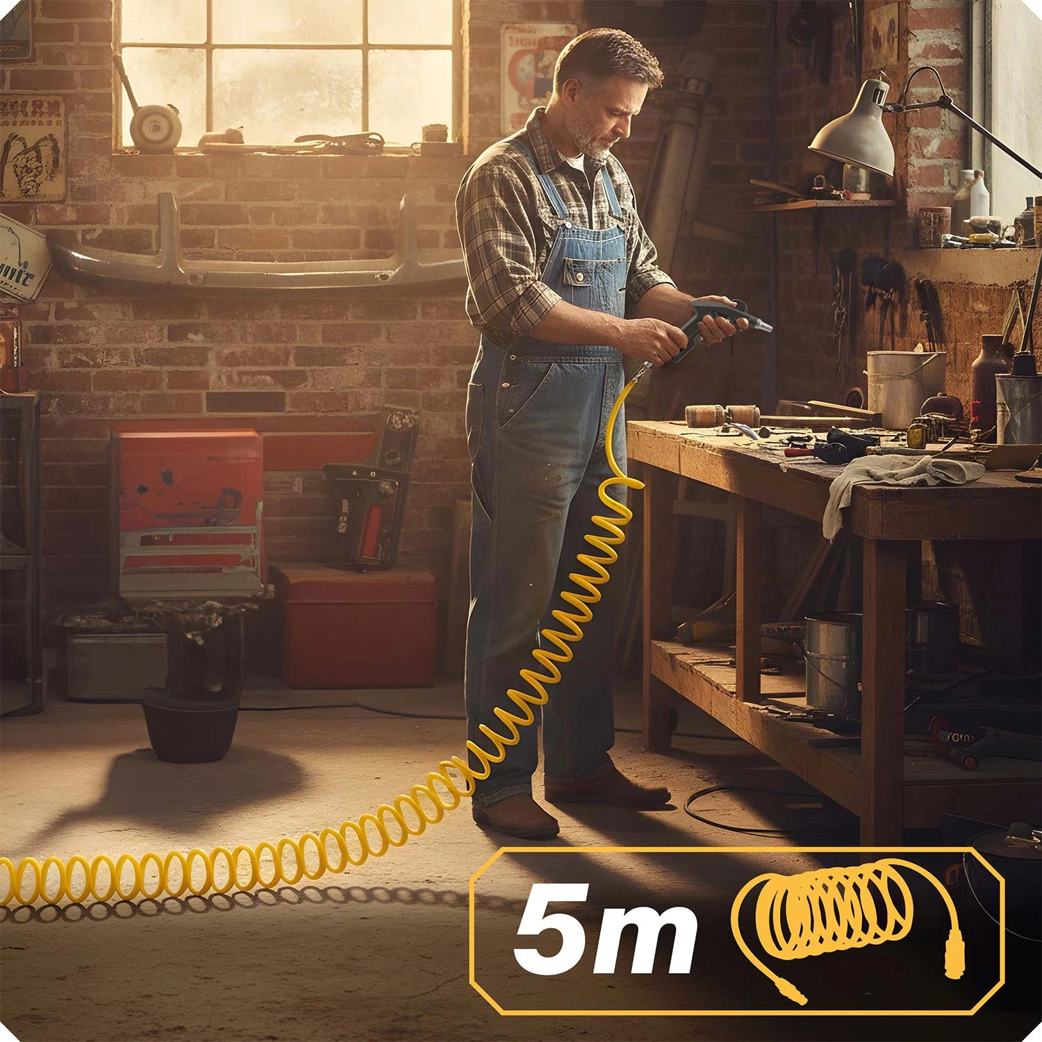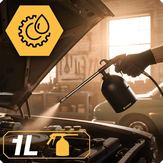 Pro náročnější média je určena konzervační/aplikační pistole s nádobou 1 l – perfektní pro ochranné přípravky podvozků, maziva a antikorozní směsi. Spirálová hadice 5 m je lehká, pružná a odolná proti zalomení, takže zajišťuje pohodlný dosah a snadné manévrování kolem pracovního místa.