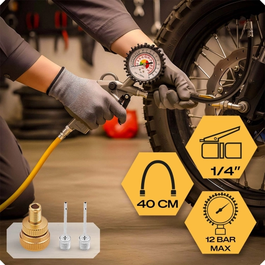Tato bohatě vybavená sada nabízí profesionální výsledky doma i v dílně. Pistole na huštění s manometrem umožňuje přesnou kontrolu tlaku, elastická hadice 40 cm usnadňuje přístup do hůře dostupných míst a standardní připojení 1/4" zaručuje kompatibilitu s většinou kompresorů. Součástí jsou i koncovky pro sportovní míče a rychlospojka pro rychlé a těsné připojení.
