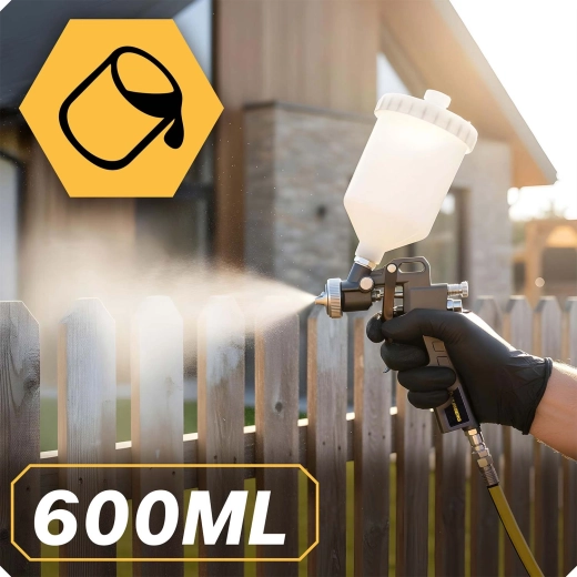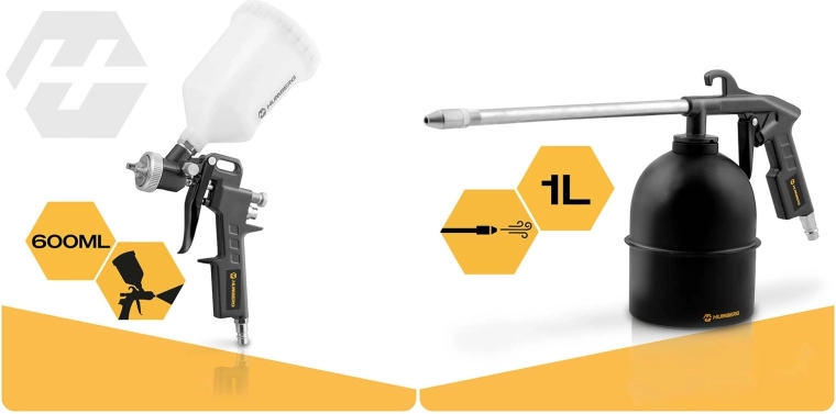 Ofukovací pistole s ergonomickým úchopem a úzkou tryskou je ideální pro čistění prachu, pilin a třísek. Dvě různé prodloužené trysky zvyšují přesnost podle potřeby. Lakovací pistole se zásobníkem 600 ml nabízí regulaci množství a tvaru proudu pro rovnoměrnou aplikaci bez stékání, vhodná na karosářské díly, nábytek i kov.