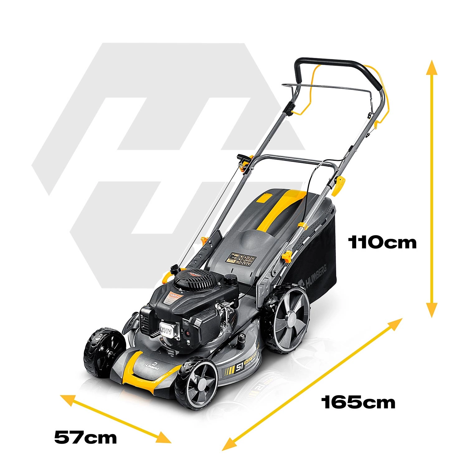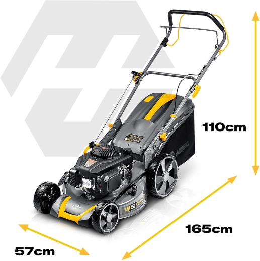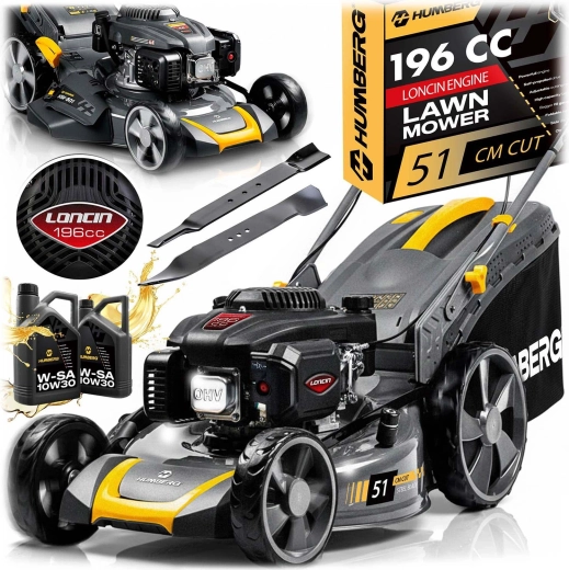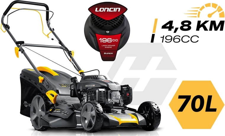 Výkonná benzínová sekačka s pojezdem pro rychlé a rovnoměrné sečení i v husté trávě. Motor LONCIN 196 cm³ (3,5 kW ≈ 4,8 HP), šířka záběru 51 cm, centrální nastavení výšky 30–80 mm (6 poloh) a 3 režimy sečení: sběr, boční výhoz, mulčování. Robustní ocelové šasi, koš 70 l, pojezd do 3,6 km/h a snadný start pro pohodlnou a efektivní práci na menších i velkých zahradách.