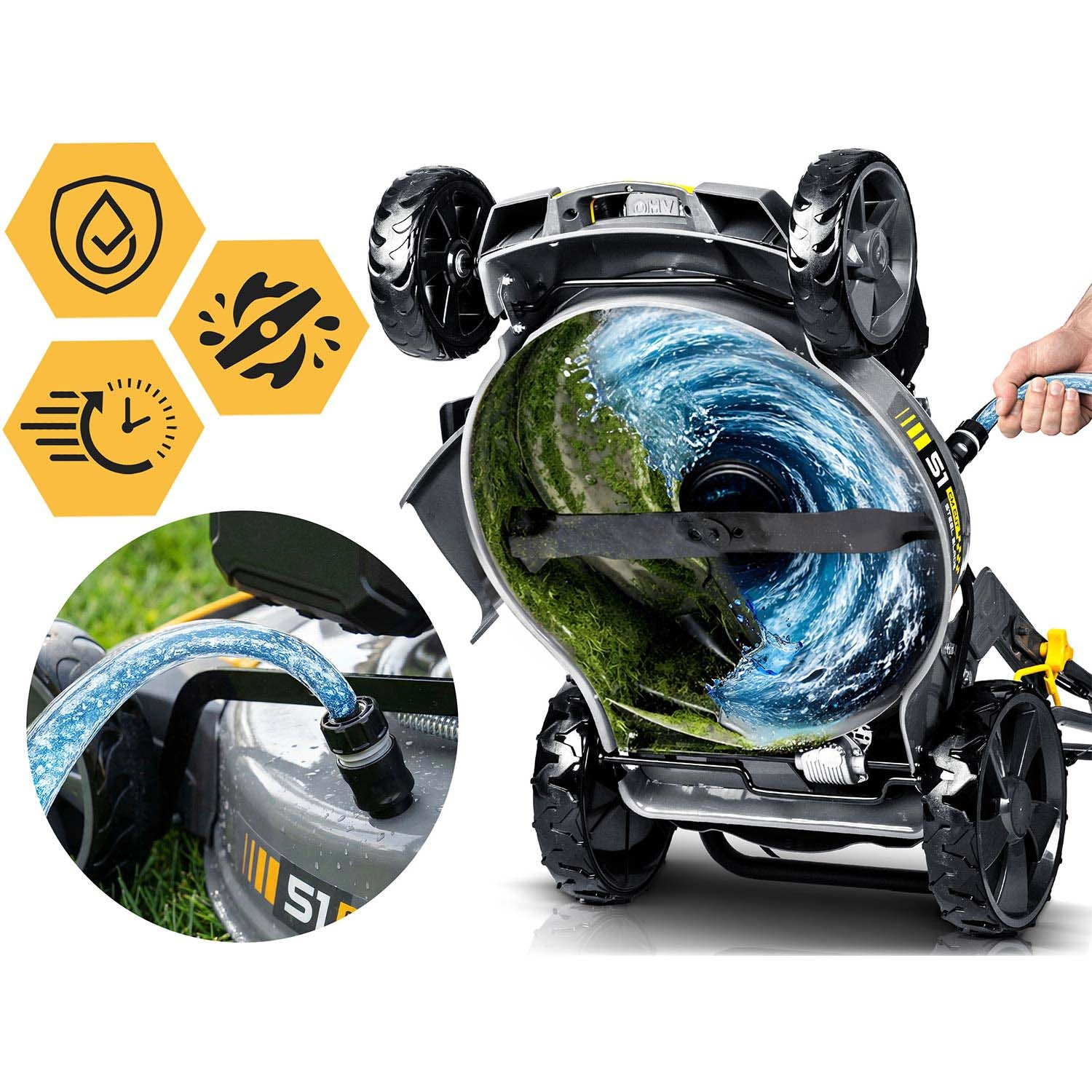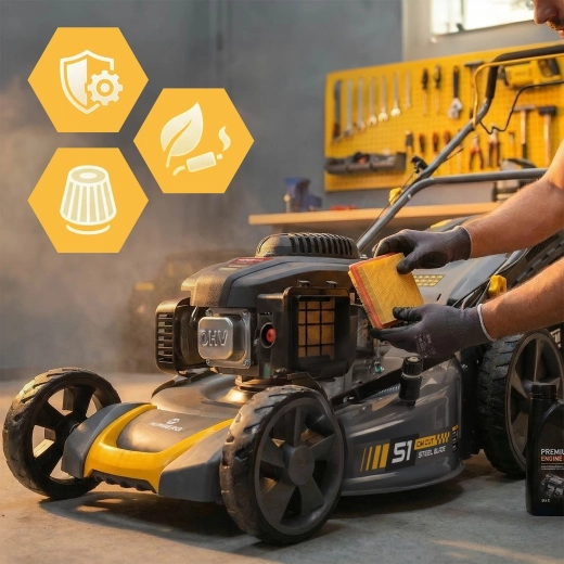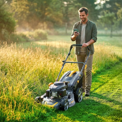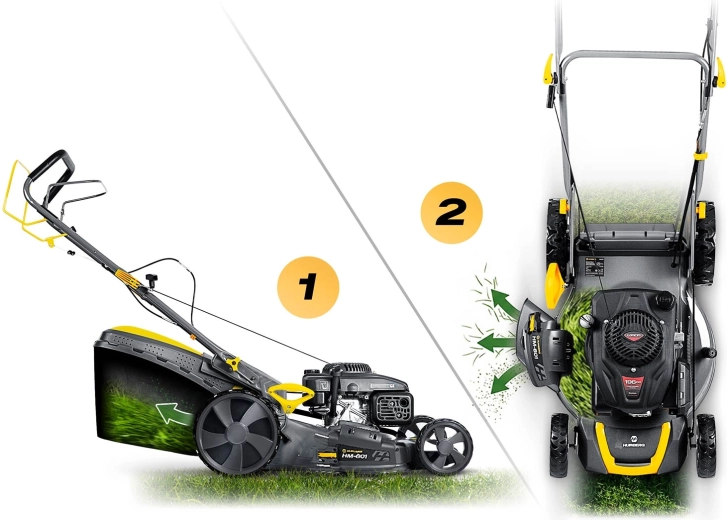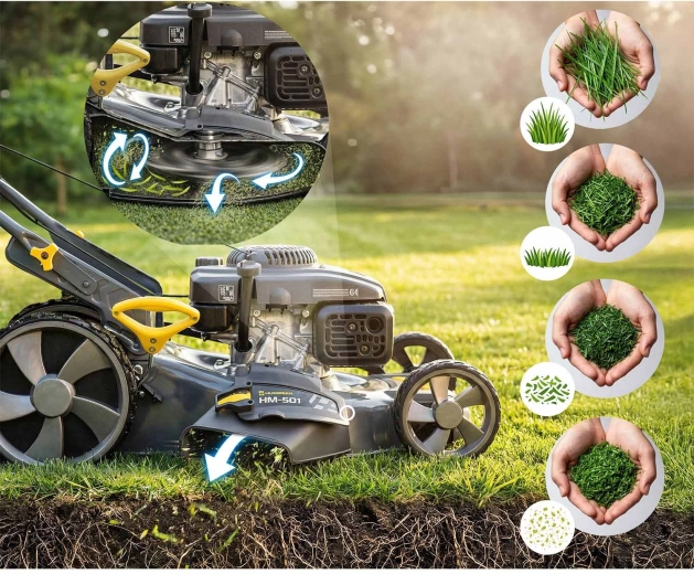 Flexibilitu zajišťují tři pracovní režimy – sběr do koše 70 l se signalizací naplnění, boční výhoz pro rychlé sečení větších ploch a mulčování pro přirozenou výživu trávníku. Integrovaný pojezd s rychlostí až 3,6 km/h uleví při práci na svazích i velkých zahradách. Filtr vzduchu, úsporný provoz a snadné čištění šasi přes přípojku na hadici zjednoduší údržbu.