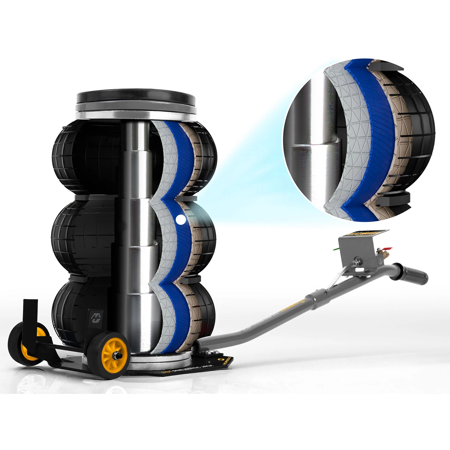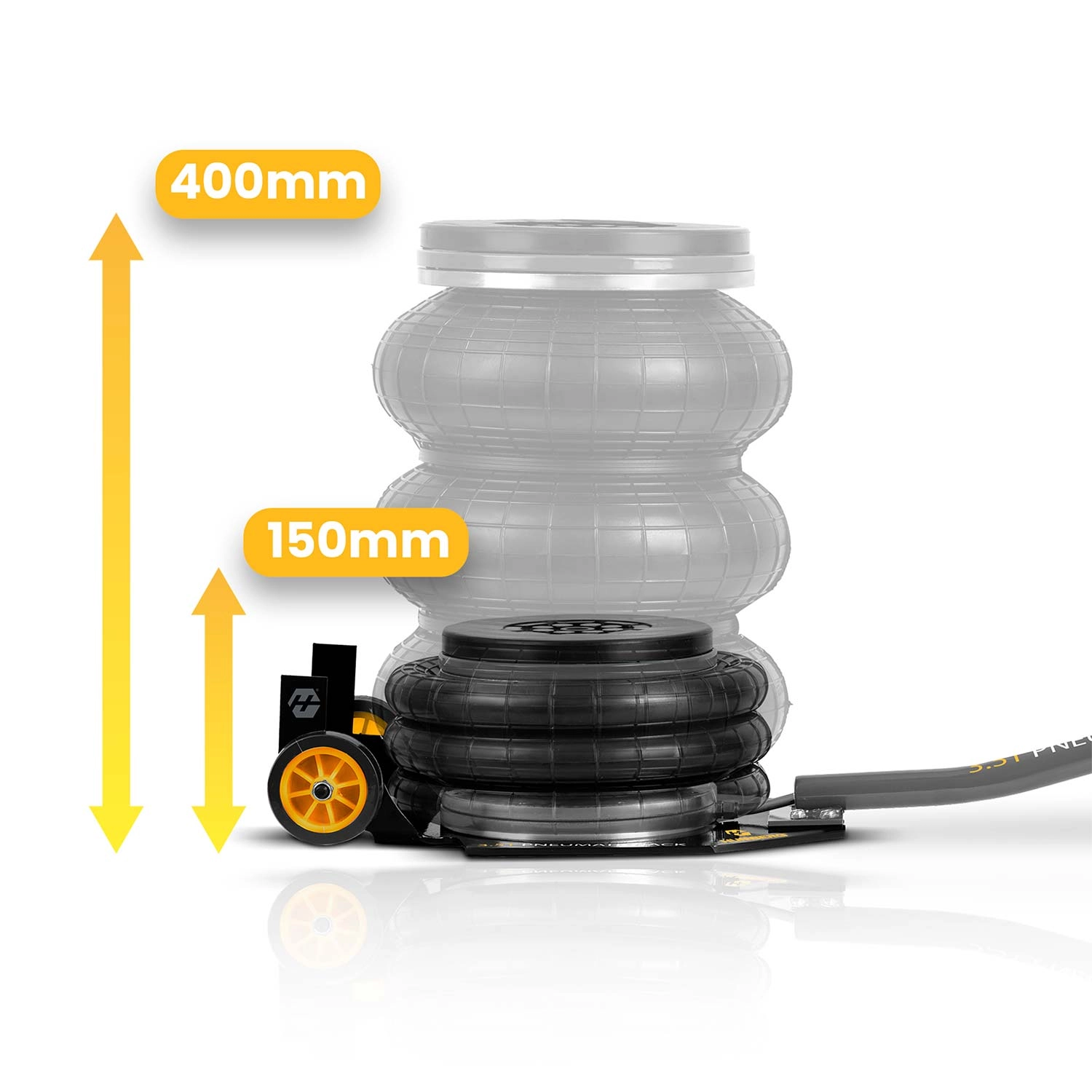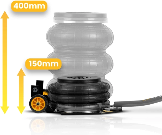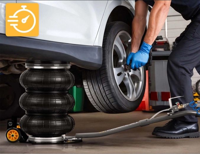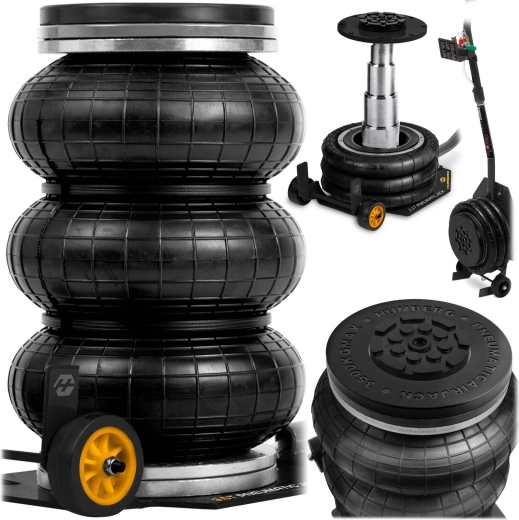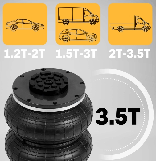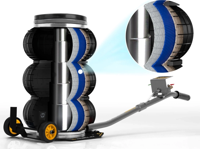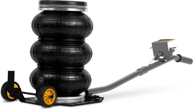 Výkonný pneumatický systém s pracovním tlakem 6–12 bar zvedne vozidlo během okamžiku. Stabilitu podporuje teleskopický píst a vícevrstvá guma odolná vůči vysokému zatížení.