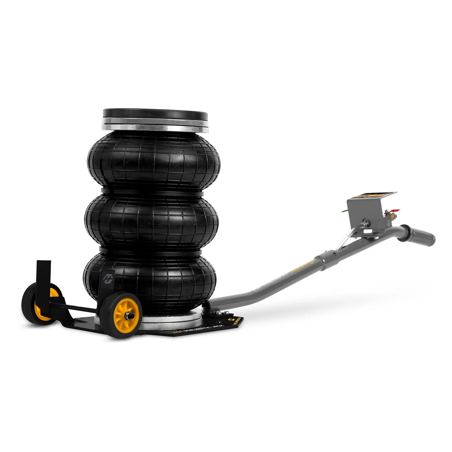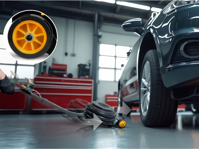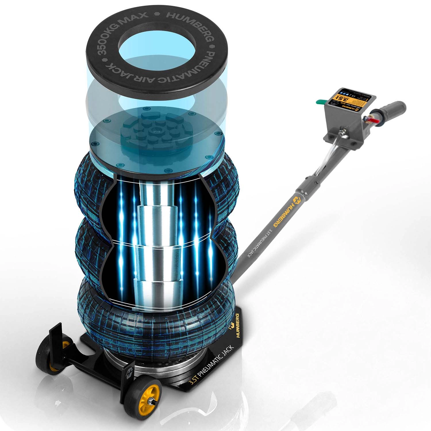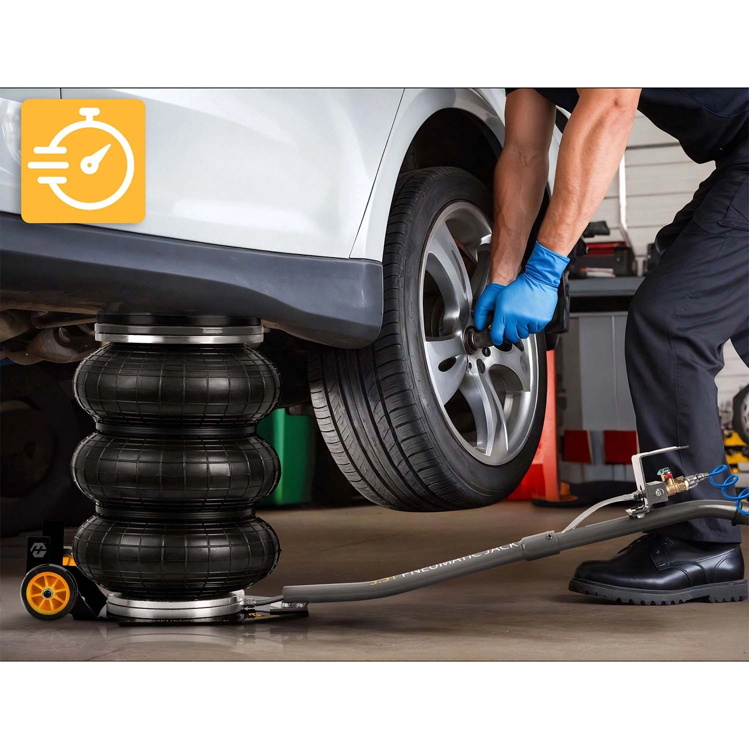 Výkonný pneumatický systém s pracovním tlakem 6–12 bar zvedne vozidlo během okamžiku. Stabilitu podporuje teleskopický píst a vícevrstvá guma odolná vůči vysokému zatížení.