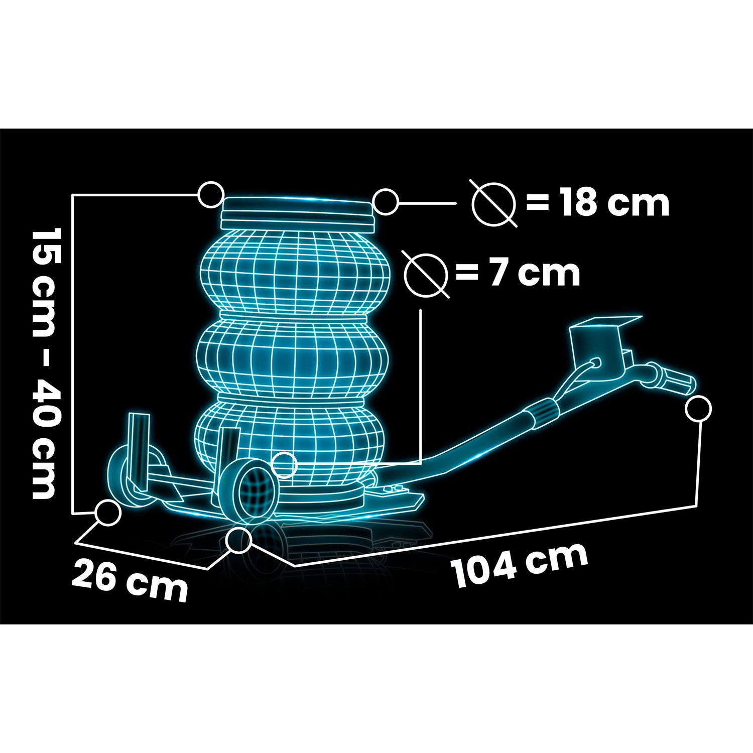 Rozsah zdvihu 15–40 cm pokrývá potřeby běžných osobních aut i vozidel s vyšším podvozkem. Ideální pro výměnu kol a servis podvozku.