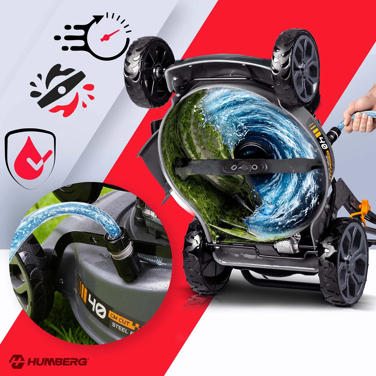 Robustní ocelová konstrukce s tvrzeným ocelovým nožem zajistí čistý střih bez třepení. Díky třem pracovním režimům – sběr do koše, boční výhoz nebo mulčování – dosáhnete vždy perfektního výsledku. Koš o objemu 45 l se signalizátorem naplnění znamená méně přestávek a plynulejší práci. Systém mytí šasi s připojením zahradní hadice usnadní údržbu po sečení.