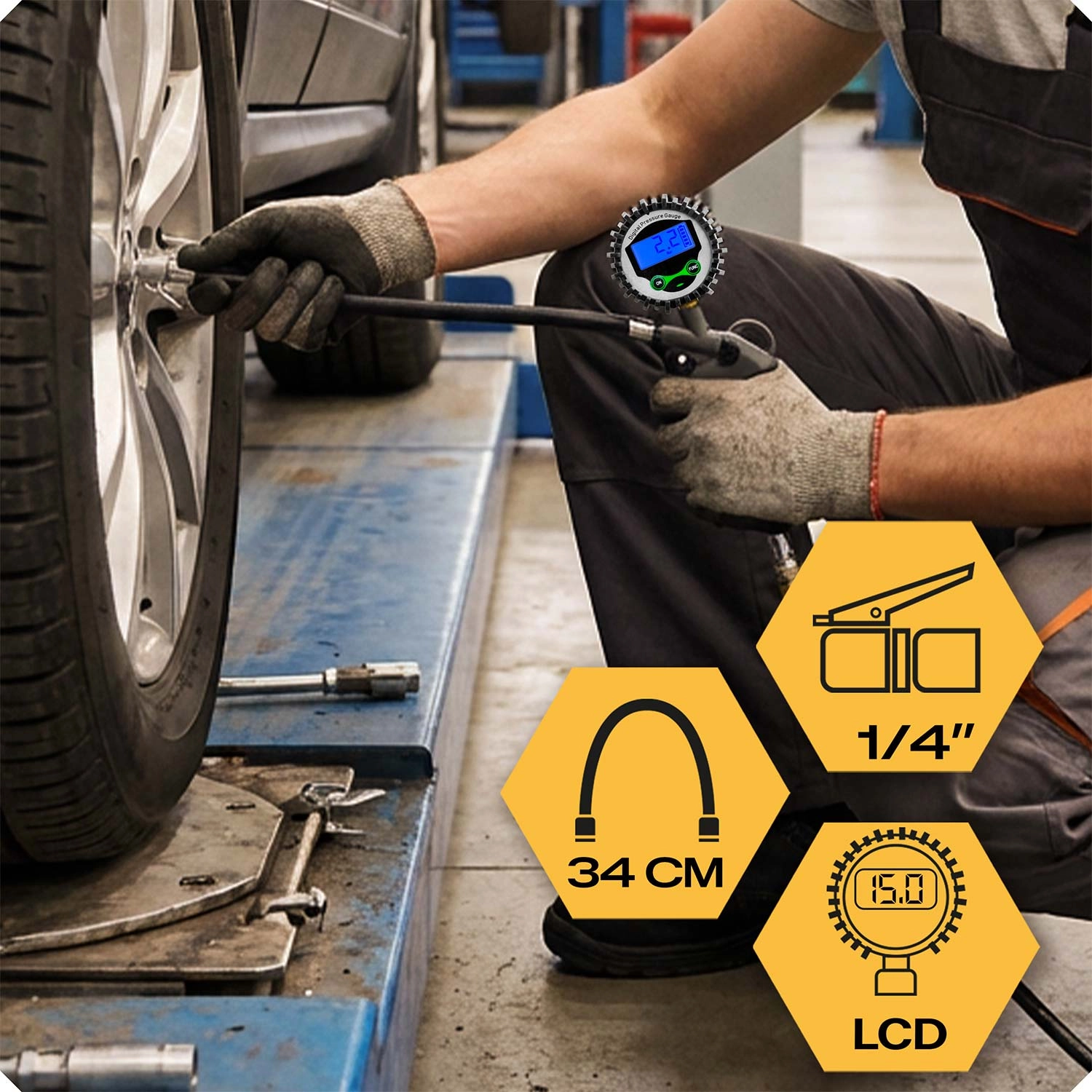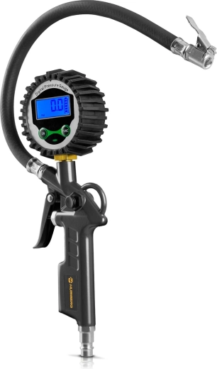 Ohebná hadice o délce 34 cm zvyšuje komfort práce a standardní 1/4" přípojka zaručuje širokou kompatibilitu s dílenskými i domácími kompresory. Odolné gumové lemování manometru chrání přístroj před nárazy, takže je ideální do garáže, servisu i na cesty.