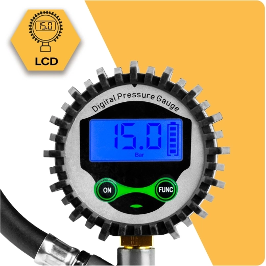 Jasný a čitelný displej zobrazuje aktuální tlak s vysokou přesností i v horších světelných podmínkách. Přepínání jednotek (bar/psi/kPa/kg/cm²) jedním tlačítkem.