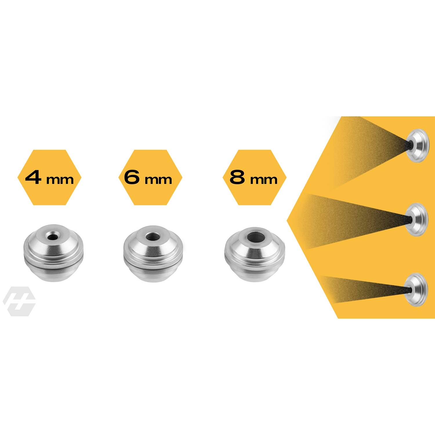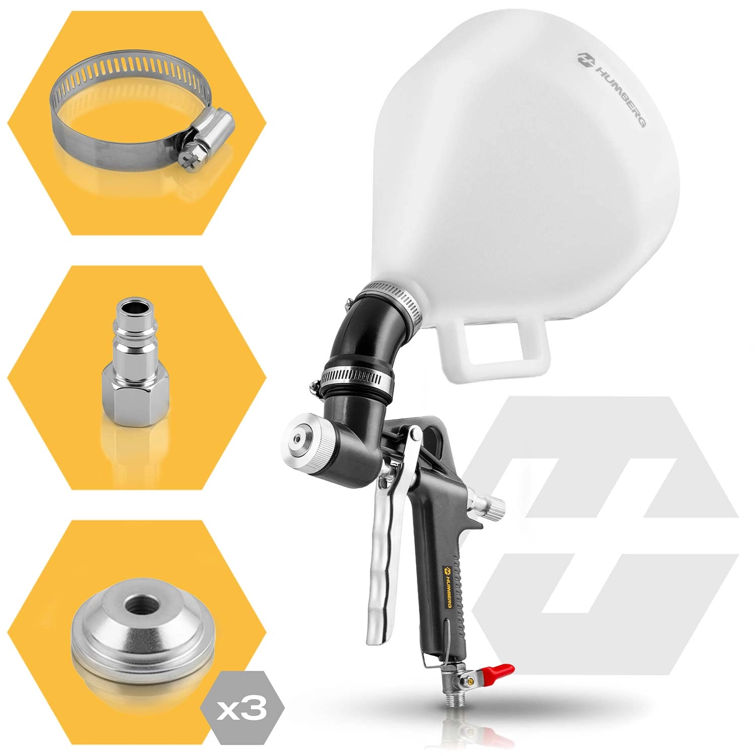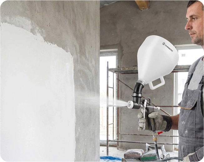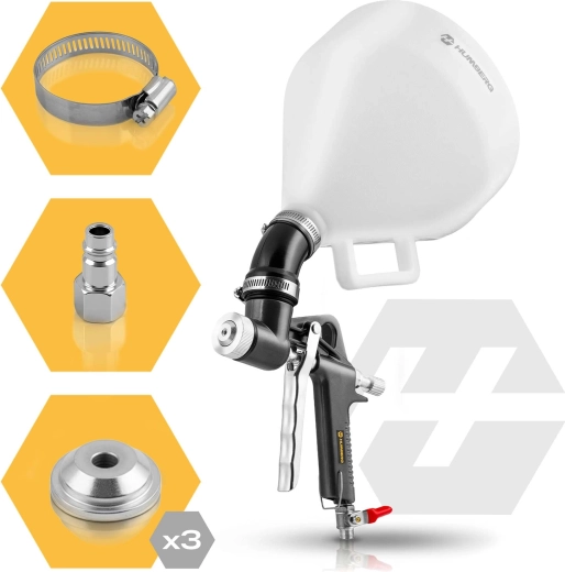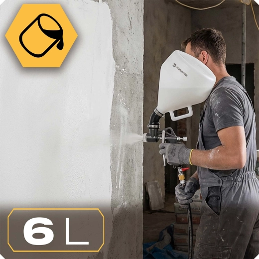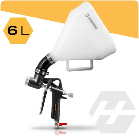 Pneumatická pistole HUMBERG je univerzální nástroj pro nanášení tenkovrstvých i strukturovaných omítek, stěrek a dekorativních směsí. Díky velké nádobě 6 l pracujete plynule bez častého doplňování, zatímco volba ze 3 vyměnitelných trysek umožní přesně přizpůsobit průtok hustotě materiálu a požadovanému efektu.