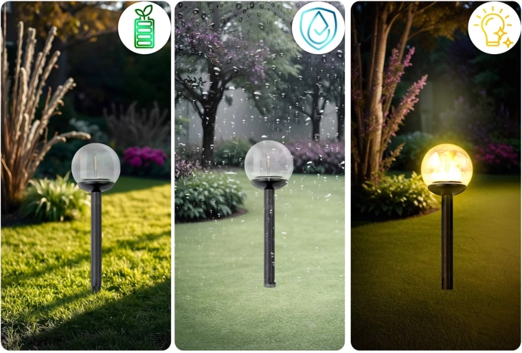 Amorfní panely jsou účinné i při slabším světle, takže lampy dobíjejí energii i za zatažených dnů. Integrovaný světelný senzor se postará o automatické rozsvícení po setmění, zatímco voděodolnost IPX4 chrání před stříkající vodou a deštěm. Přepínač ON/OFF umožní snadné sezónní vypnutí.