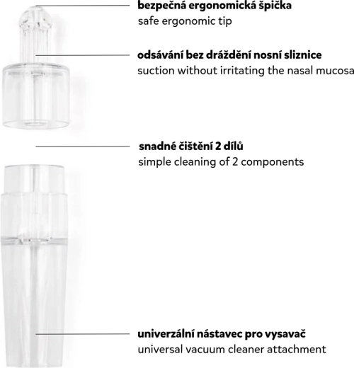 Průhledný nástavec a stabilní podtlak pomáhají rychle uvolnit nosní dutiny bez podráždění sliznice – vhodné již od narození.
