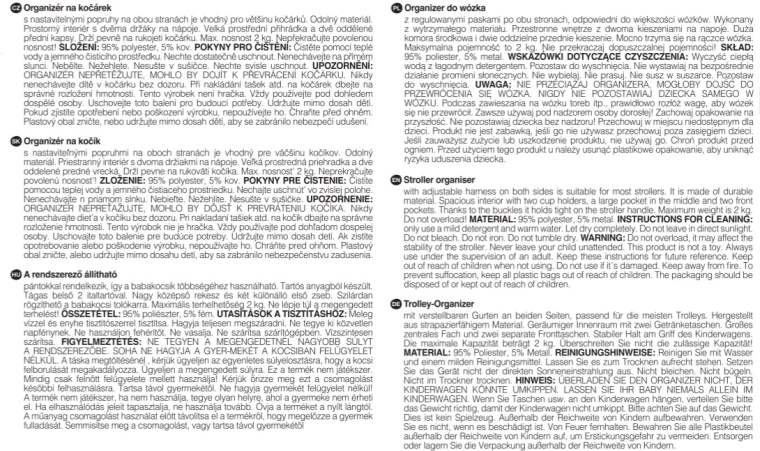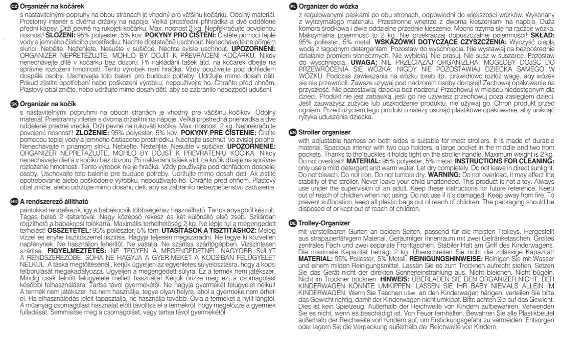 Udělejte pořádek na cestách s chytrým organizérem na zadní stranu sedadla. Lehký a odolný materiál z 100% polyesteru zajišťuje snadnou údržbu, zatímco promyšlené kapsy udrží vše potřebné přehledně uspořádané – od láhví a hrnečků po hračky či kapesníky. Instaluje se během chvilky pomocí nastavitelných popruhů.