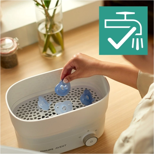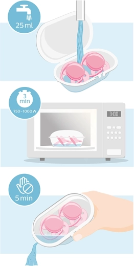 - Hygiena bez starostí: sterilizační pouzdro do mikrovlnky funguje rychle a pohodlně; šidítko lze také vyvařit či sterilizovat v parním sterilizátoru.