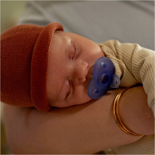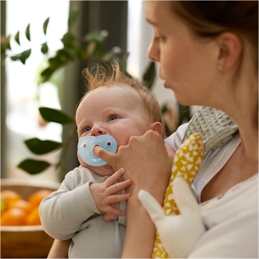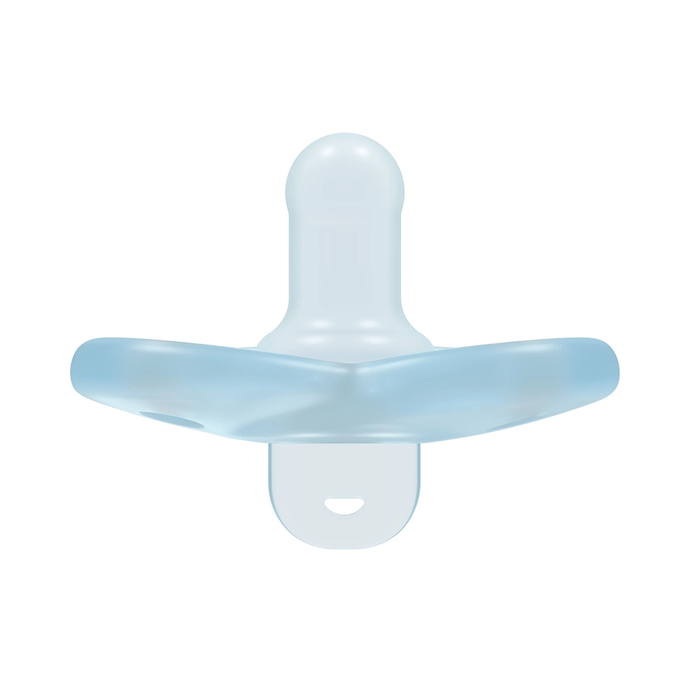 Ergonomický štítek ve tvaru srdce respektuje přirozené křivky obličeje dítěte a zajišťuje volné dýchání. Symetrická, kulatá savička je měkká, odolná a navržená tak, aby přirozeně seděla v ústech miminka a pomáhala rovnoměrně rozložit tlak jazyka.