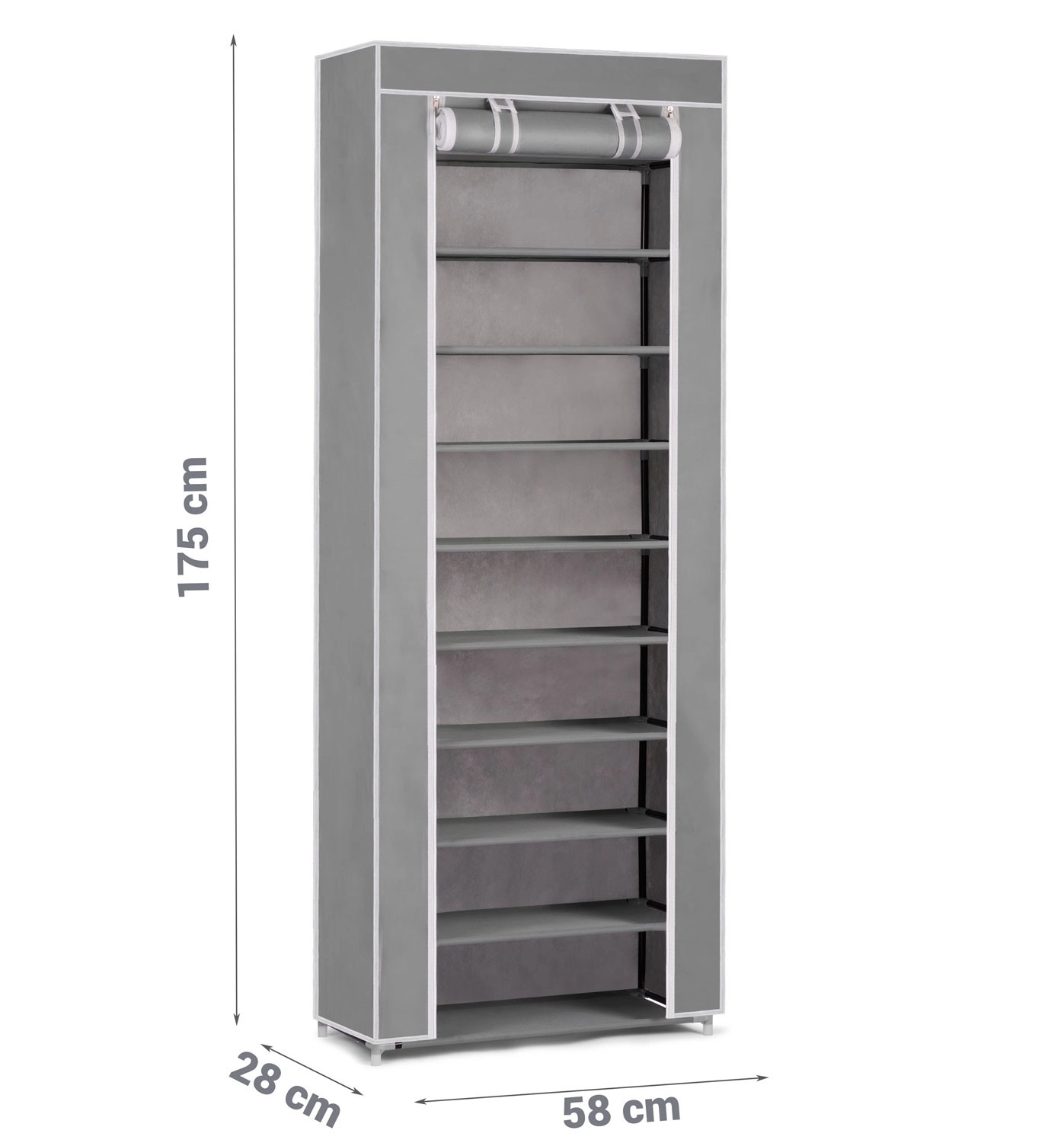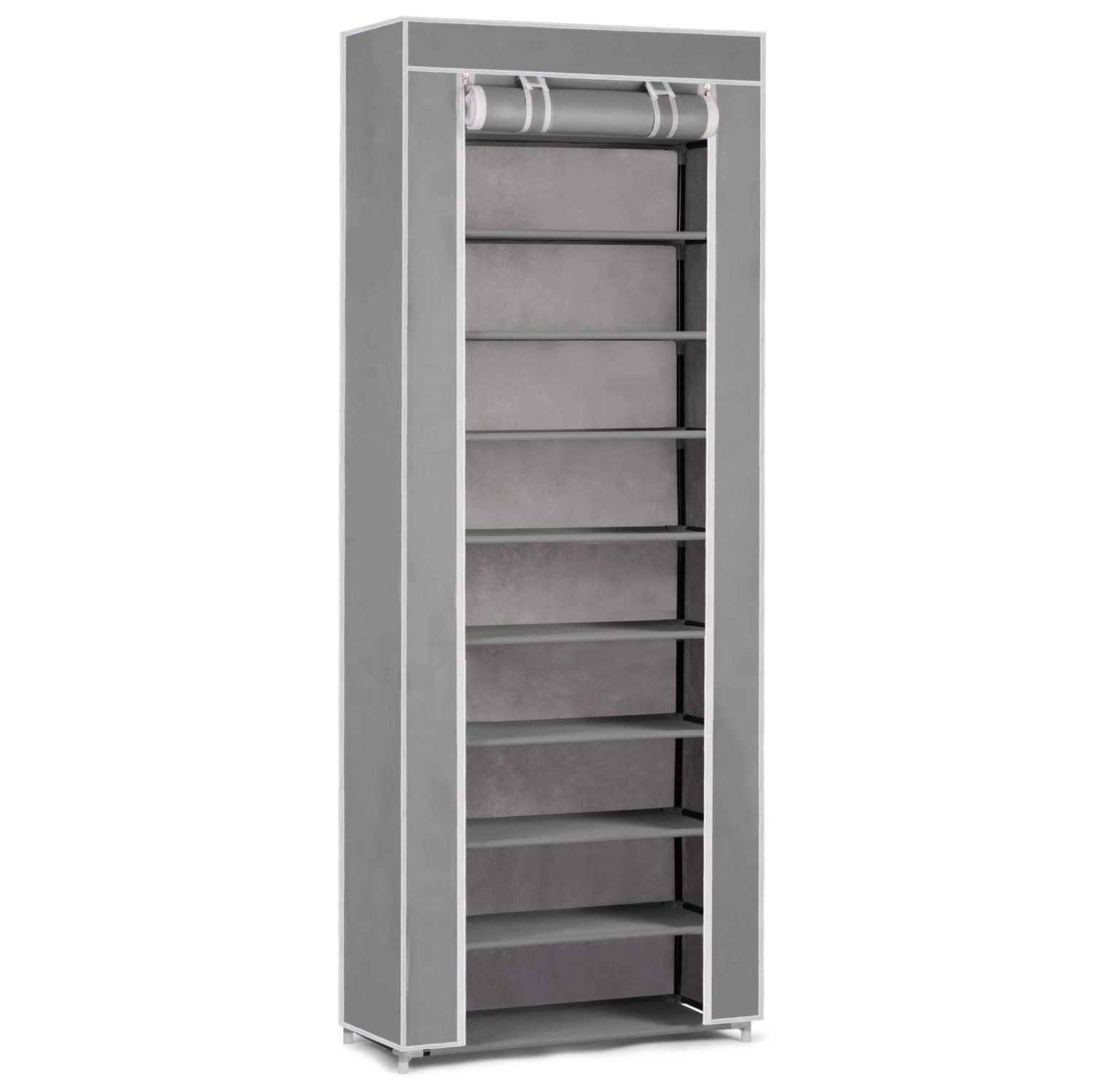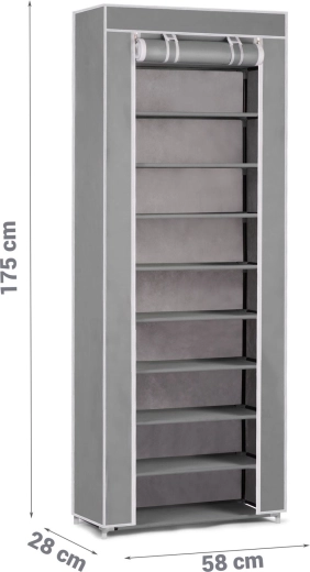 Praktický textilní botník Massido v šedé barvě udrží vaši obuv přehledně a v suchu. Má 10 pevných polic, stabilní ocelovou konstrukci a uzavírání na zip, které chrání před prachem a vlhkostí. Díky úzkému profilu se vejde i do menších předsíní a rychlá, intuitivní montáž zvládne každý.