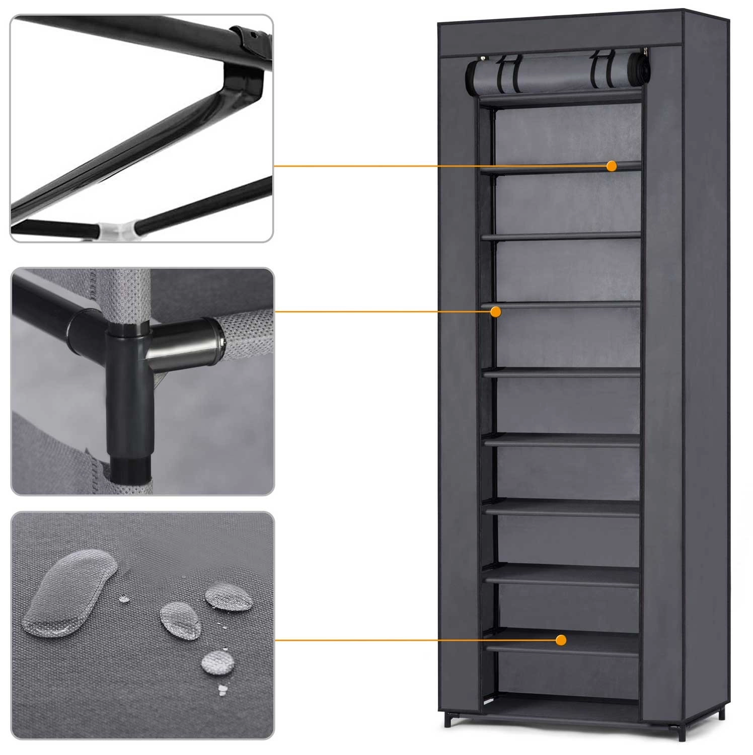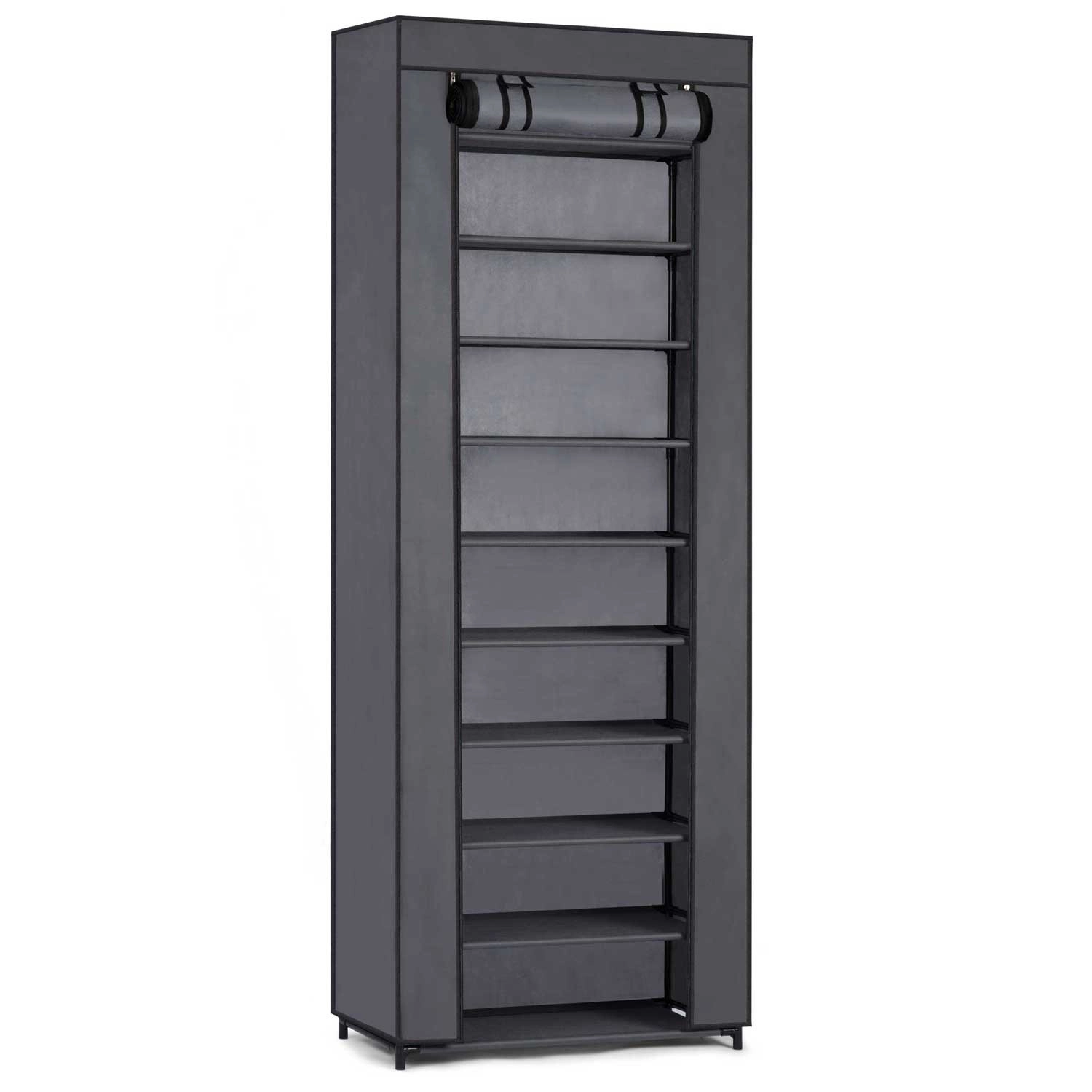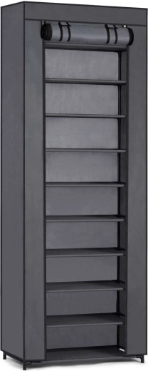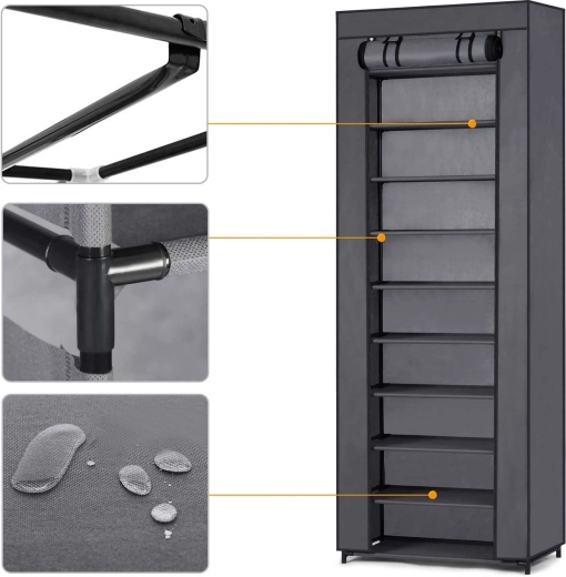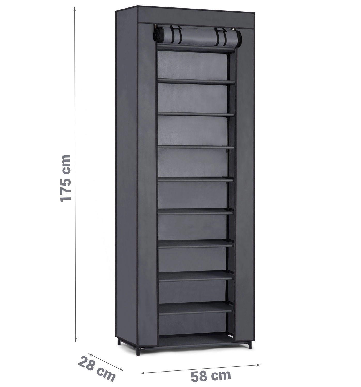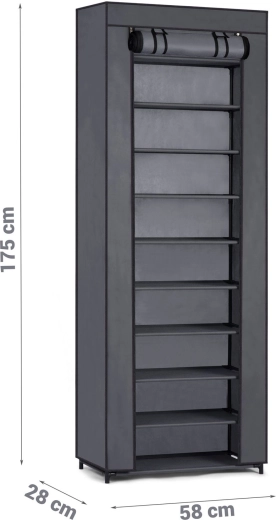 Praktický a odolný textilní botník Massido v grafitové barvě nabízí 10 pevných polic, stabilní ocelovou konstrukci a uzavírání na zip. Díky snadné a rychlé montáži se hodí do předsíně, šatny i komory a udrží vaše obuv přehledně uspořádanou a chráněnou před prachem.