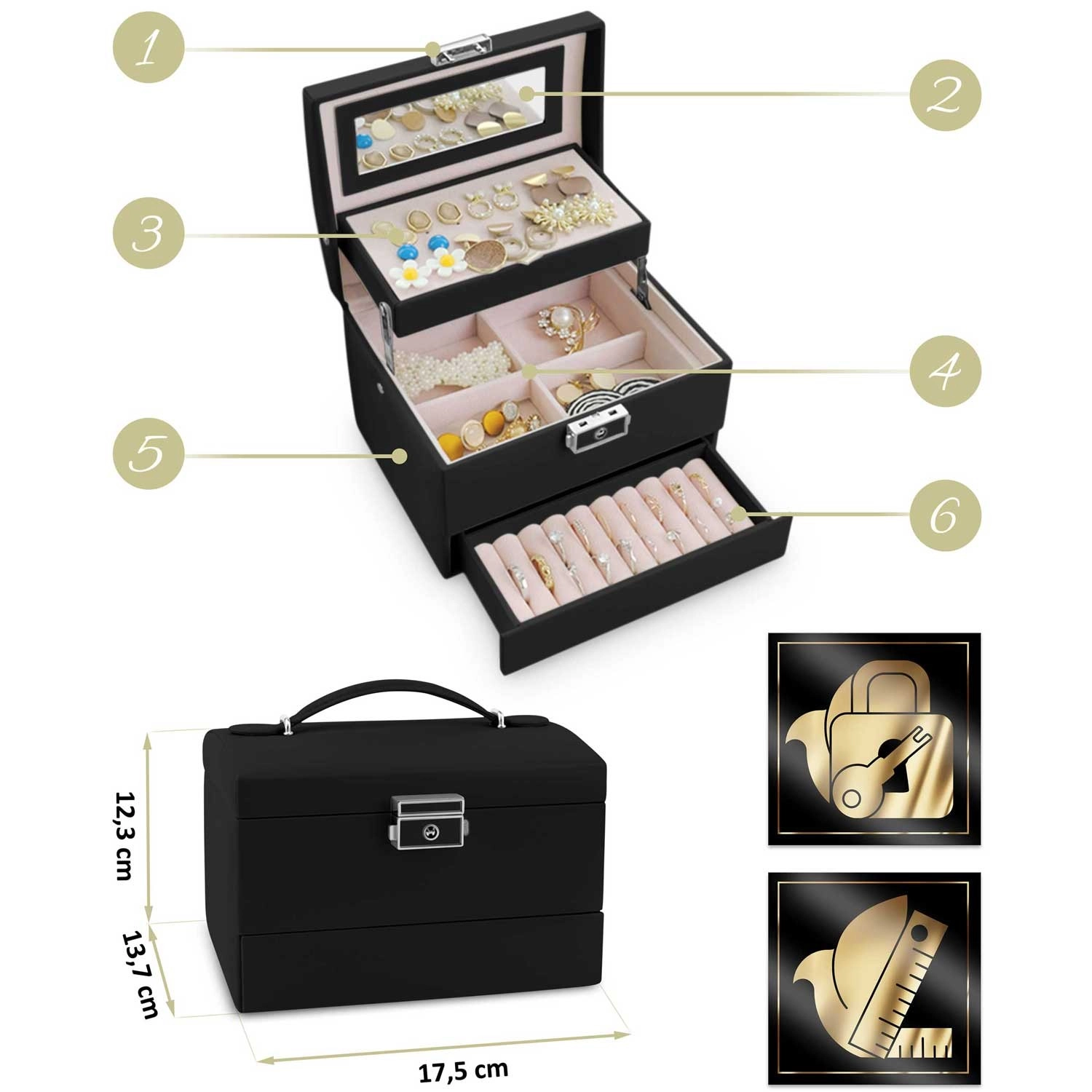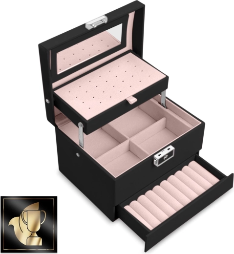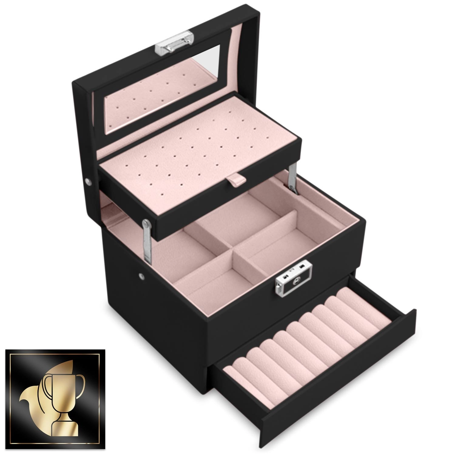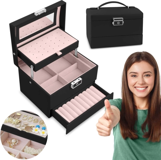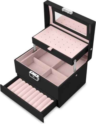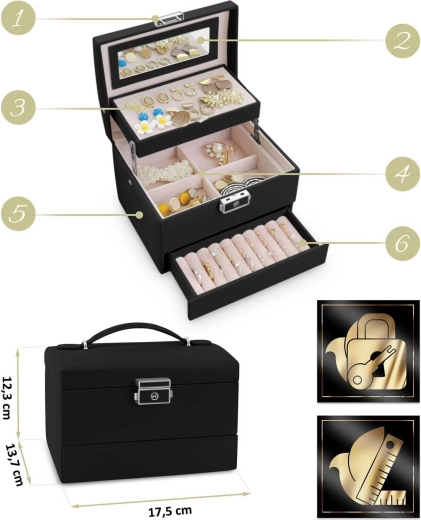 Tato černá šperkovnice je navržená pro dokonalý přehled a ochranu vaší kolekce. Víko se zrcátkem, vyjímatelný tác s otvory pro náušnice, dělené přihrádky a samostatný šuplík s válci na prsteny zajistí, že každý šperk bude mít své místo. Uzamykatelný zámek a kompaktní tvar z ní dělají ideální volbu na doma i na cesty.
