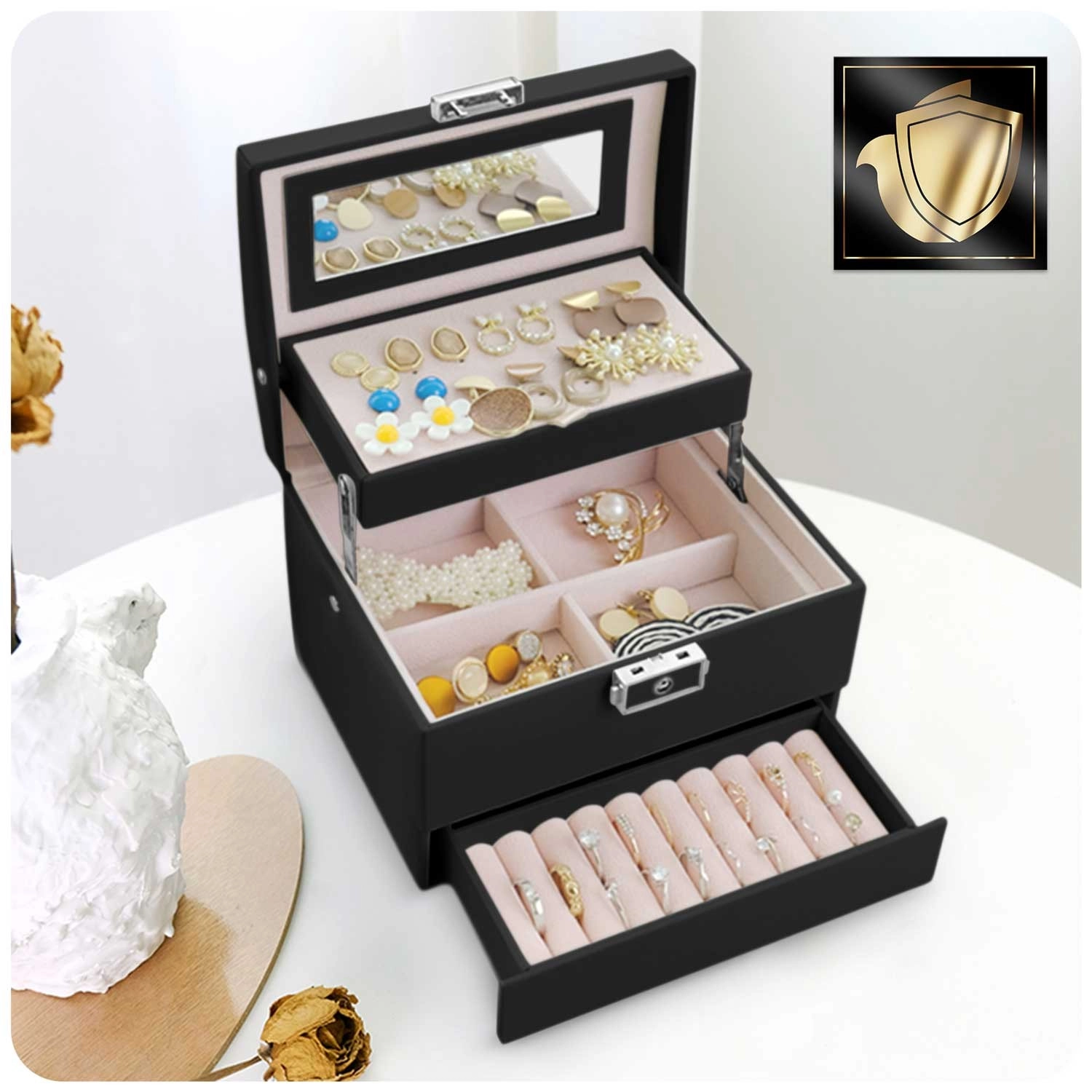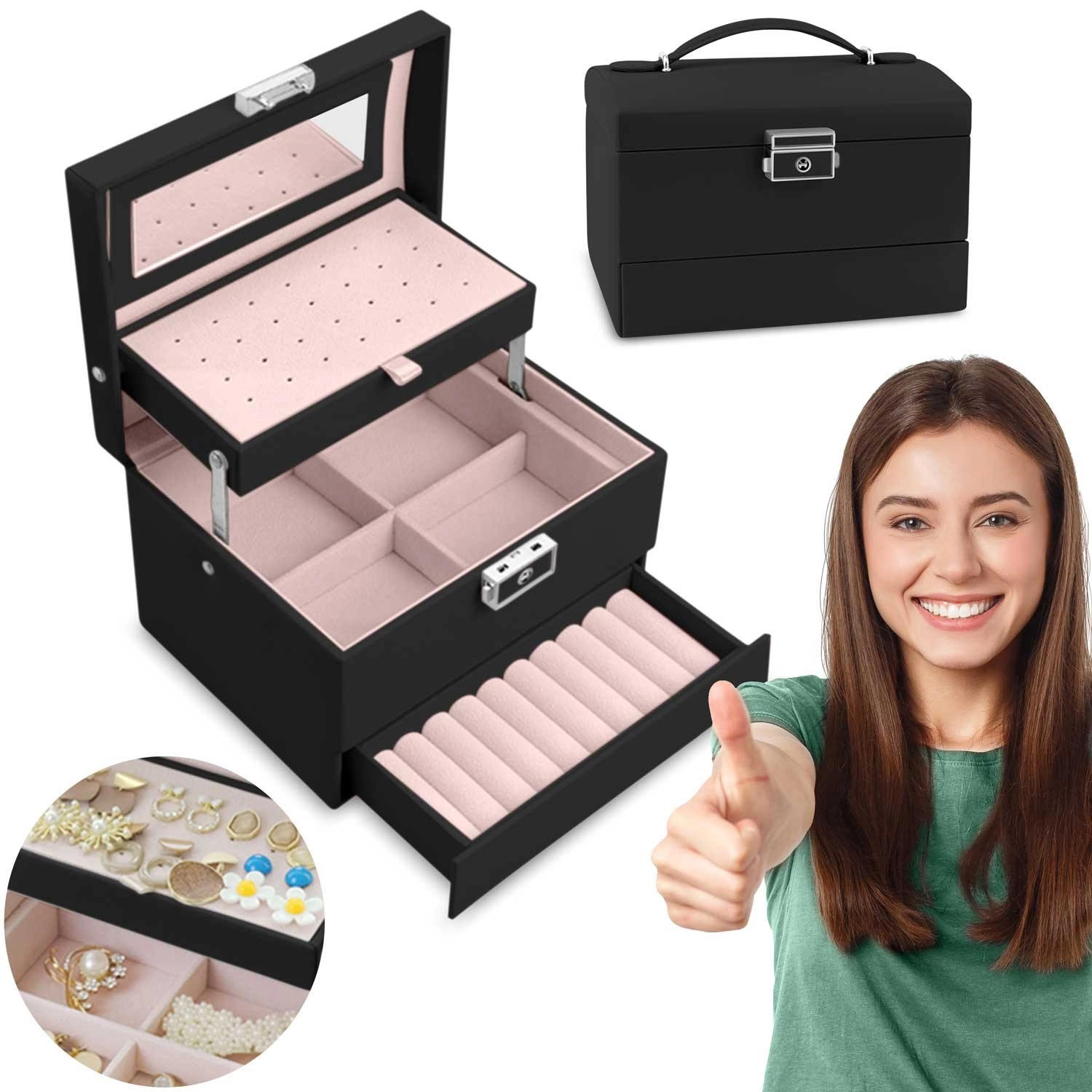 Elegantní šperkovnice s víceúrovňovým uspořádáním, zrcátkem a uzamykatelným kovovým zámkem bezpečně uchová vaše prsteny, náušnice i náramky. Kompaktní rozměry, praktická rukojeť pro snadné přenášení a měkké růžové polstrování chrání šperky před poškozením. Vysoce odolná eko kůže PU a pečlivé zpracování dodávají prémiový vzhled i dlouhou životnost.