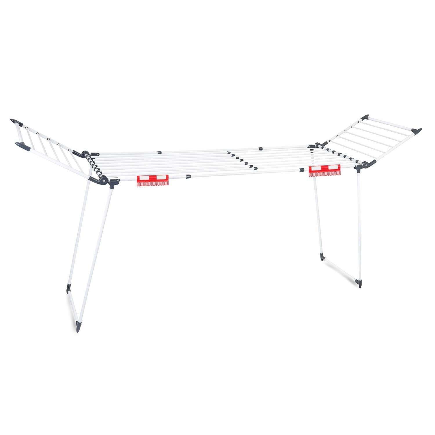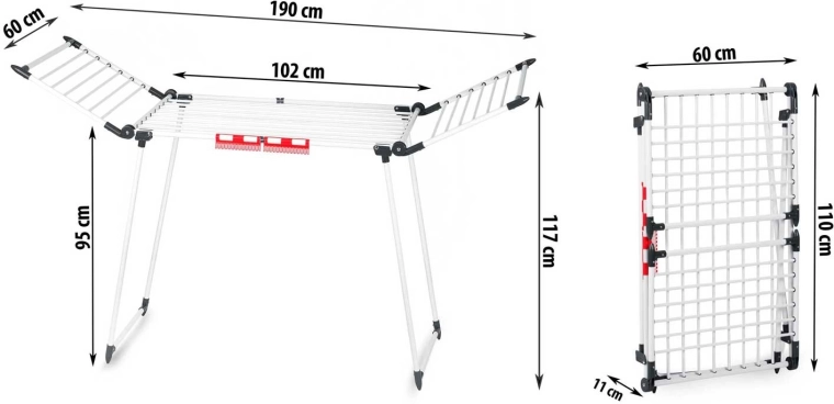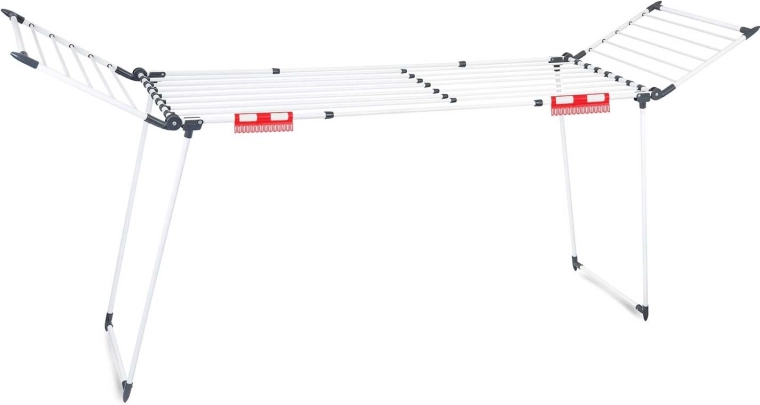 Praktický stojanový sušák na prádlo s teleskopickými křídly nabízí až 27 m sušící plochy, pevnou konstrukci a protiskluzové nožky. Díky rychlému skládání a kompaktním rozměrům jej snadno uložíte. Nechybí držáky na drobnou bielizeň a silnější příčky, které pomáhají omezit mačkání prádla.