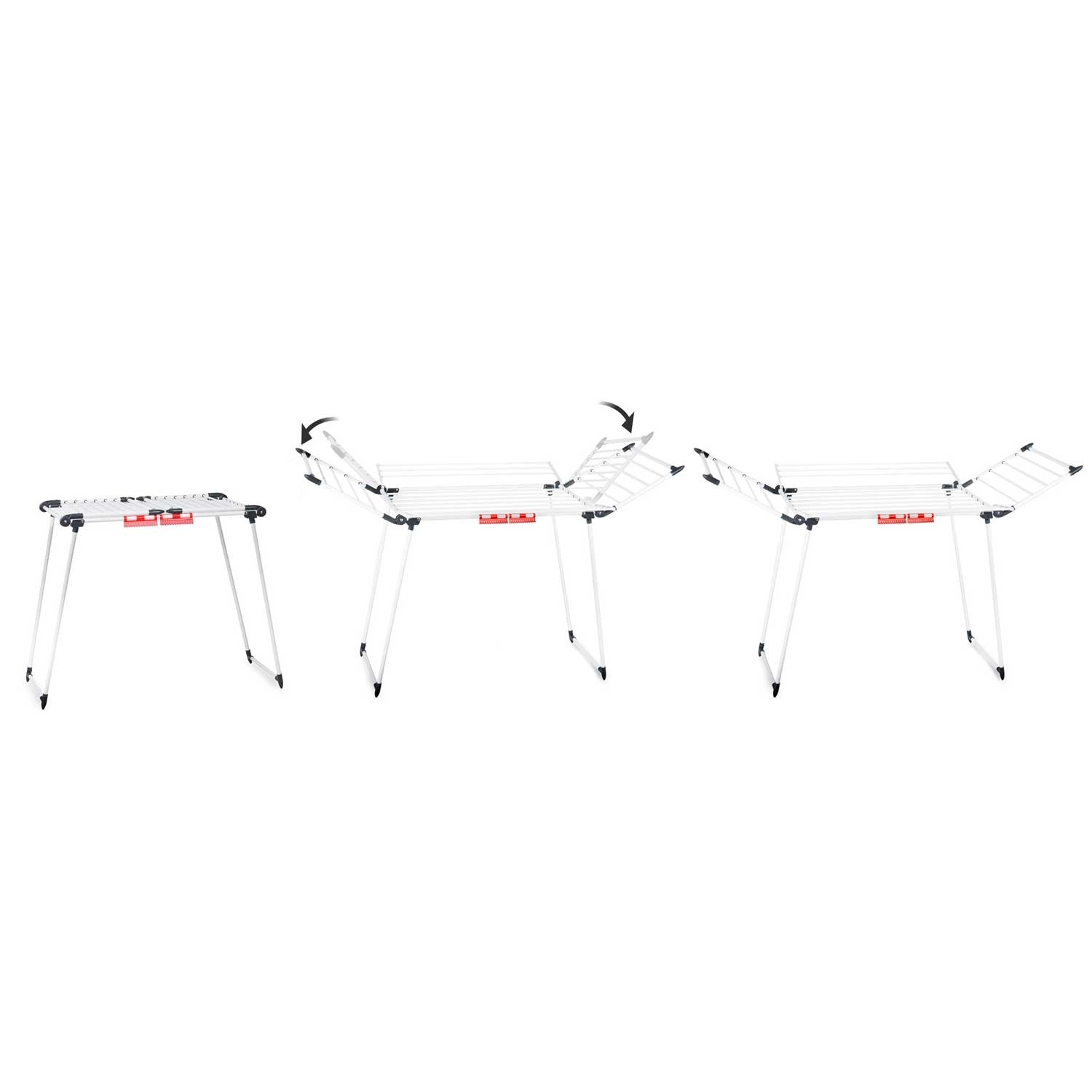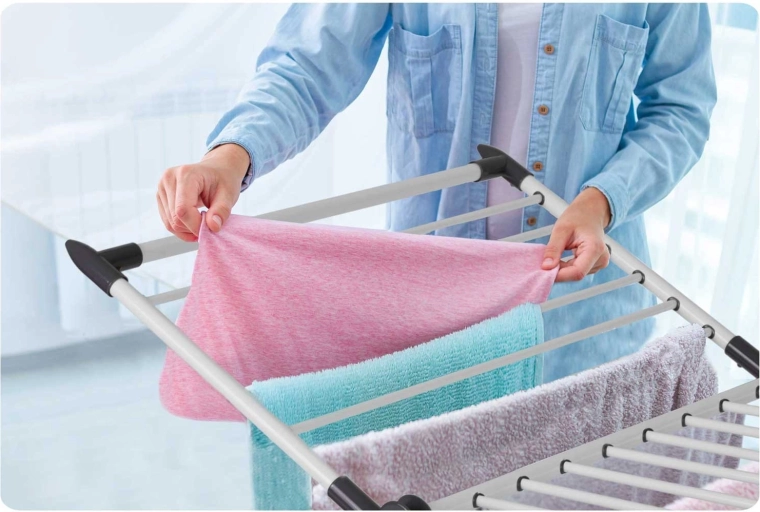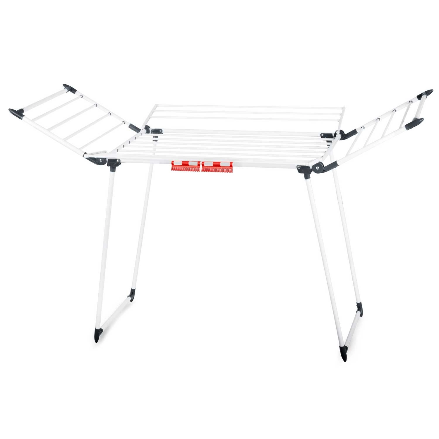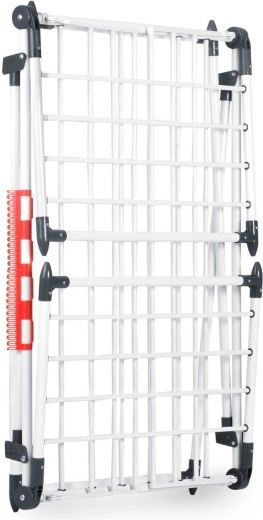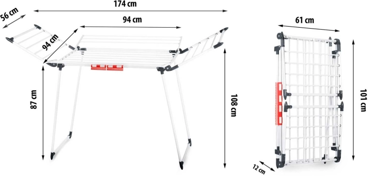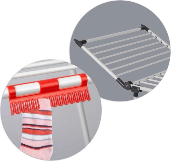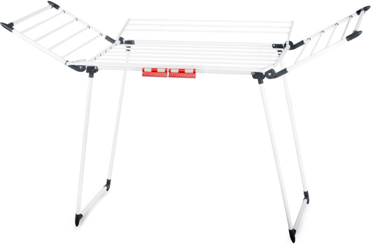 4 rozkládací křídla rozšíří sušicí plochu přesně tehdy, když ji potřebujete, zatímco speciální úchyty na spodní i drobné prádlo šetří místo na hlavních příčkách. Silné tyče navíc pomáhají omezit mačkání, takže oblečení často není potřeba ani žehlit.