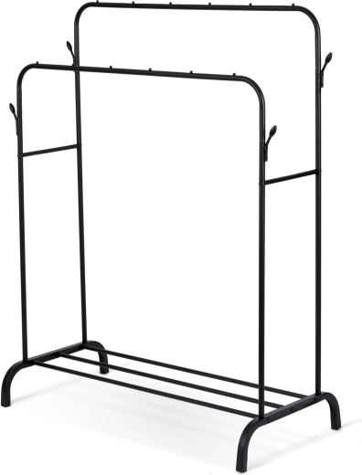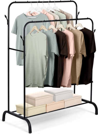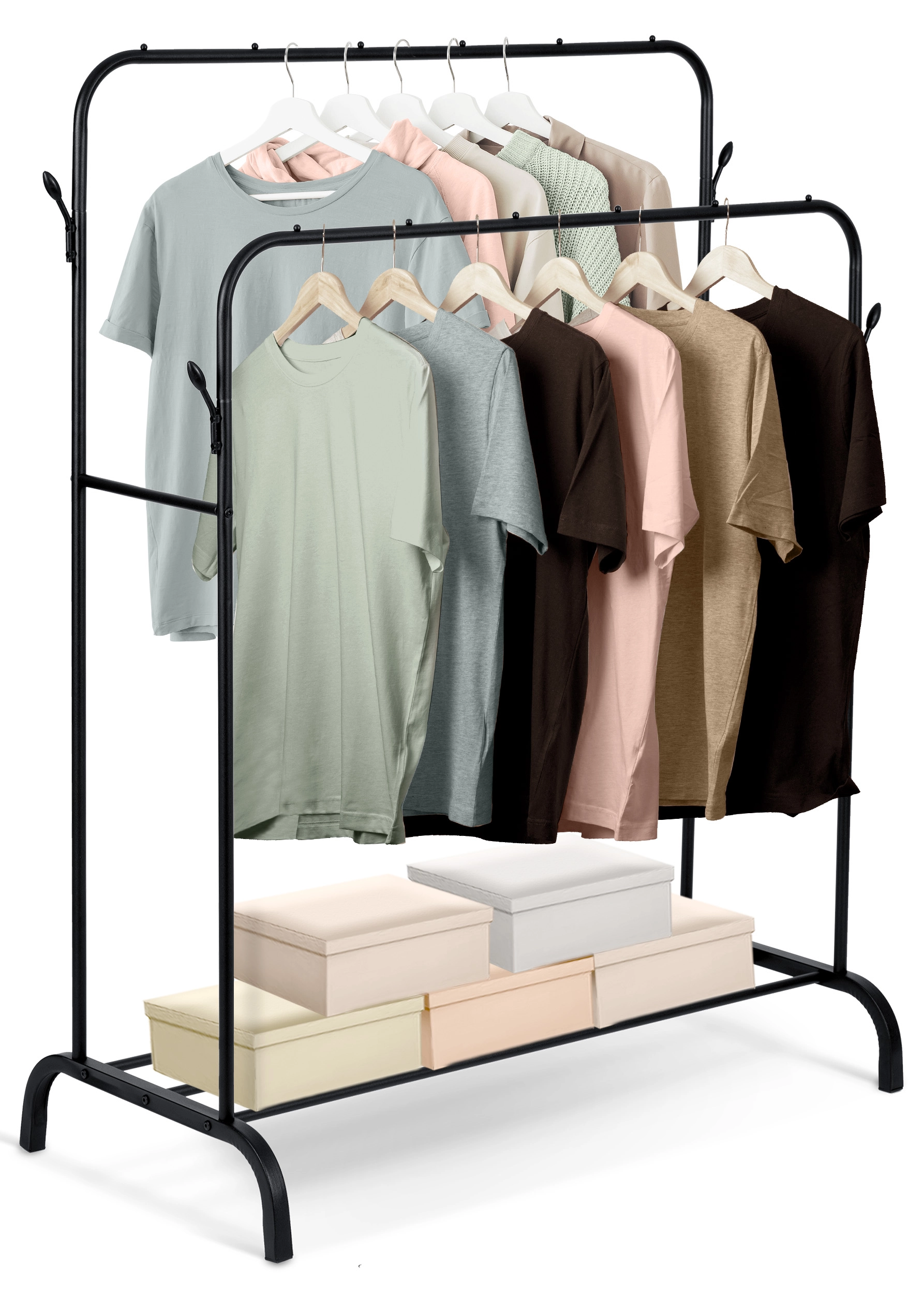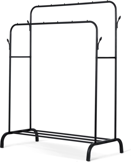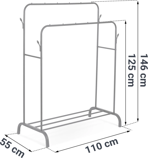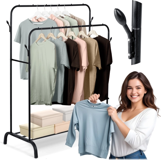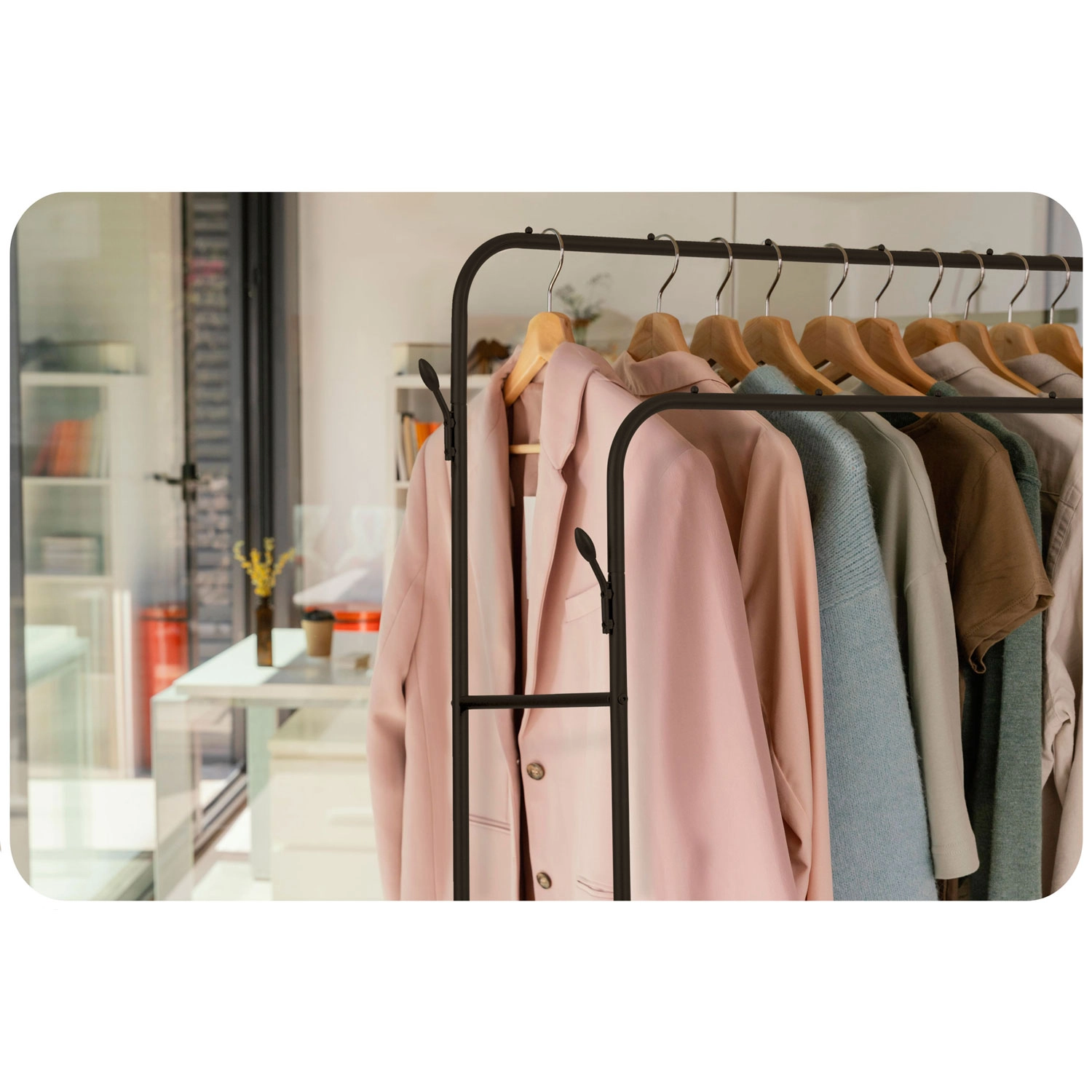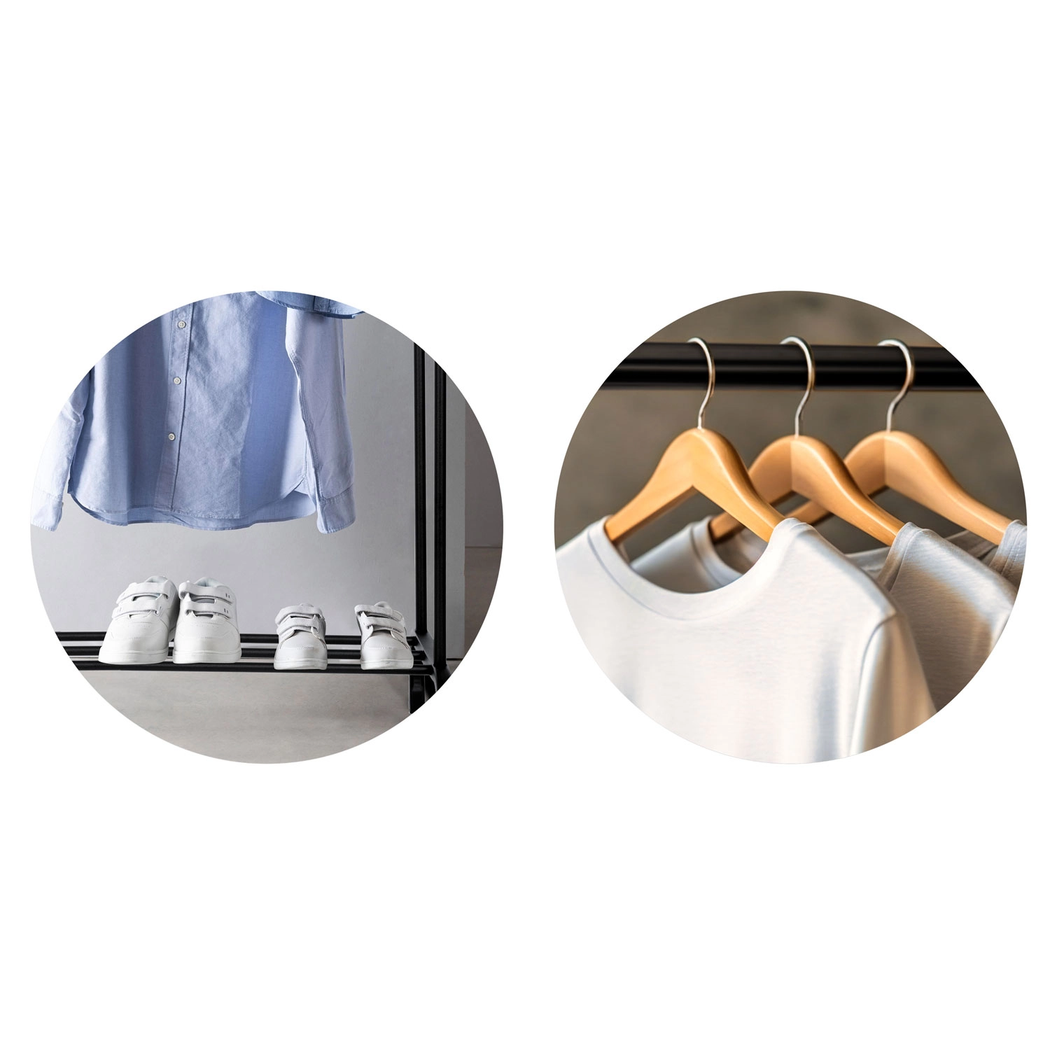 Stojanový věšák MASSIDO je promyšlené řešení pro rychlou organizaci oděvů a doplňků doma i v kanceláři. Dvě tyče poskytují více úložného prostoru na košile, kabáty či dětské oblečení, zatímco spodní police pojme boty nebo úložné boxy. Boční háčky jsou ideální na kabelky, šály, opasky či kravaty. Omezovače na tyčích pomáhají udržet ramínka odděleně a zamezují nepořádku.