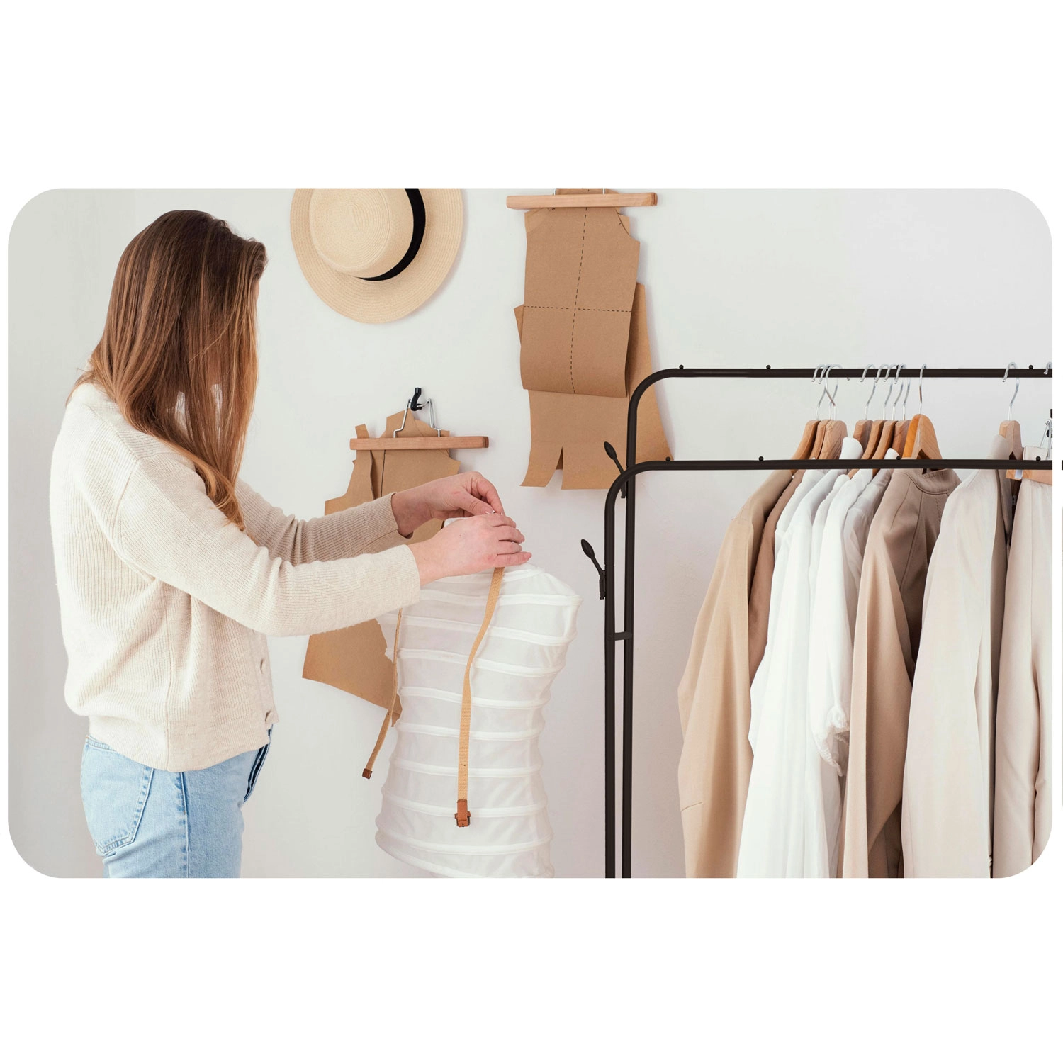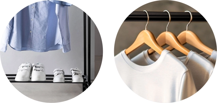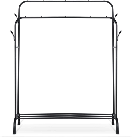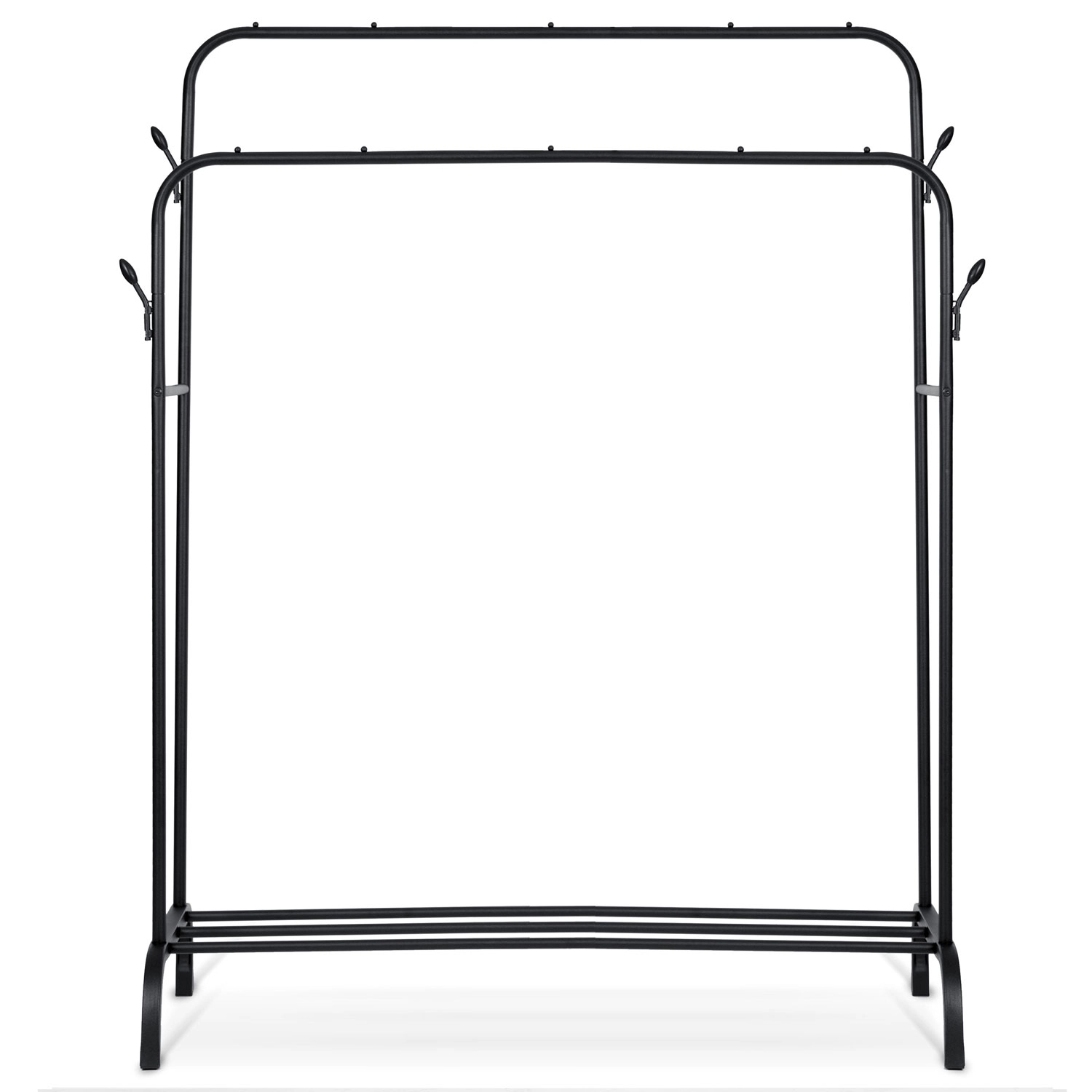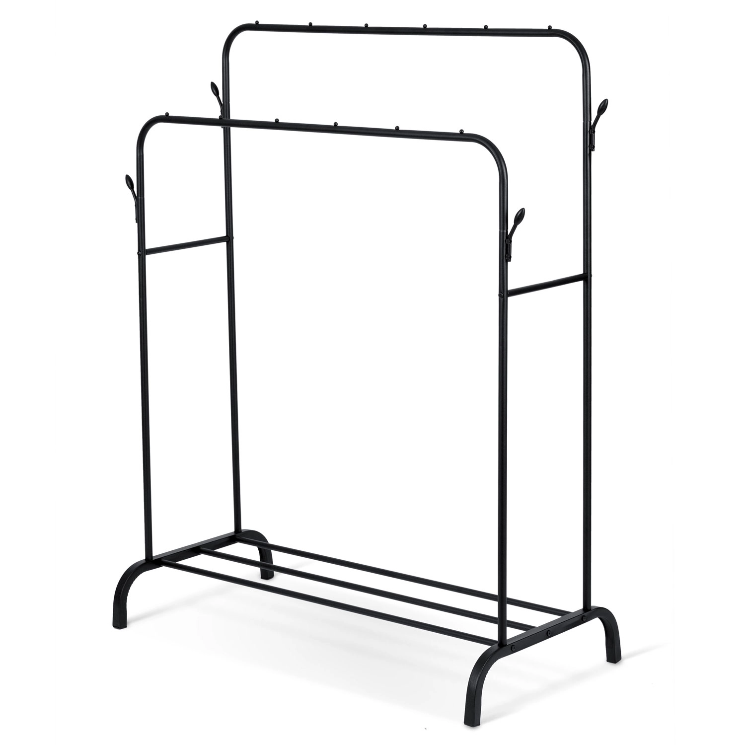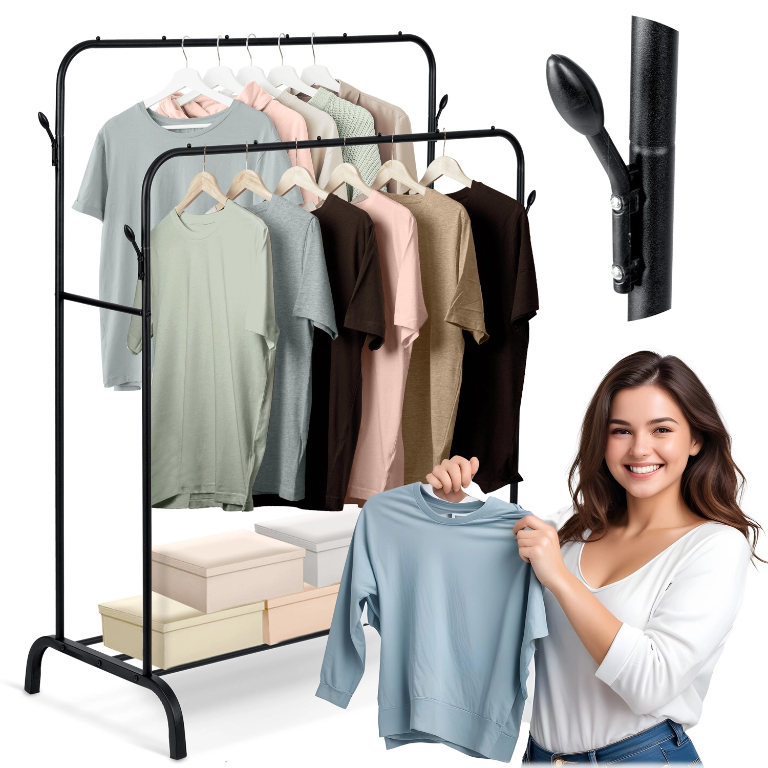 Stojanový věšák MASSIDO je promyšlené řešení pro rychlou organizaci oděvů a doplňků doma i v kanceláři. Dvě tyče poskytují více úložného prostoru na košile, kabáty či dětské oblečení, zatímco spodní police pojme boty nebo úložné boxy. Boční háčky jsou ideální na kabelky, šály, opasky či kravaty. Omezovače na tyčích pomáhají udržet ramínka odděleně a zamezují nepořádku.
