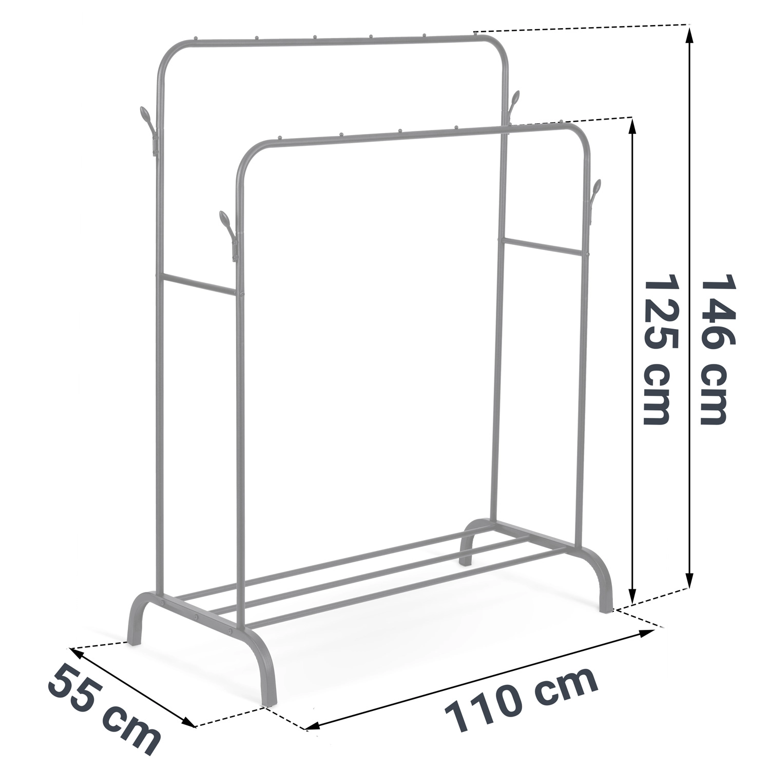 Udělejte pořádek v předsíni i šatně s tímto lehkým, ale stabilním stojanovým věšákem MASSIDO. Díky dvojité závěsné tyči, spodní polici na boty a bočním háčkům snadno uspořádáte kabáty, bundy, kabelky i šály. Pevná ocelová konstrukce s práškovým lakem zajišťuje odolnost v každodenním provozu a otevřený, minimalistický design se krásně hodí do moderních interiérů.