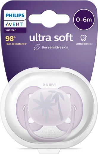 Philips Avent UltraSoft Premium je navržen pro citlivou dětskou pokožku. Jedinečný měkký, pružný a zaoblený kotouč s ventilačními otvory snižuje tlak na tváře a zajišťuje maximální pohodlí. Ortodontický, symetrický silikonový sosák napomáhá zdravému vývoji dásní, zubů a patra a jeho texturovaný povrch připomíná přirozené sání.
